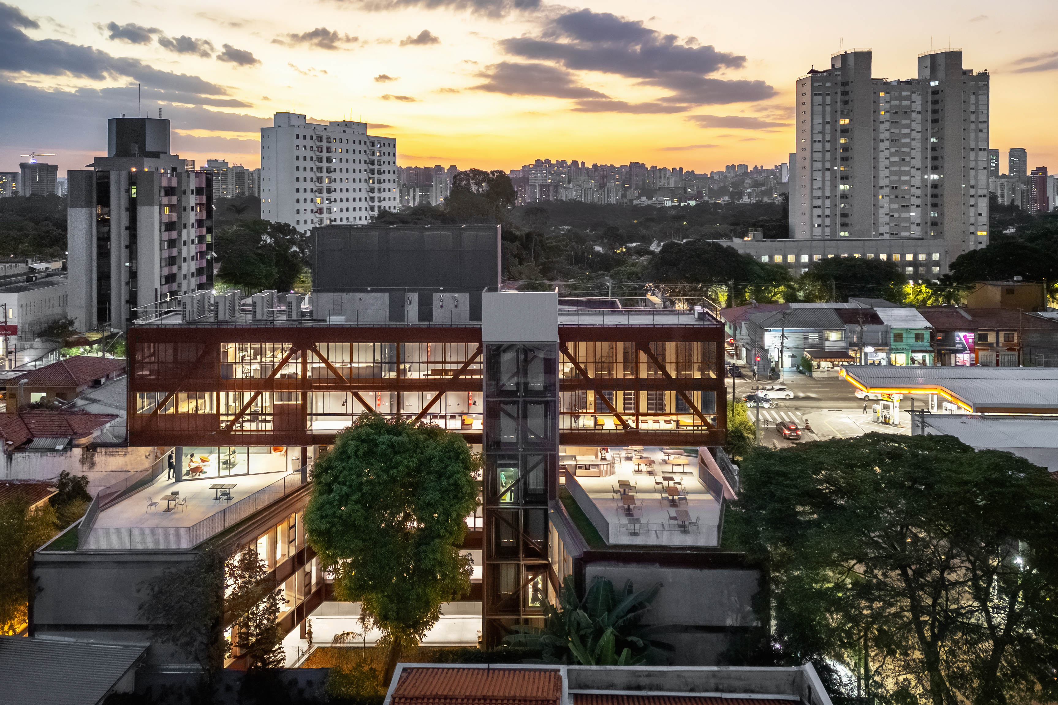 Second, symbolically, with the visual application of the organic patterns of wood seen on a microscopic scale on the metallic surfaces of the cladding and shading devices. "It's a reference to wood without using the material, " highlights architect Mario Biselli, managing partner of Biselli Katchborian.