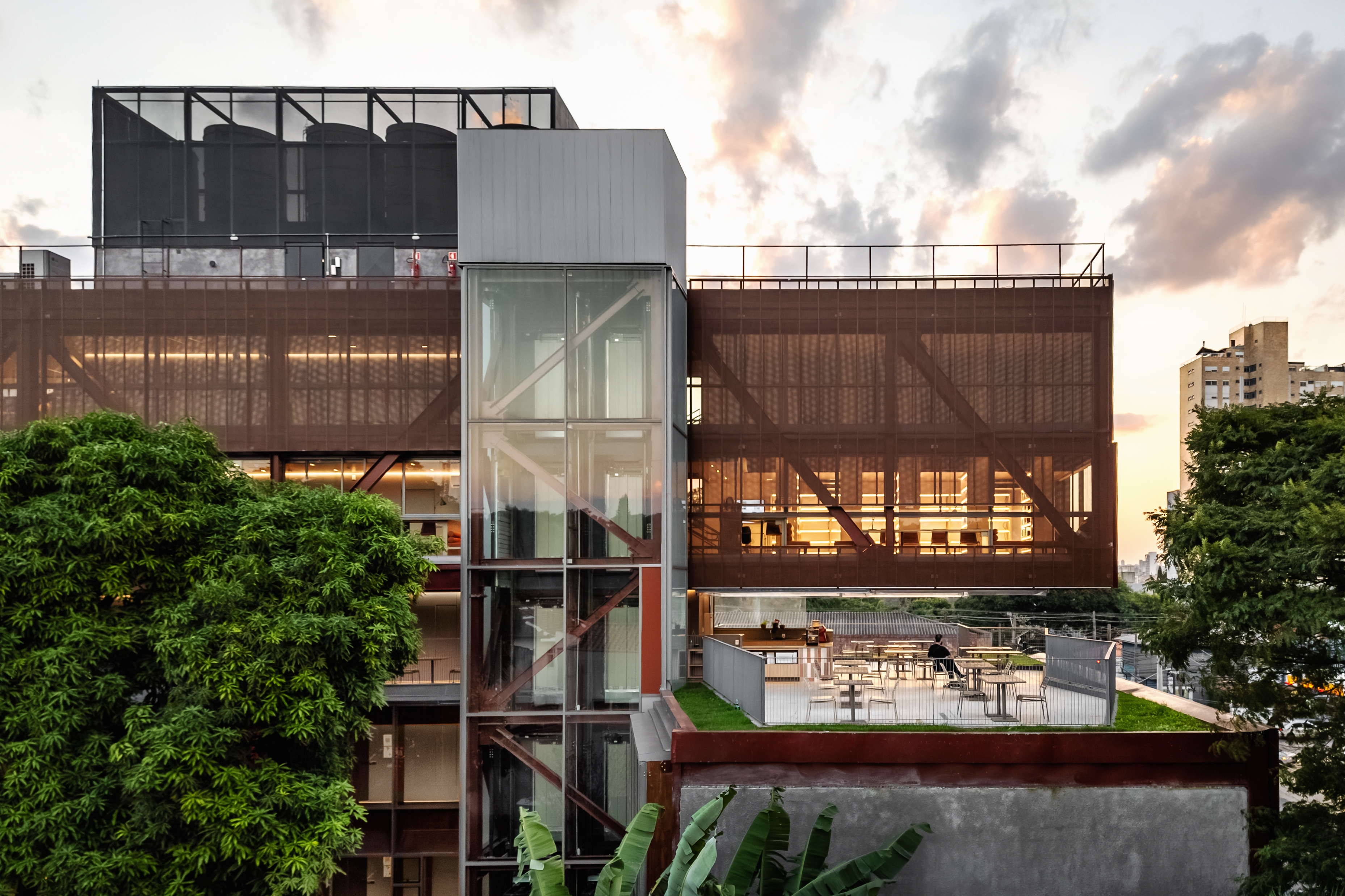 To connect the floors externally, two glass-enclosed panoramic elevators were installed in the central courtyard, offering views of the mango tree and the surroundings of the headquarters. On the rooftop, a suspended block was implemented to house administrative uses, and the library was installed in the highest position of the building, like a lighthouse, as an allegory of the importance and commitment to the pursuit of knowledge.