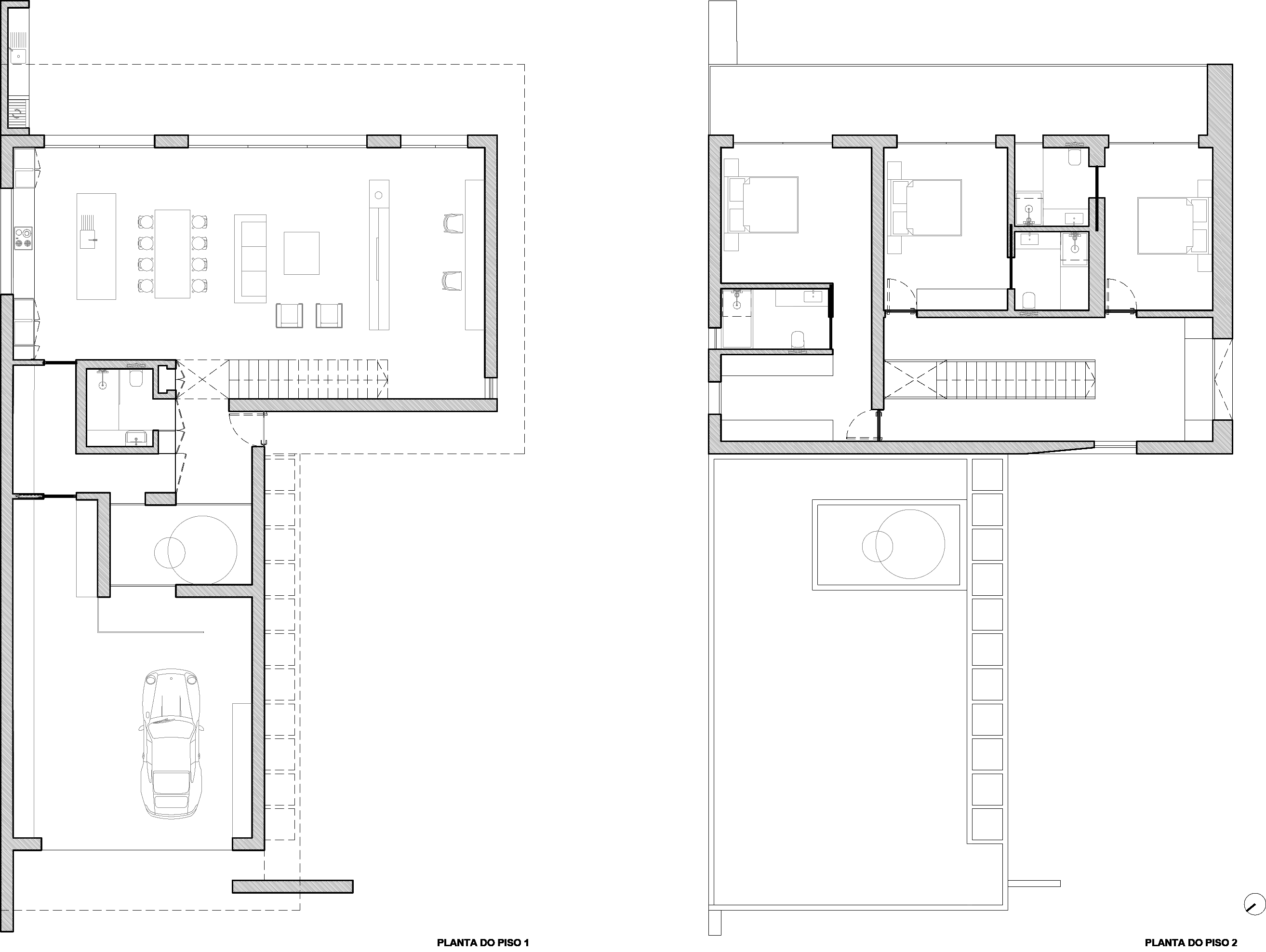 As for the house's layout, the interior spatial distribution is separated by function and floors. The social/service area on the ground floor consists of the garage and laundry room, separated by an exterior patio facing the entrance hall, a service bathroom, an open space with kitchen, dining room, and living room, and also an office.