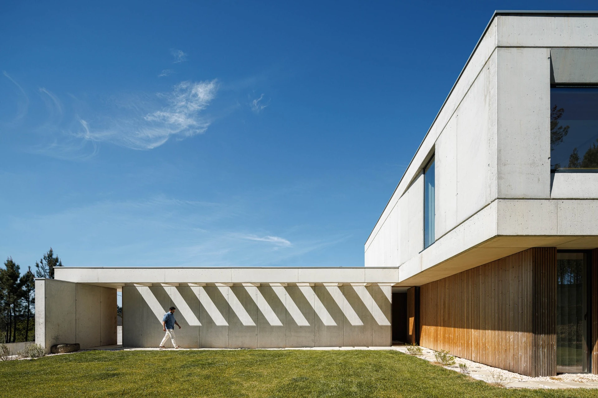 Regarding materials, the house was built using a combination of elements that provide solidity, coziness, durability, and a timeless design. The main material used is reinforced concrete, offering austere plasticity and ensuring its stability over time. The natural wood slats used both outside and inside create a cozy environment and integration with the surrounding landscape.