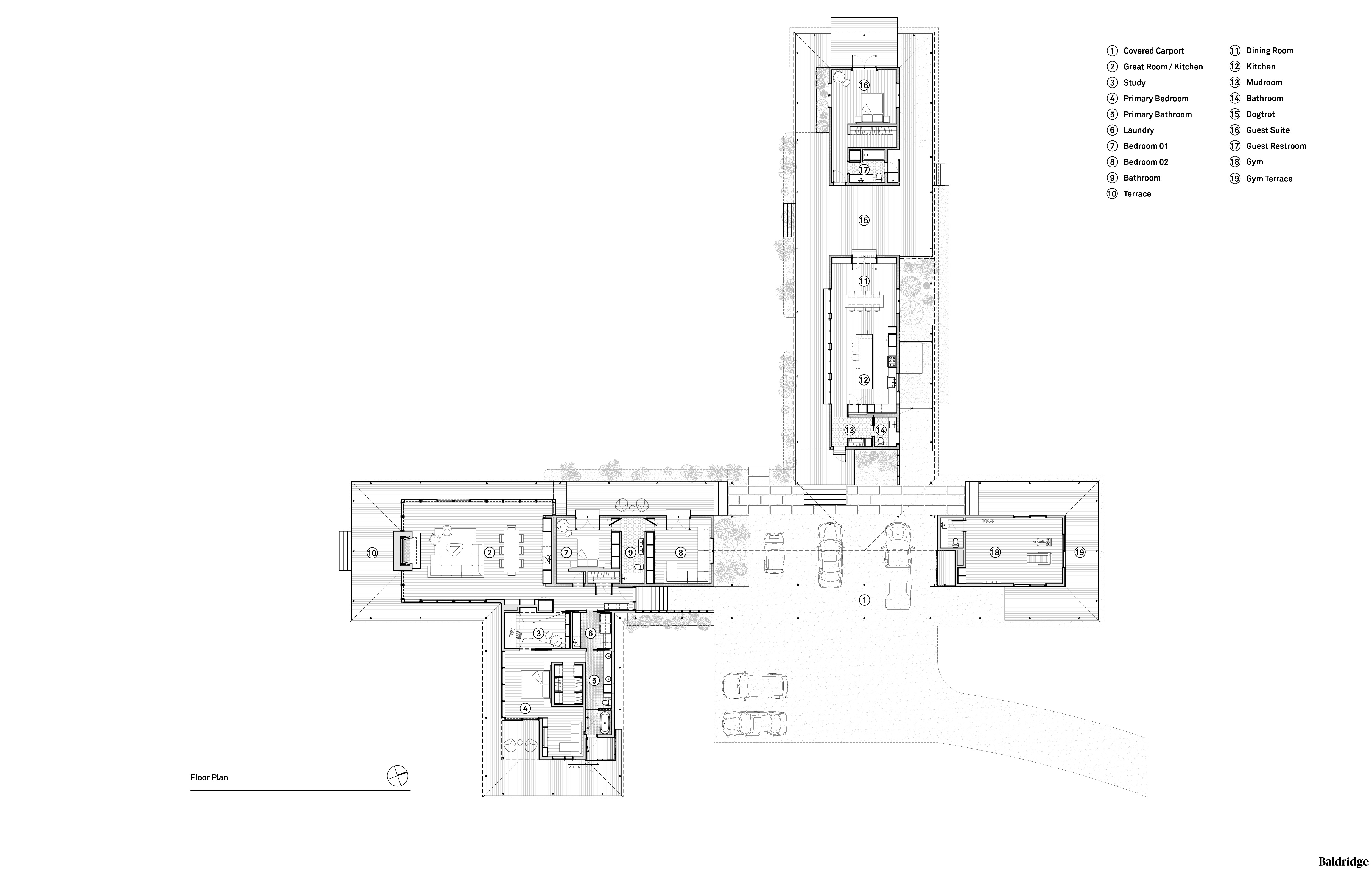 The clients were adamant that this new dwelling retain a true ranch feel, while accommodating certain modern flourishes and amenities. Above all, both wanted to retain the two buildings they had built on the property—a kitchen / dining structure and a detached single bedroom volume.