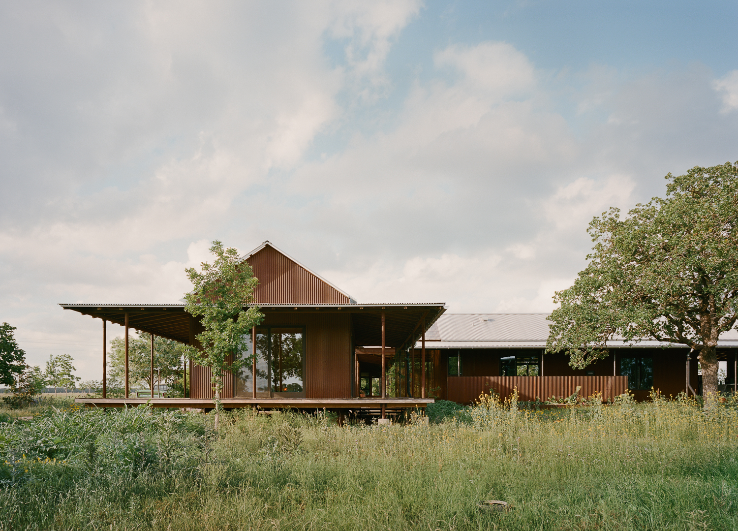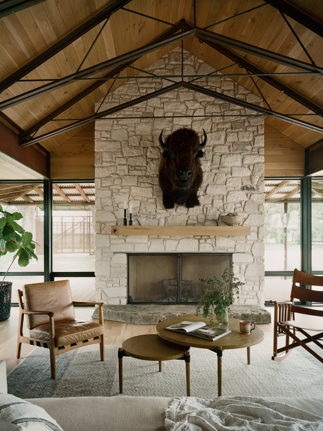 The clients had previously commissioned the firm for a stylistically modern Austin home. During the pandemic, the couple acknowledged that they were dissatisfied with city life and again commissioned the firm to design a new home on the ranch where they sustainably raise bison and turkeys under the name “Force of Nature.” Unlike their city house, this new home also needed to function for their business operations, including podcasts and educational events.