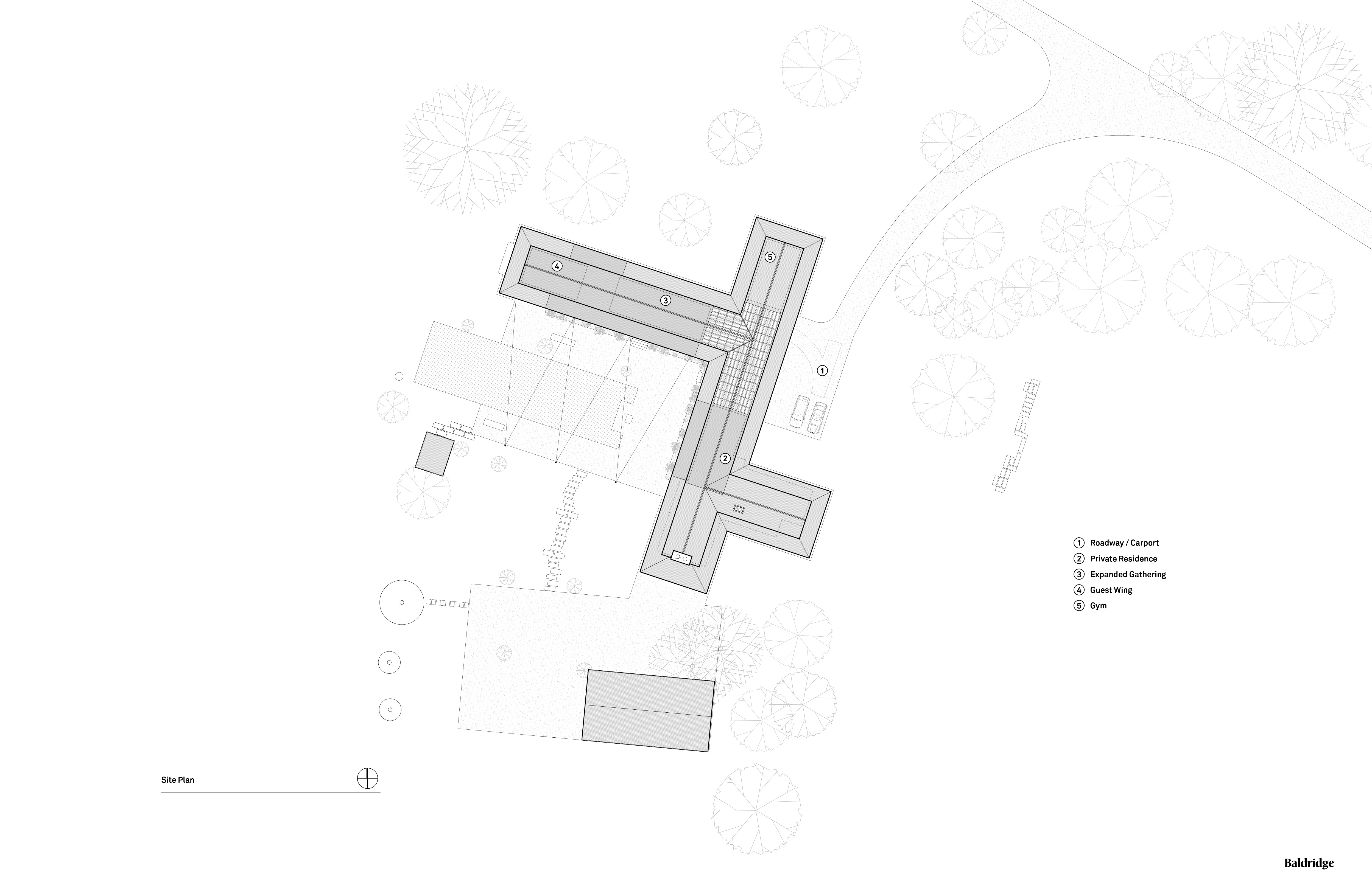 The clients were adamant that this new dwelling retain a true ranch feel, while accommodating certain modern flourishes and amenities. Above all, both wanted to retain the two buildings they had built on the property—a kitchen / dining structure and a detached single bedroom volume.