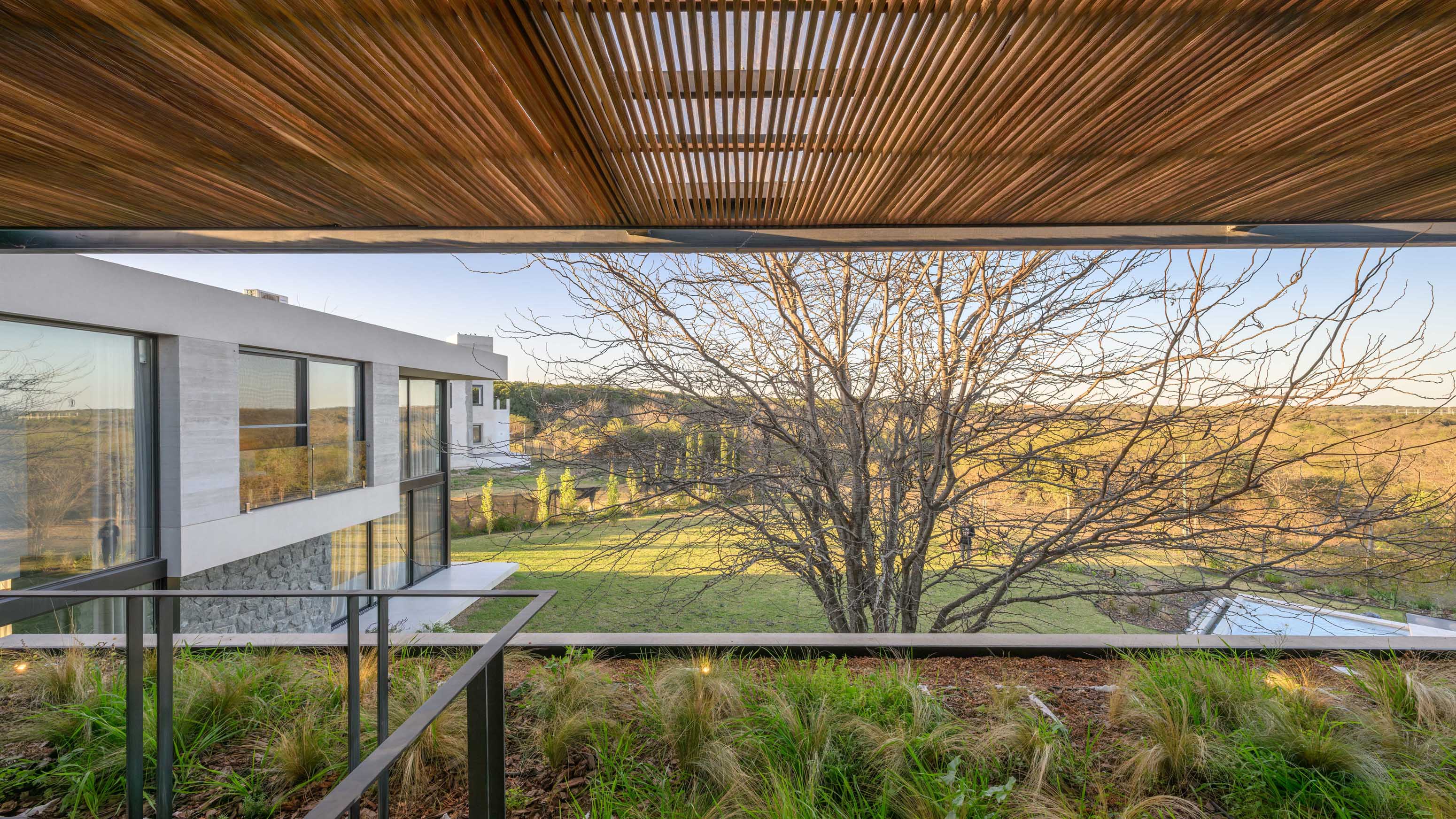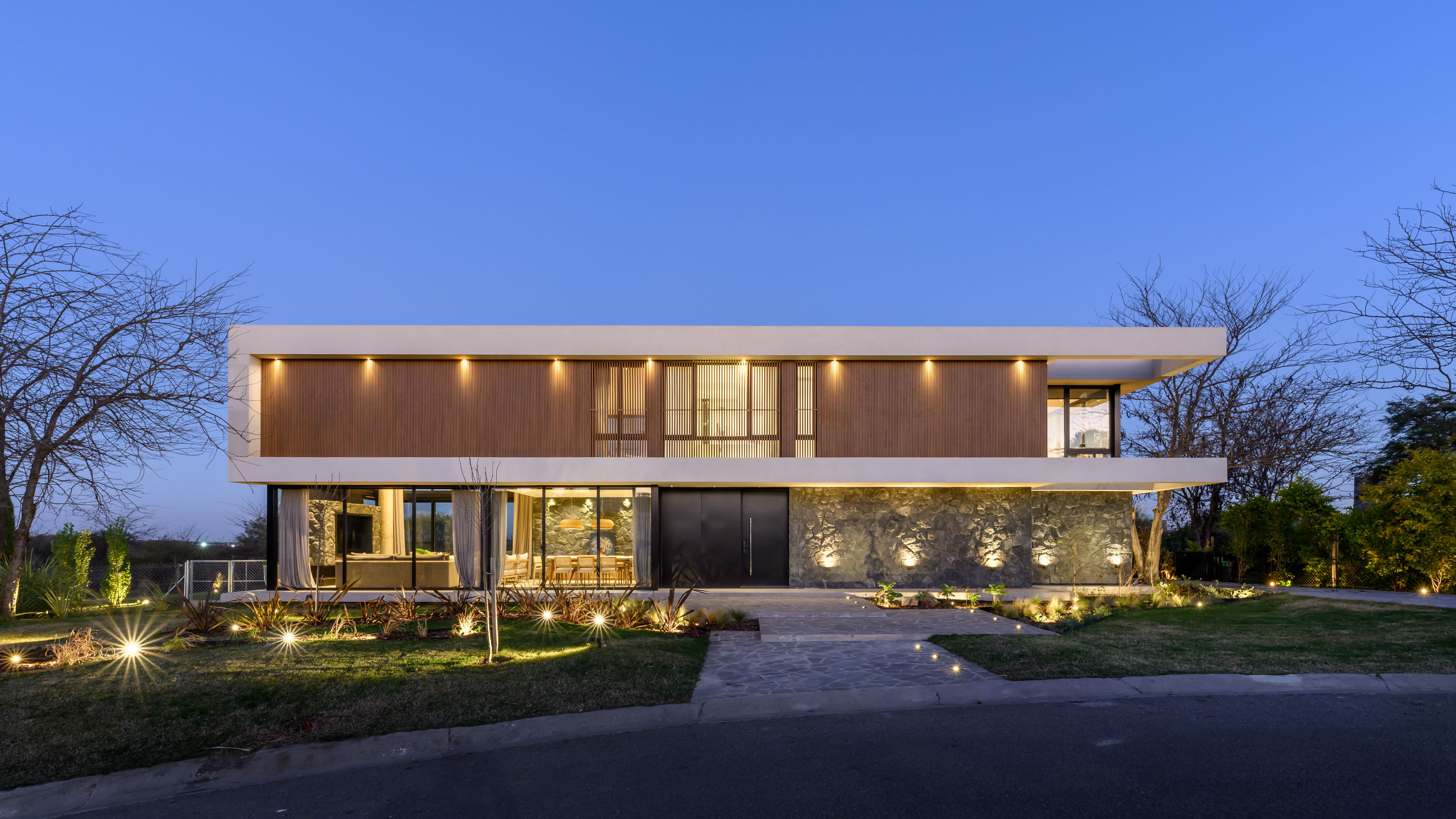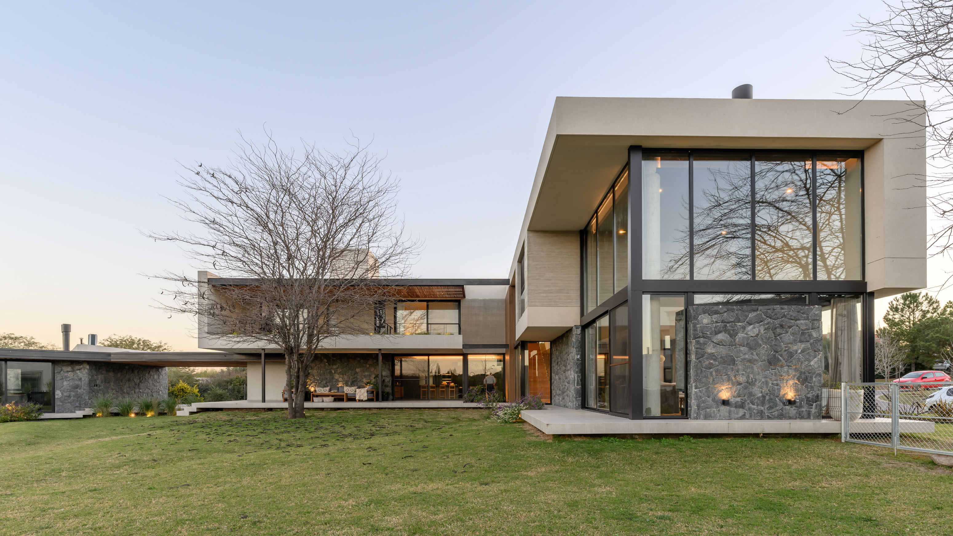 Located in La Serena private neighborhood, just 20 minutes from Córdoba Capital, this residence has been designed for a family consisting of a couple and their two teenage children, with an active social life and a deep appreciation for comfort and style. The 2075 m² lot, situated on the edge of the neighborhood and adjacent to a green space, provides a unique setting that has been utilized to maximize privacy and connection with nature.
