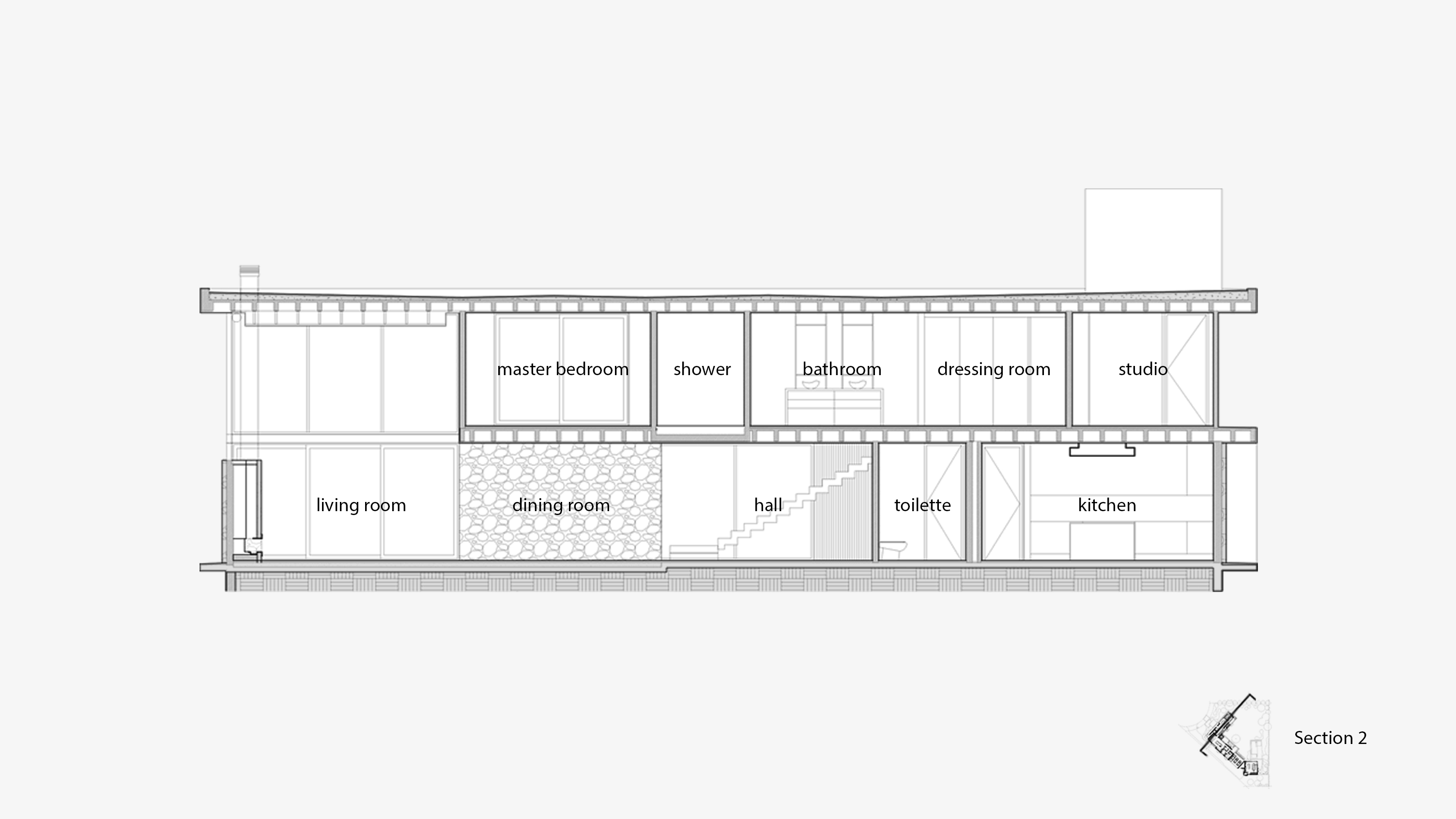 The materiality of the house reflects a contemporary and sophisticated approach. It features ribbed slabs with suspended ceilings and ceramic brick partitions, finished with plastic coatings in the style of Egyptian stone, natural stone, and WPC. This combination of materials not only provides an aesthetic finish but also ensures durability and functionality throughout the spaces.