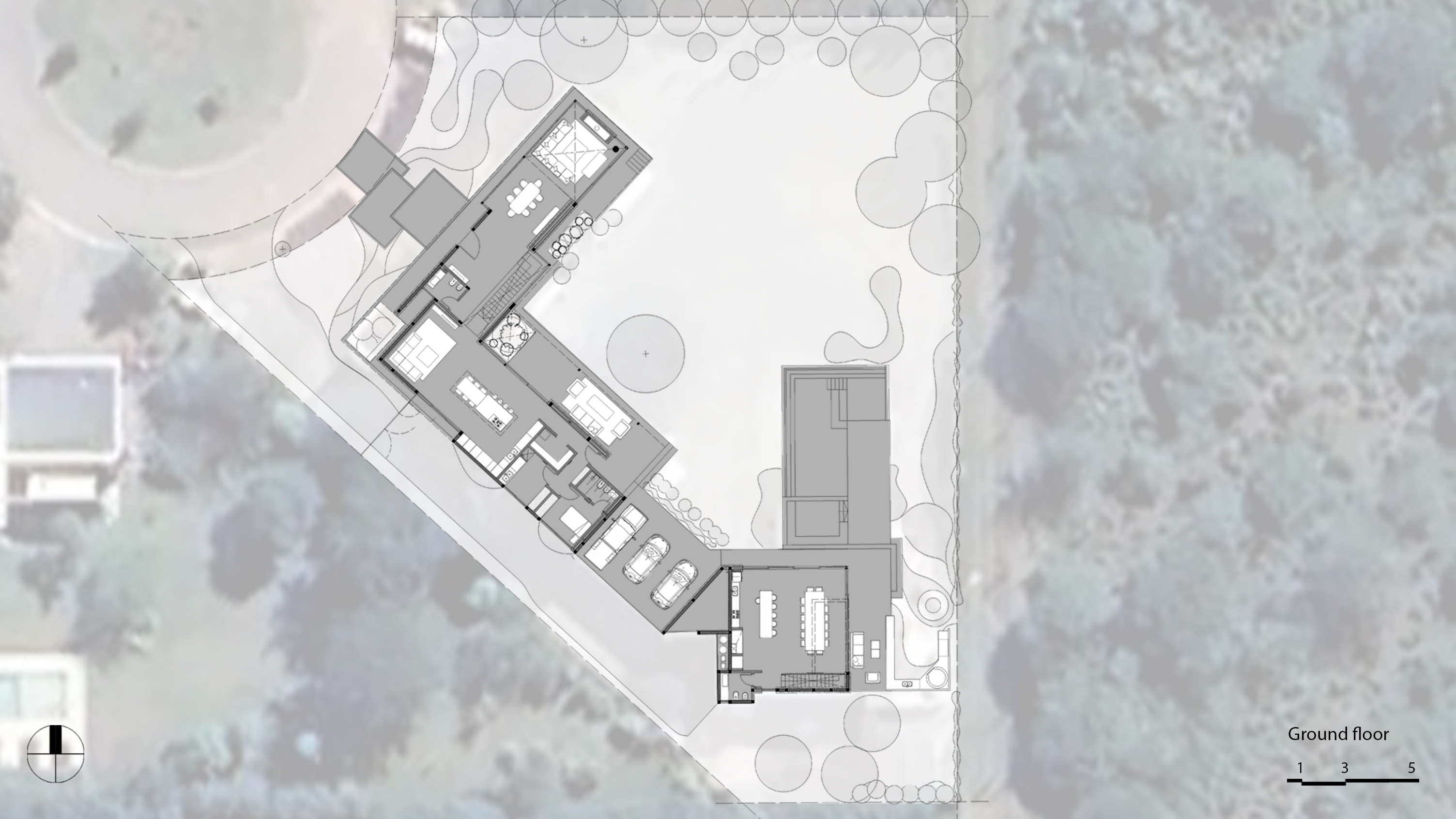 The house is arranged in an L-shape, a layout that allows for an introverted facade at the front and a generous opening towards the rear garden. This strategic orientation takes full advantage of the sun's path, with daily-use areas such as the kitchen, dining room, and family room facing northeast. This orientation not only provides exceptional natural light but also optimizes views of the extensive garden and recreational areas.