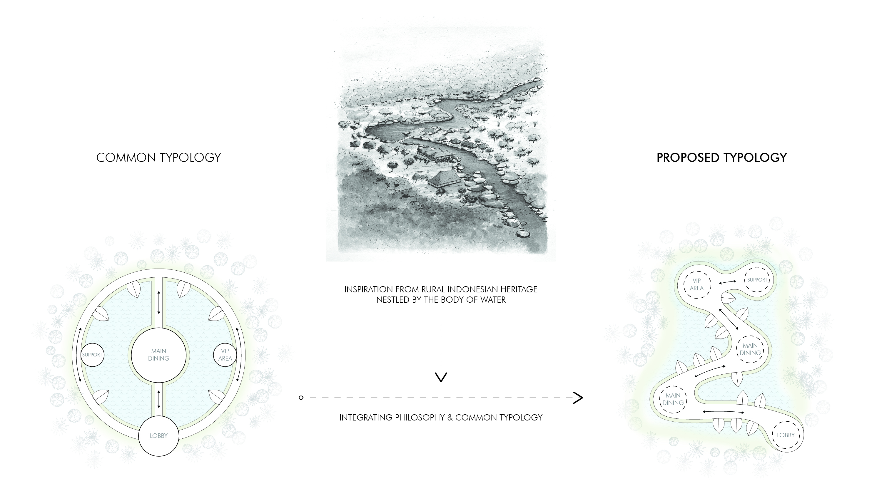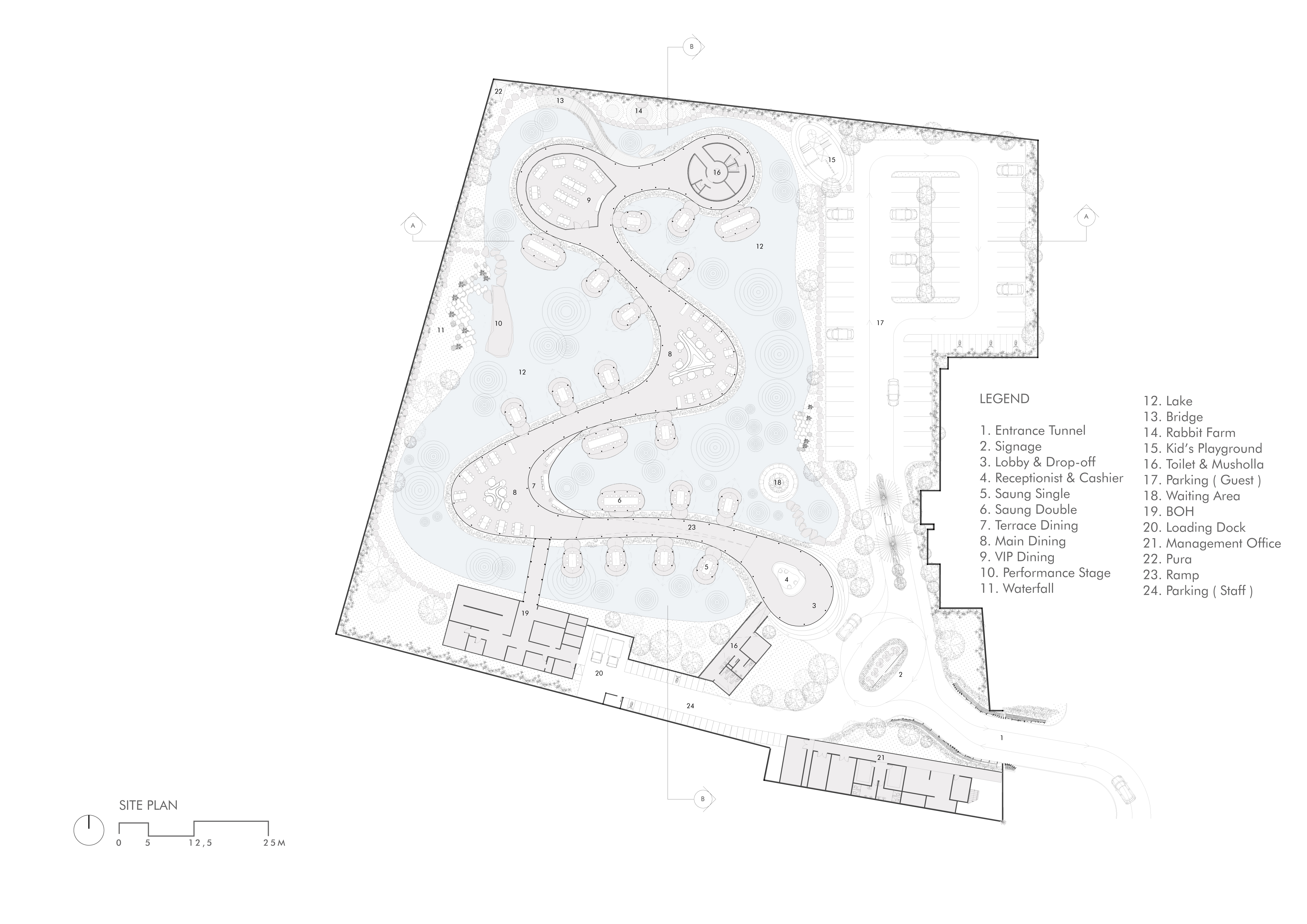 A river-like axis is central to the design, featuring a continuous, curved spine surrounded by a lake. Along this "river, " spacious dining areas rest on its bends with open-air saung nestled along its path—reminiscent of traditional riverside settlements. This novel design approach provides the main dining areas with direct access to the water's edge, allowing guests to feed fish and bask in the tranquil waterscape.