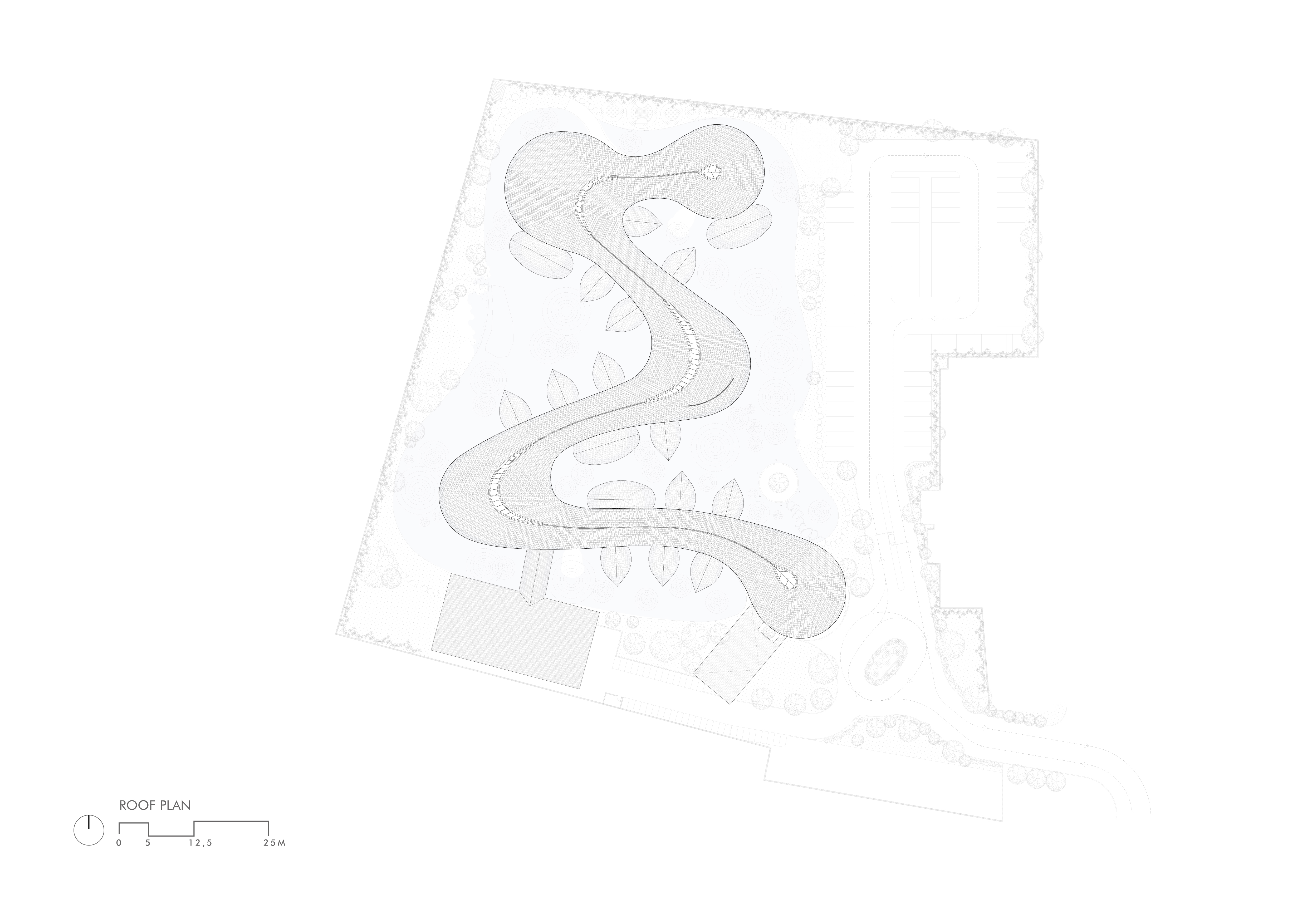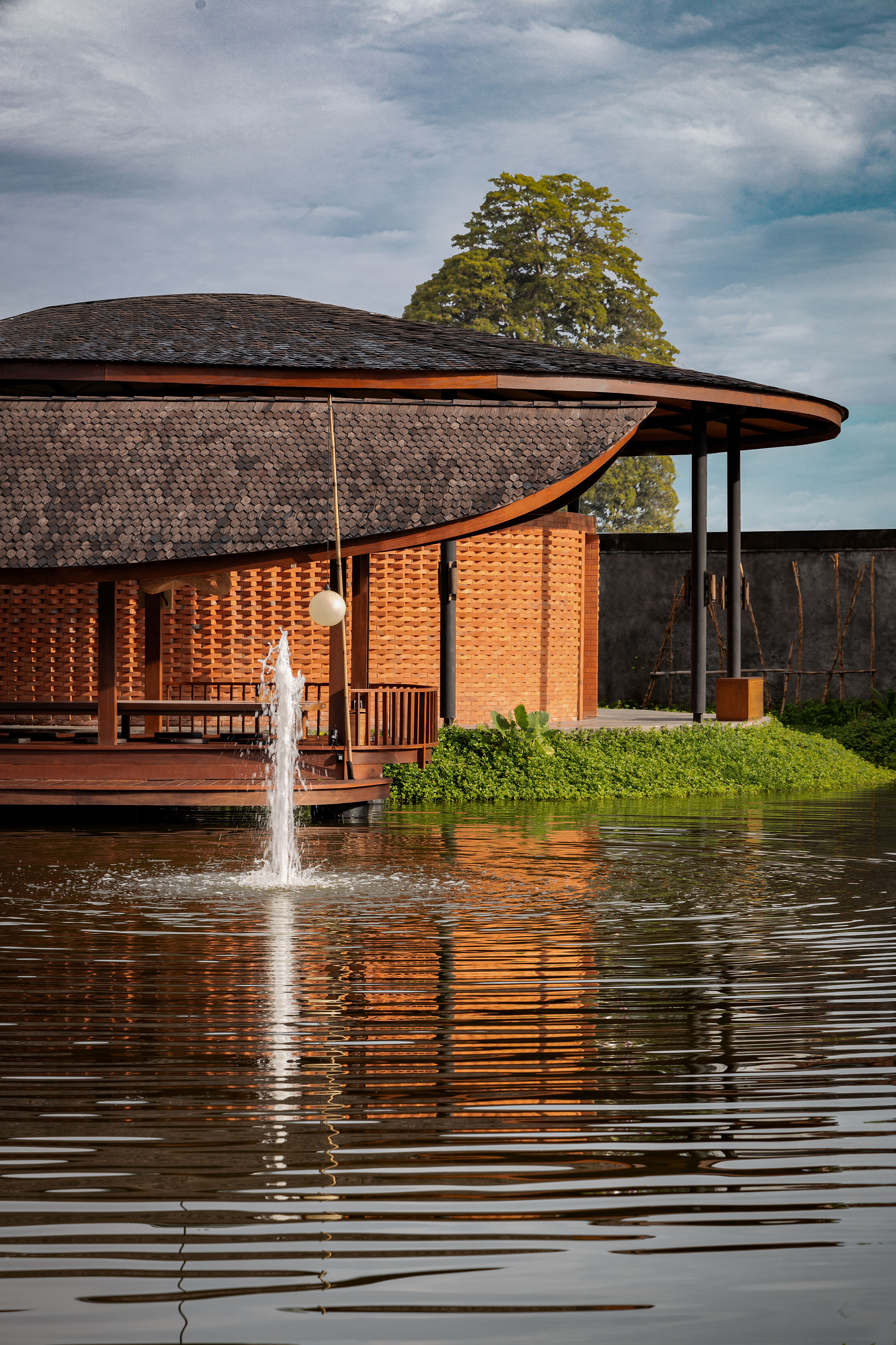 A river-like axis is central to the design, featuring a continuous, curved spine surrounded by a lake. Along this "river, " spacious dining areas rest on its bends with open-air saung nestled along its path—reminiscent of traditional riverside settlements. This novel design approach provides the main dining areas with direct access to the water's edge, allowing guests to feed fish and bask in the tranquil waterscape.