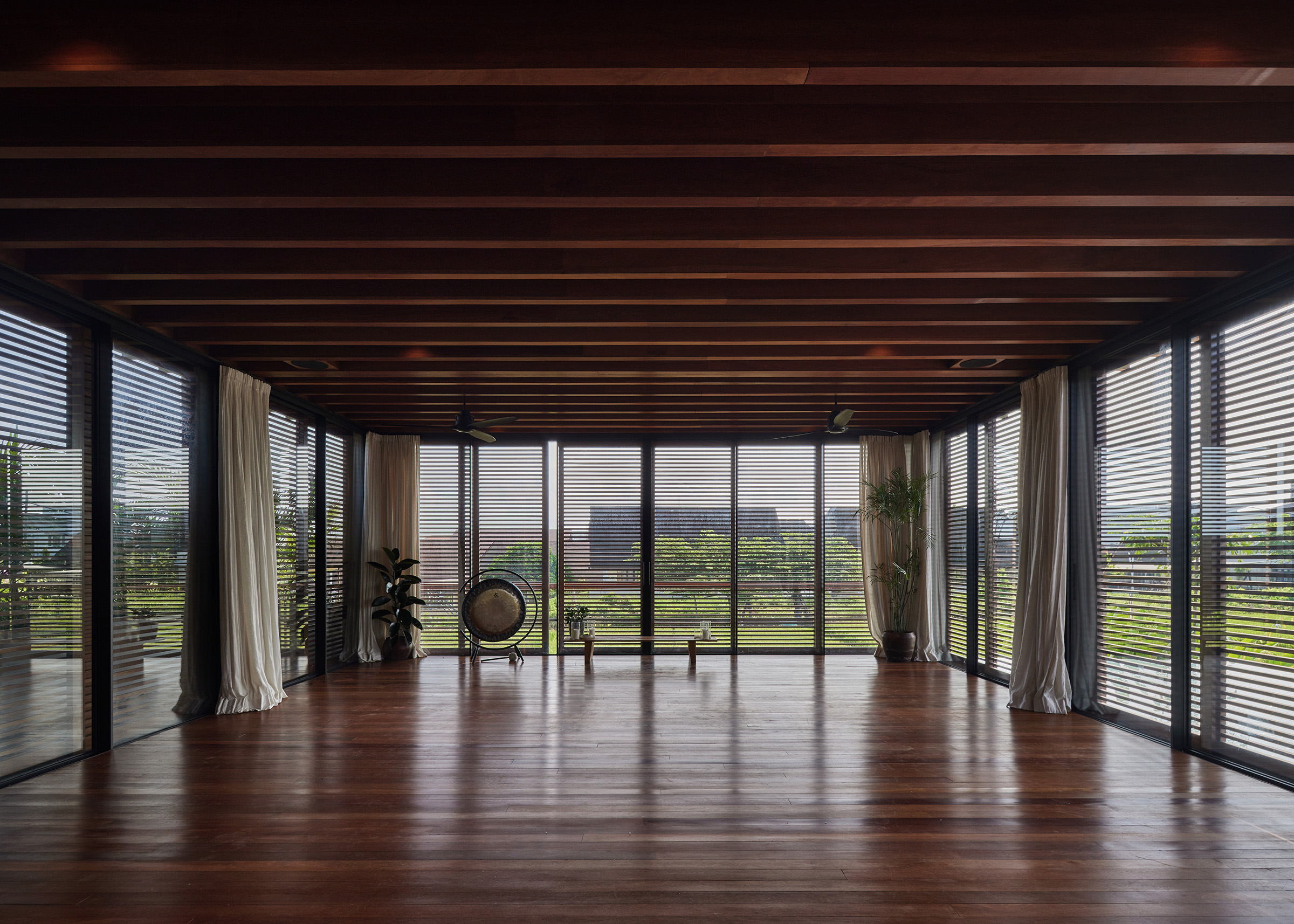 The tropical garden, designed by Bali Landscape Company, is integral to the home's design, creating a lush backdrop that enhances the indoor-outdoor living experience. The ground floor houses a gym and two guest rooms, all designed to maximize views and access to the garden. The yoga area, inspired by Rumah Kaca Kengo Kuma, features extensive use of glass to maintain a connection with the natural surroundings.