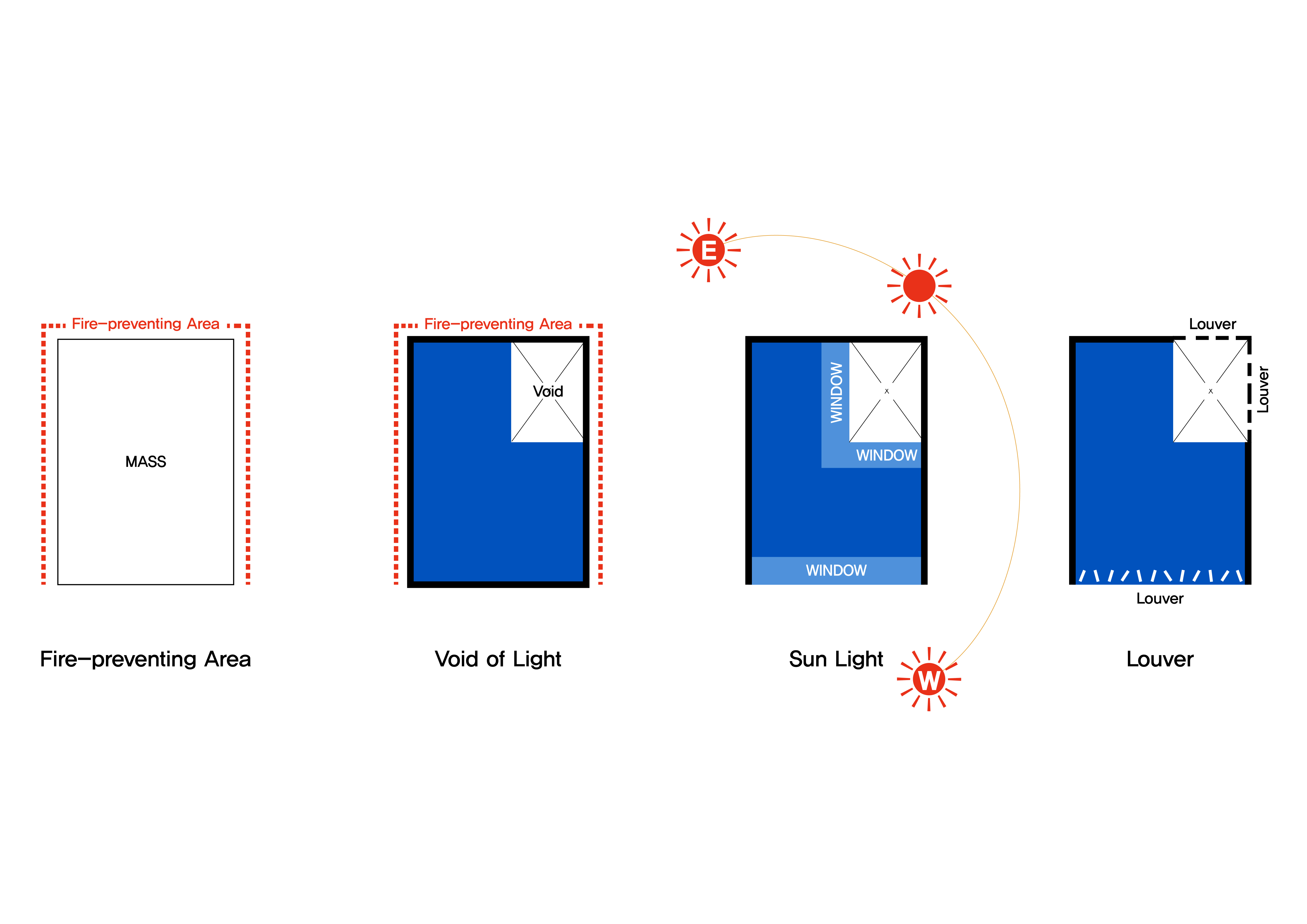 동서로 장방형인 대지는 서측의 20m 도로와 접한다. 다른 3면은 방화지구로서 창을 내는데 제약이 있었다. 유일하게 자유로운 입면 구성이 가능한 서측 전면도로의 맞은편은 유흥가가 형성되어 있어 시각적인 필터가 필요했다. 사옥의 업무 환경을 위해 일조의 확보는 가장 중요하게 다뤄져야 할 개념이었기에, 일조를 확보하기 위해 건물의 남동측 코너에 빛을 받아들일 수 있는 2~4층을 관통하는 중정을 계획하였다. 중정은 빛을 전달하는 전이공간인 동시에 직원들의 휴식공간이며, 동북측에 배치한 4층 보육실까지 쾌적한 일조환경을 확보한다.