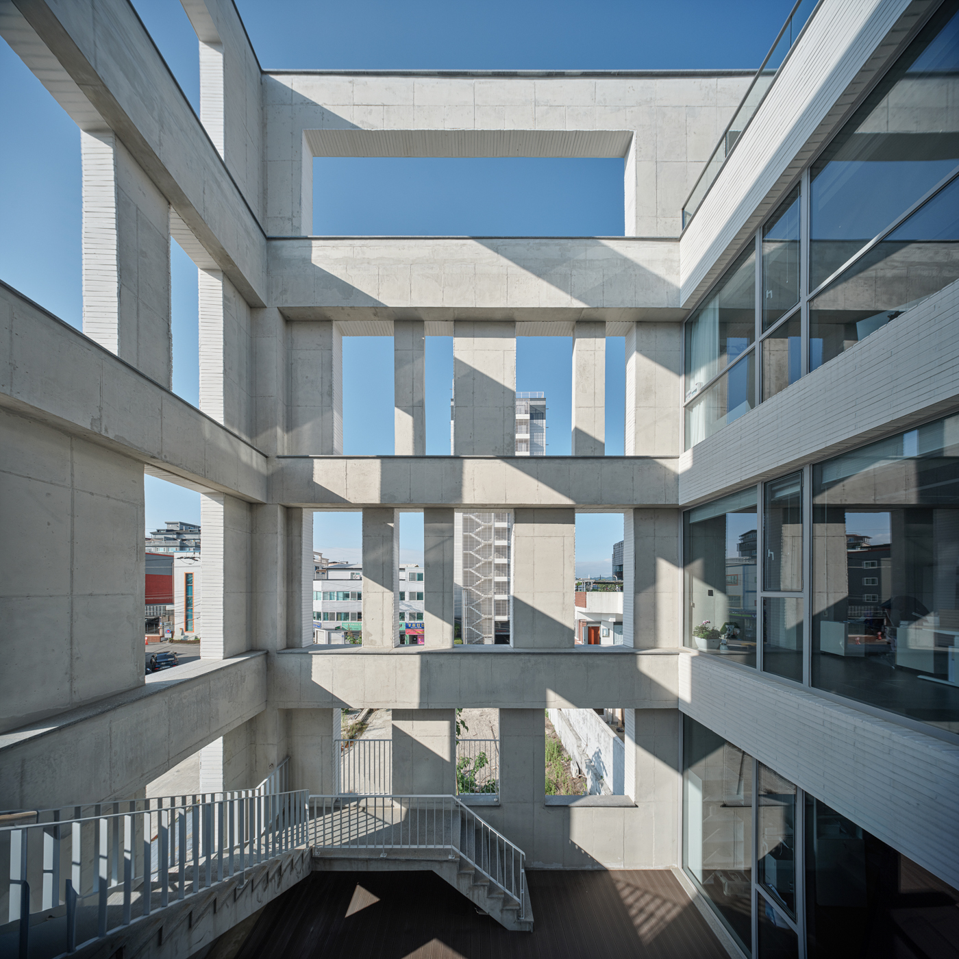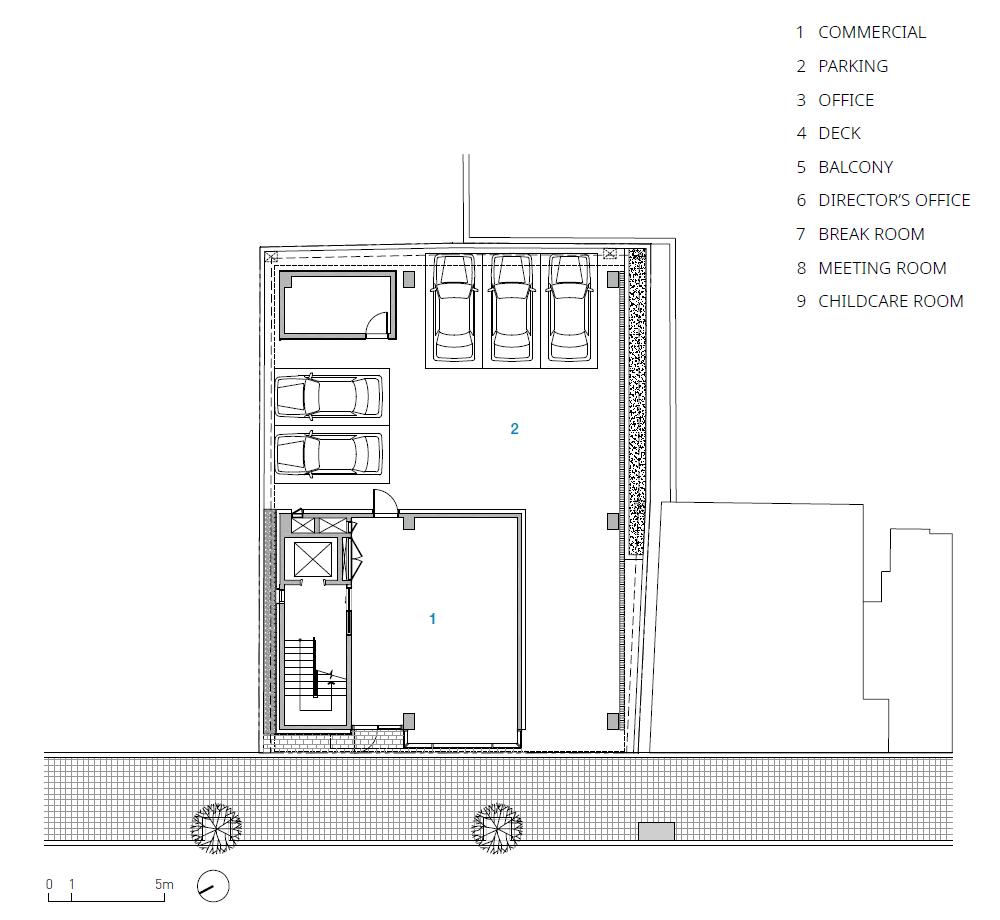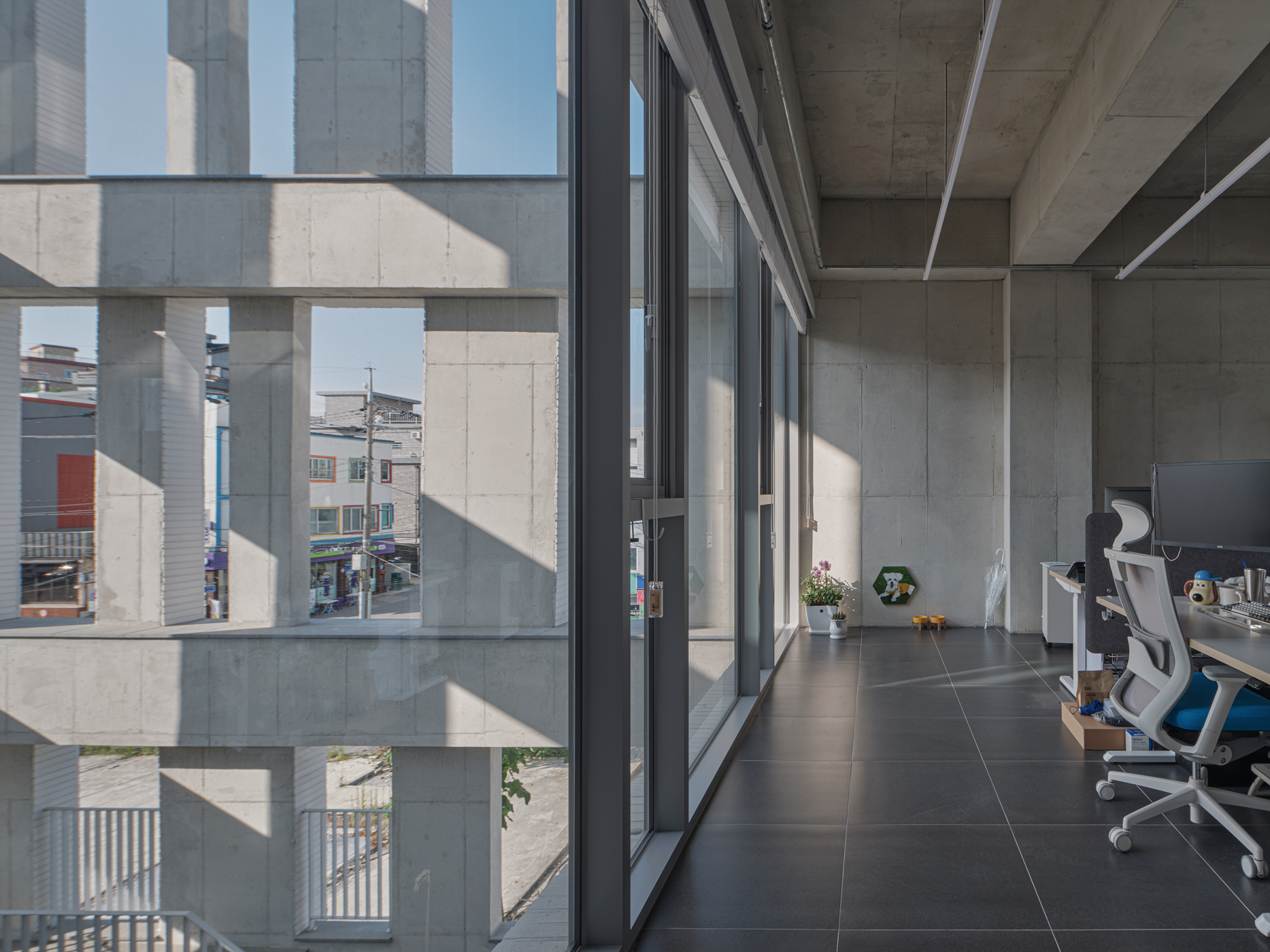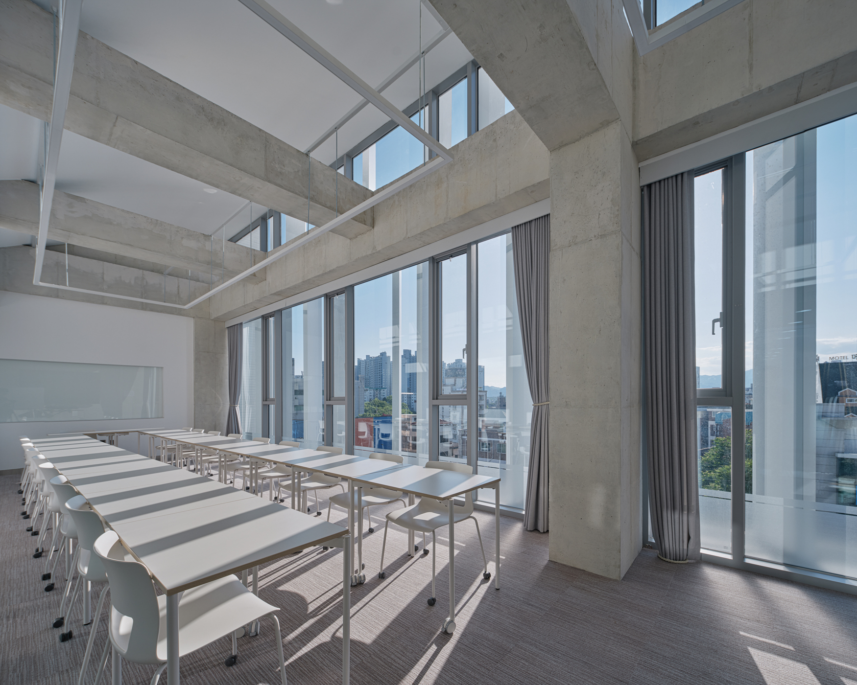 동서로 장방형인 대지는 서측의 20m 도로와 접한다. 다른 3면은 방화지구로서 창을 내는데 제약이 있었다. 유일하게 자유로운 입면 구성이 가능한 서측 전면도로의 맞은편은 유흥가가 형성되어 있어 시각적인 필터가 필요했다. 사옥의 업무 환경을 위해 일조의 확보는 가장 중요하게 다뤄져야 할 개념이었기에, 일조를 확보하기 위해 건물의 남동측 코너에 빛을 받아들일 수 있는 2~4층을 관통하는 중정을 계획하였다. 중정은 빛을 전달하는 전이공간인 동시에 직원들의 휴식공간이며, 동북측에 배치한 4층 보육실까지 쾌적한 일조환경을 확보한다.