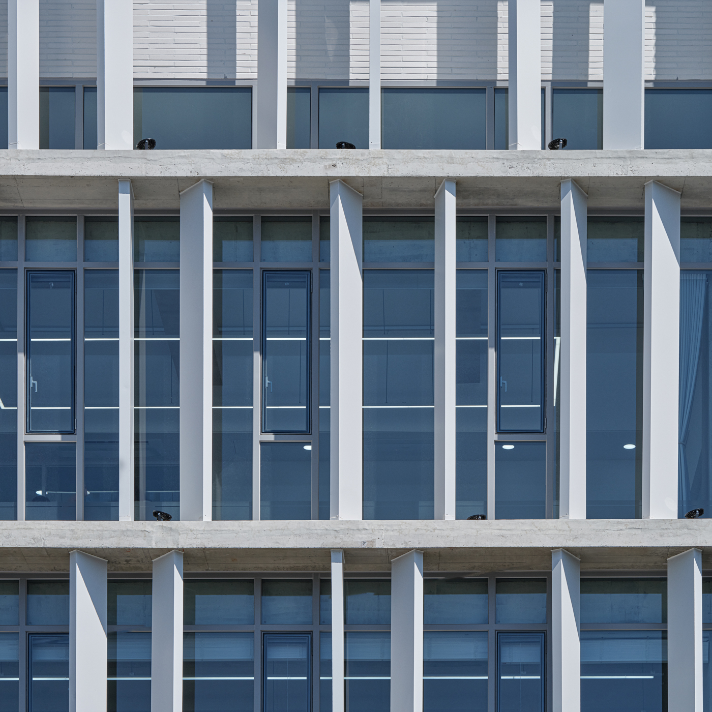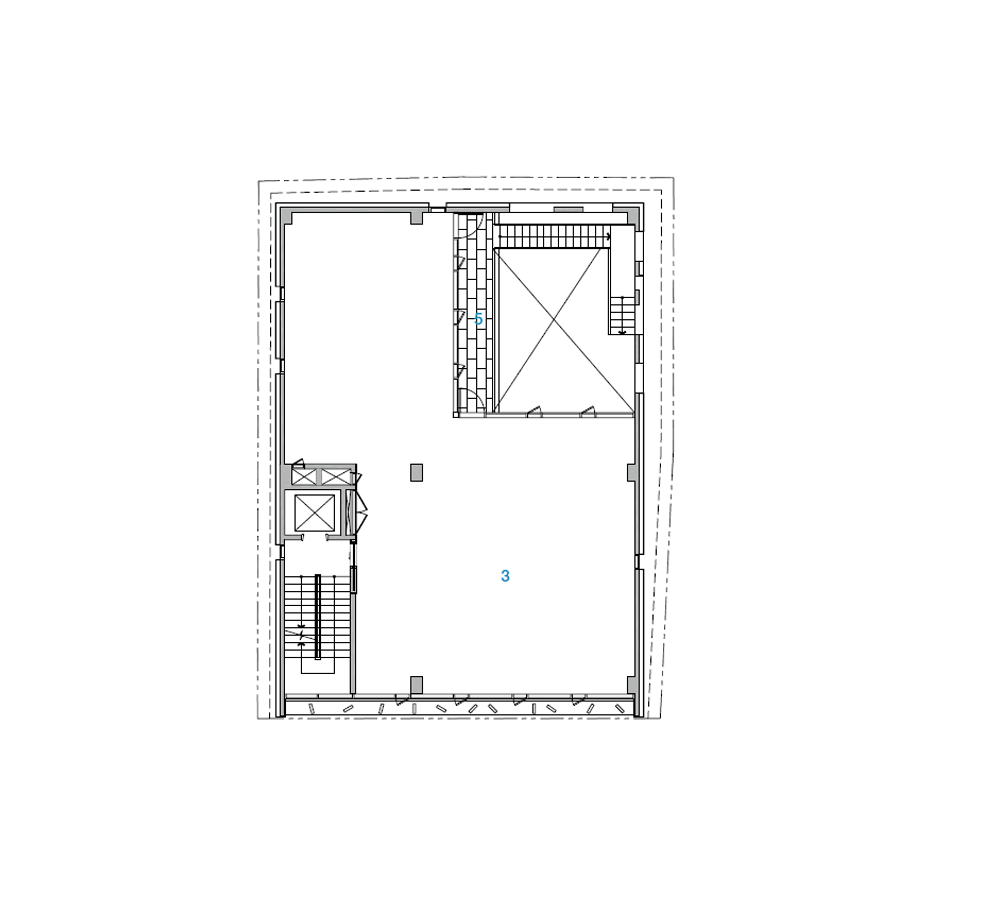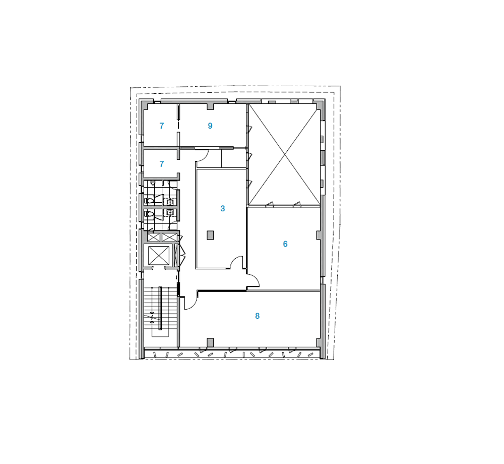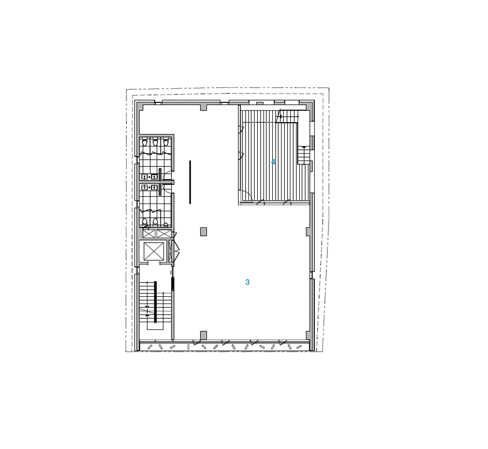 The site is rectangular, oriented east to west, and borders a 20-meter-wide road on the west side. The other three sides are within a fire protection zone, limiting the placement of windows. Across from the west side, the only façade where windows could be placed without restriction, a visual filter was necessary due to the view of bars and nightlife venues across the street. Ensuring sufficient daylight was essential for the work environment, so a courtyard extending from the second to fourth floors was planned at the southeast corner to bring light into the building. This courtyard functions as a transitional space for light and a rest area for employees while ensuring a pleasantly lit environment for the childcare facility on the northeast side of the fourth floor.