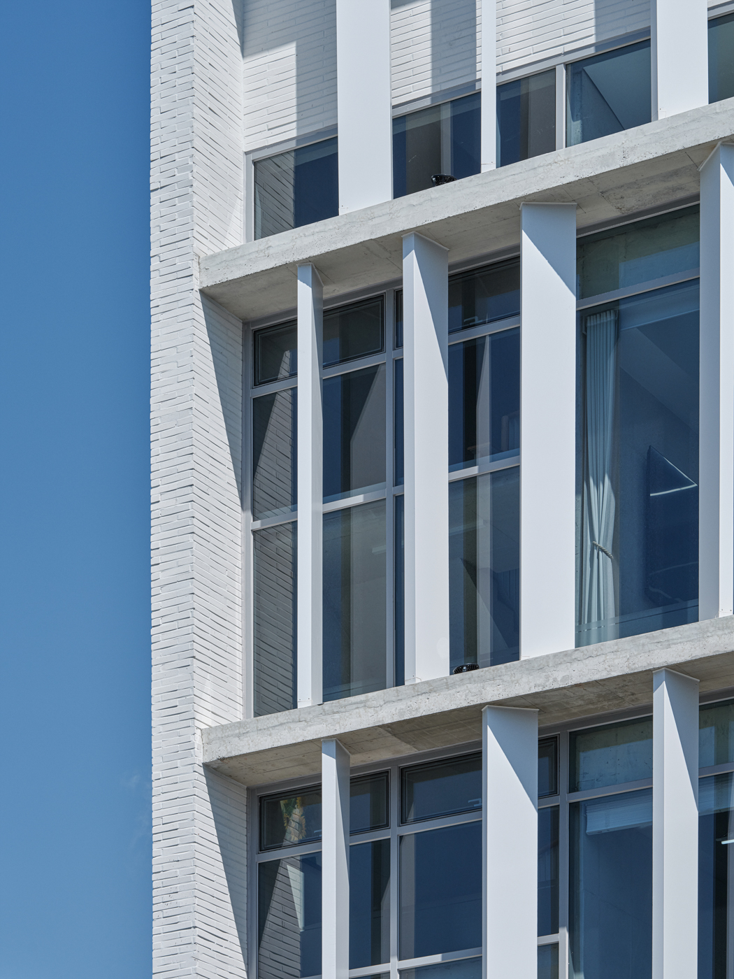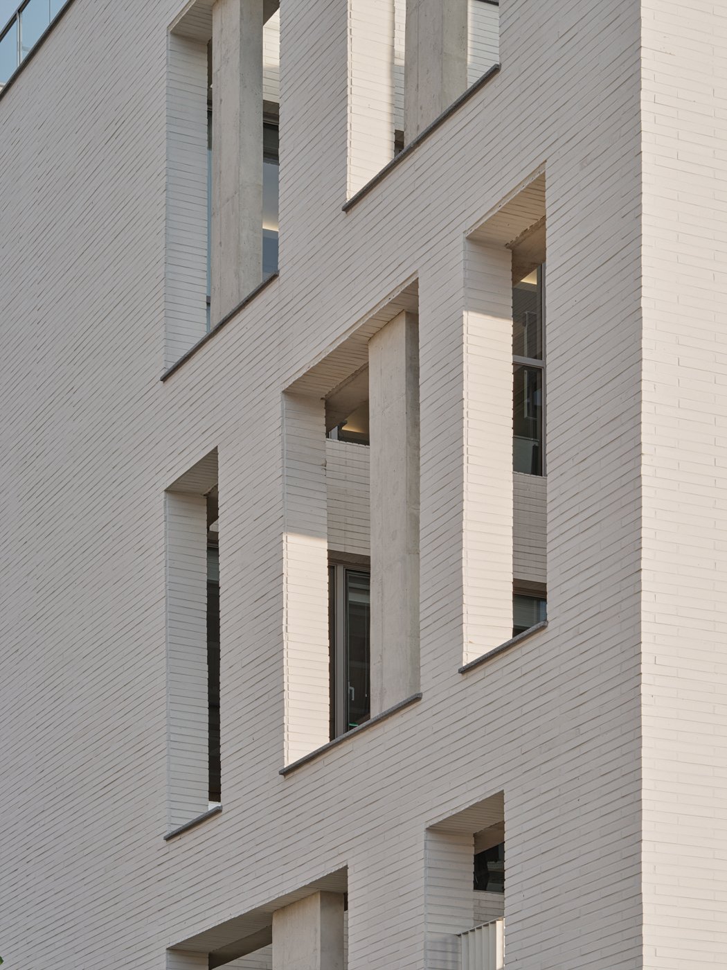 White-toned long-brick tiles with horizontal patterns were used for the exterior, while exposed concrete was used as the primary interior finishing material. In the courtyard, exposed concrete extends from the interior and intersects with the long-brick tiles. The lower section of the building features black long-brick tiles, inspired by The Pict’s new logo colors, providing contrast and making the white-toned upper mass appear buoyant. The windows and louvers emphasize verticality, creating a sense of tension through contrast with the horizontal tile patterns.