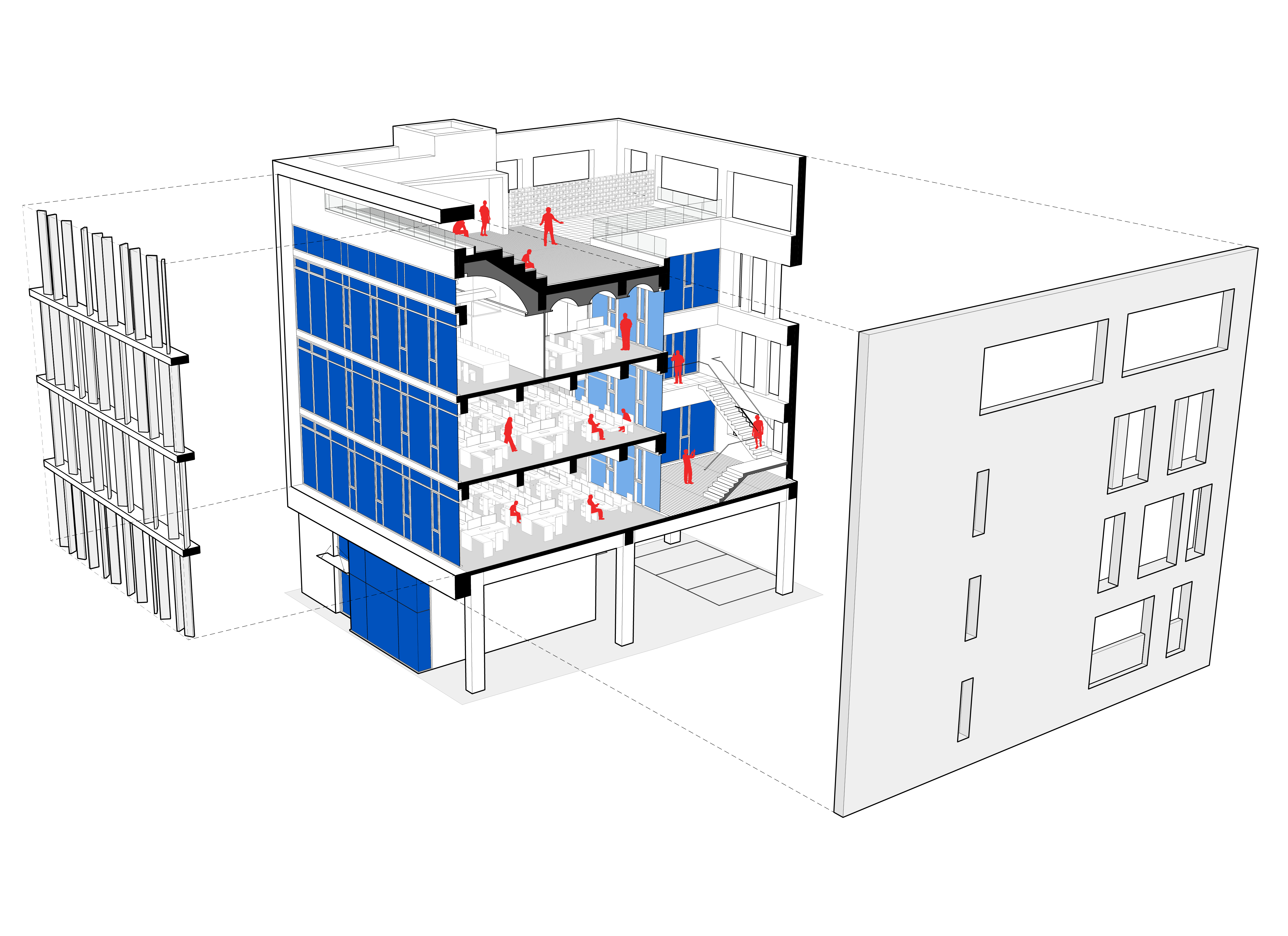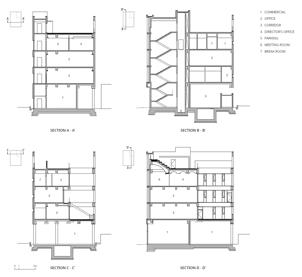 더픽트 사옥은 총 4개층으로 구성되었다. 옥상 파라펫의 높이를 기준층의 층고와 동일하게 계획하여 직원들의 소통과 휴식을 위한 위요된 옥상휴게공간을 제안했다. 1층은 6m 층고의 개방적인 공간으로 진입홀 겸 카페로 계획하여 직원뿐만 아니라 카페 이용객의 동선을 함께 고려하고, 후면부 주차장은 물품 이동이 원활하게 했다. 2, 3층은 가변적인 활용을 고려한 업무공간으로 중정을 직접 이용할 수 있다. 4층은 리더실, 사업관리실, 대회의실 등과 함께 직원복지를 위한 작은 보육실이 있다. 옥상에는 4층 대회의실 상부와 연결된 계단식 휴게공간을 두어 자유로운 휴식 및 토론이 가능하고, 하부 공간은 대회의실의 층고를 확보하여 공간의 효율성을 높였다.