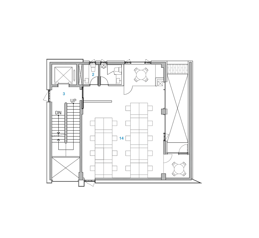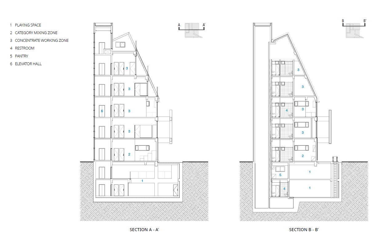 서울시의 3종 일반주거지역은 건폐율이 50%인 관계로 넓은 건축면적을 확보하기 어렵다. 필연적으로 수직으로 프로그램이 나누어지며 층별 카테고리 분리가 이루어졌고, 단면 구조가 단순해지는 만큼 평이한 계획이 되지 않도록 신경써야 했다. 오랫동안 기업의 업무 특성을 연구한 결과 2가지의 핵심 업무환경 포인트를 발견했다. 먼저 IT기업의 특성상 높은 집중력과 협업을 위한 팀워크가 중요하기에 집중 업무 구역과 휴게 · 놀이구역을 철저히 구분하는 것이 배치의 중점이었다. 한편 창의적인 아이디어는 책상 앞에 앉아 있을 때가 아니라, 놀다가 문득 떠오르기도 한다. 건축가는 1층 라운지를 기준으로 하여 놀이공간과 업무공간을 명확하게 구분했다. 라운지는 서로 다른 영역으로의 이동이나 접근의 선택적 제한, 사람이나 정보가 모이고 흩어지는 기준이 되는 카테고리 믹싱 존으로, 사옥의 기준이자 핵심 프로그램이다. 2층 이상의 공간은 집중 업무 구역으로 모니터로 반사되는 자연 직사광이나 인접 건축물과의 상호 프라이버시 등 여러 불편 요소를 줄이기 위해 최소 크기의 창을 배치했다. 북측의 창은 간접적인 자연광으로 답답함을 해소하고, 복도나 회의실, 휴게공간 등 공용공간에 맞추어 선택적 개방을 유도함으로서 조도를 확보했다. 지하 2개 층은 직원들을 위한 공간으로 마련하여 마음껏 공간을 누리게 했다. 2개 층 사이가 수직으로 열린 보이드 공간은 다양한 레벨에서 각자의 놀이를 지켜볼 수 있는데, 이를 통해 참여 유도 심리를 발현시켜 다양한 동료 및 그룹에 쉽게 접근하고 소통할 수 있도록 했다. 궁극적으로 팀워크를 위한 준비 과정과 직무 참여자 간 정보교환이 이루어질 수 있는 분위기가 형성되고 창의적 잠재력이 창출되는 장소로 거듭났다.