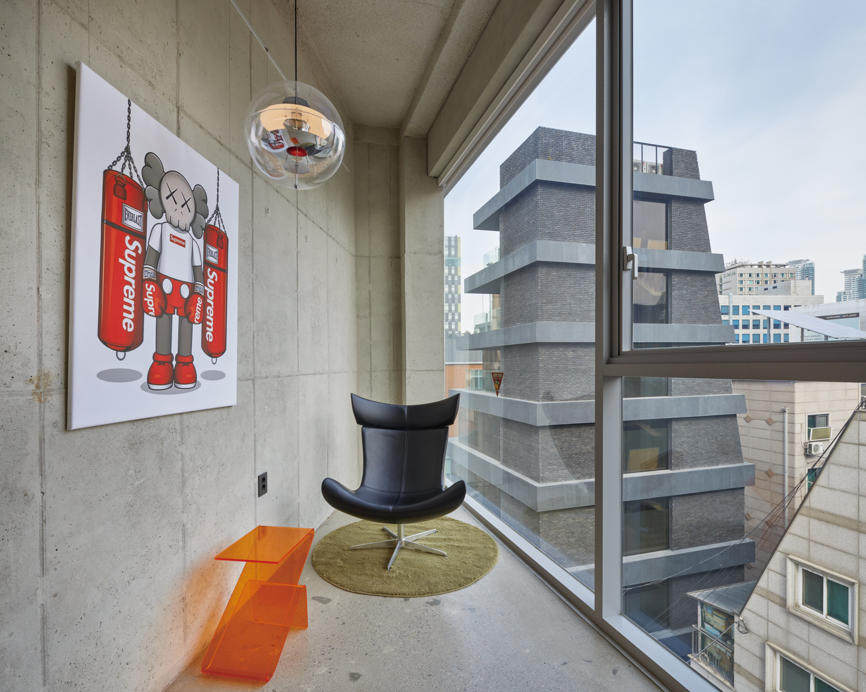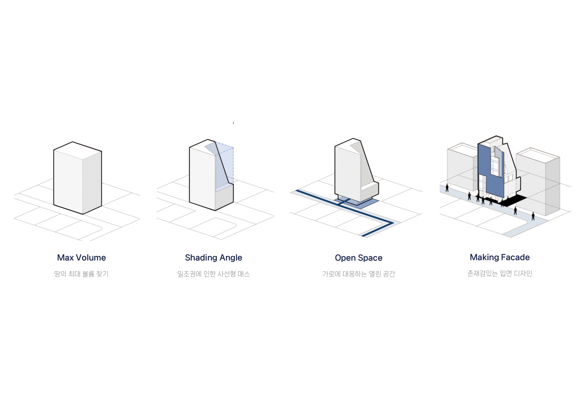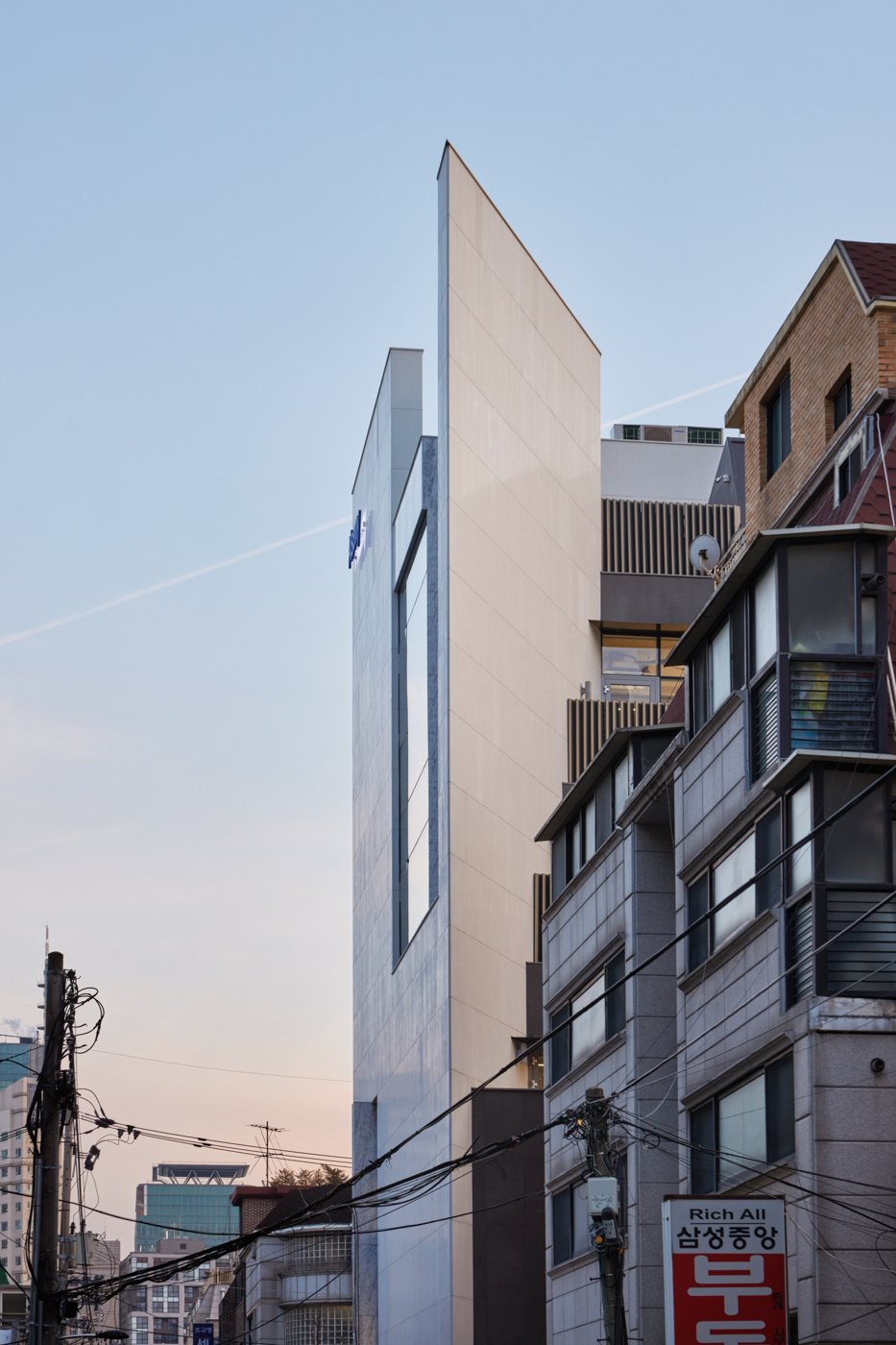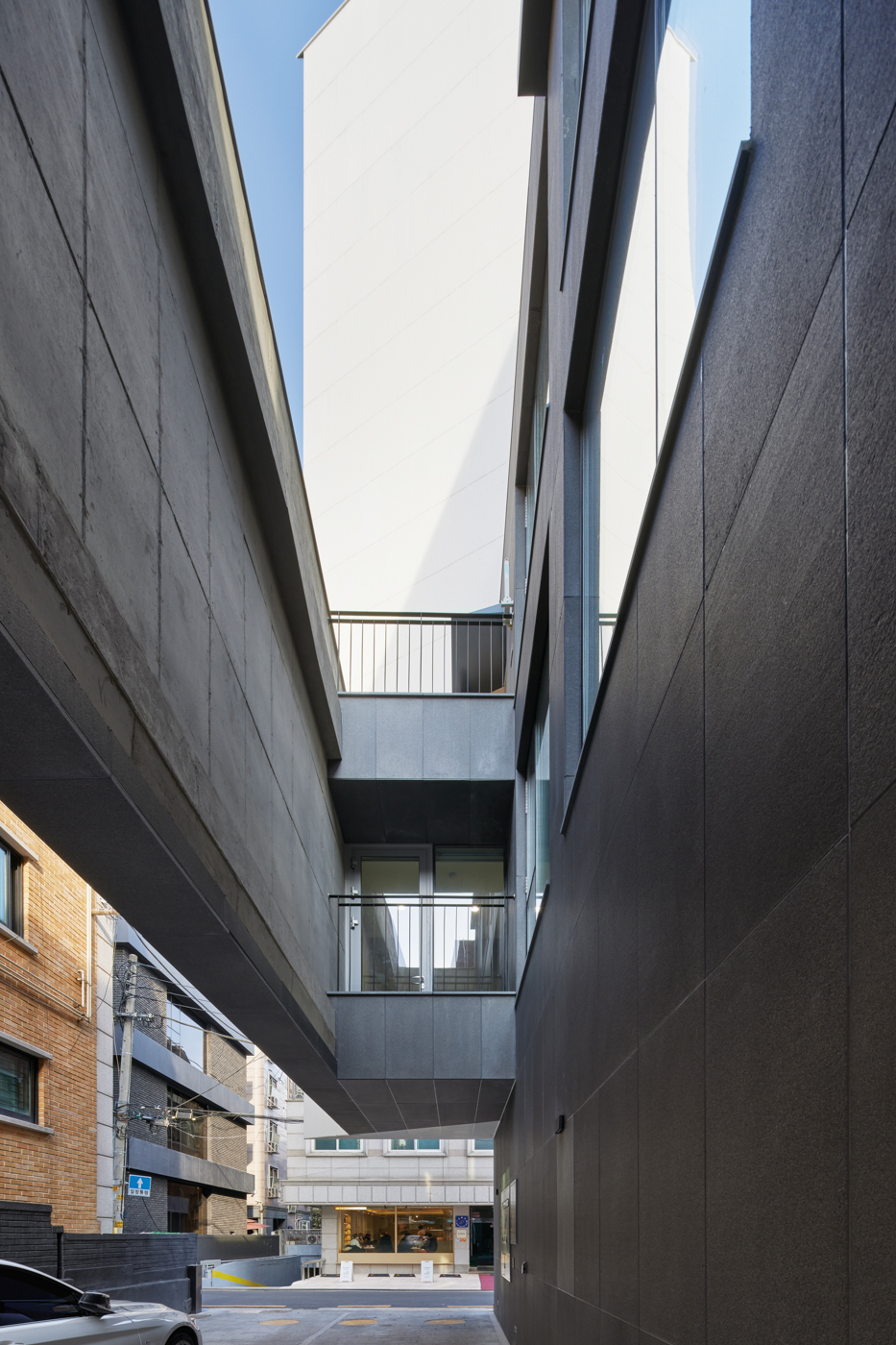 In Seoul’s Type 3 General Residential Area, the building-to-land ratio is capped at 50%, making it difficult to secure a large building footprint. As a result, the program had to be arranged vertically, with distinct categories assigned to each floor. Since the cross-sectional structure was relatively simple, special attention was given to prevent the overall design from becoming too conventional. After extensive research into the nature of corporate work environments, two key design principles emerged. First, given the nature of IT companies—where intense focus and team collaboration is vital—the layout focused on distinctly separating work areas from rest and recreational spaces. At the same time, creativity often strikes not while sitting at a desk, but during moments of play or relaxation. The architects separated the play and work areas, using the ground-floor lounge as a boundary. This lounge is the core space of the building, a ‘category mixing zone’ where people and information can converge or disperse, also allowing selective movement and restricted access to different areas. From the second floor and above, of which spaces are designated for focused work, windows are minimized to reduce visual distractions such as direct sunlight on screens and privacy concerns with neighboring buildings. North-facing windows bring in soft, indirect natural light to prevent the spaces from feeling confined, while communal areas like hallways, meeting rooms, and rest zones feature strategically placed openings to ensure optimal lighting. The two basement floors are designed as employee spaces, offering freedom and flexibility. The vertical void connecting these floors creates visual connections across different levels, encouraging interaction and fostering a sense of community. Ultimately, this design promotes collaboration and the free exchange of ideas, cultivating an environment where creative potential can flourish.