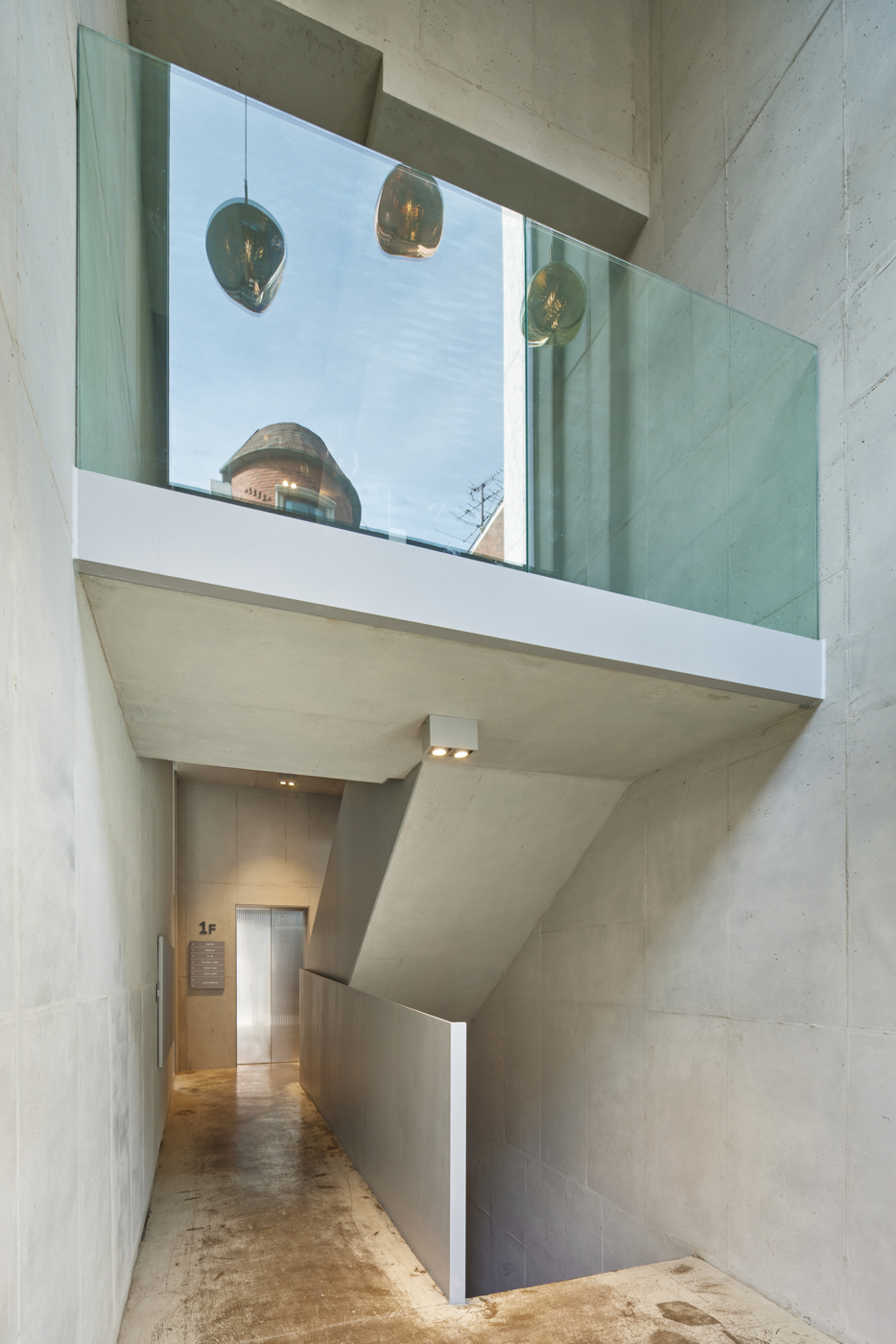 An office building should reflect the values and identity of the company. In this design, the layered program is reflected in the façade, with the unique character and function of each space coming together to form a massive, unified wall. Using the dépaysement technique, the transparent glass façade of the first-floor lounge stretches upwards, creating a stark contrast with the narrow streets and dense alleyways surrounding it, transforming the building into a mysterious and striking object within the urban landscape. The sharply angled front mass of the building, which pushes the limits of the Restrictions on Height of Buildings for Securing Sunshine, expands the building’s presence along the street, enhancing the sense of unfamiliarity. This bold design creates a memorable first impression for visitors as they approach the building from the nearby station.