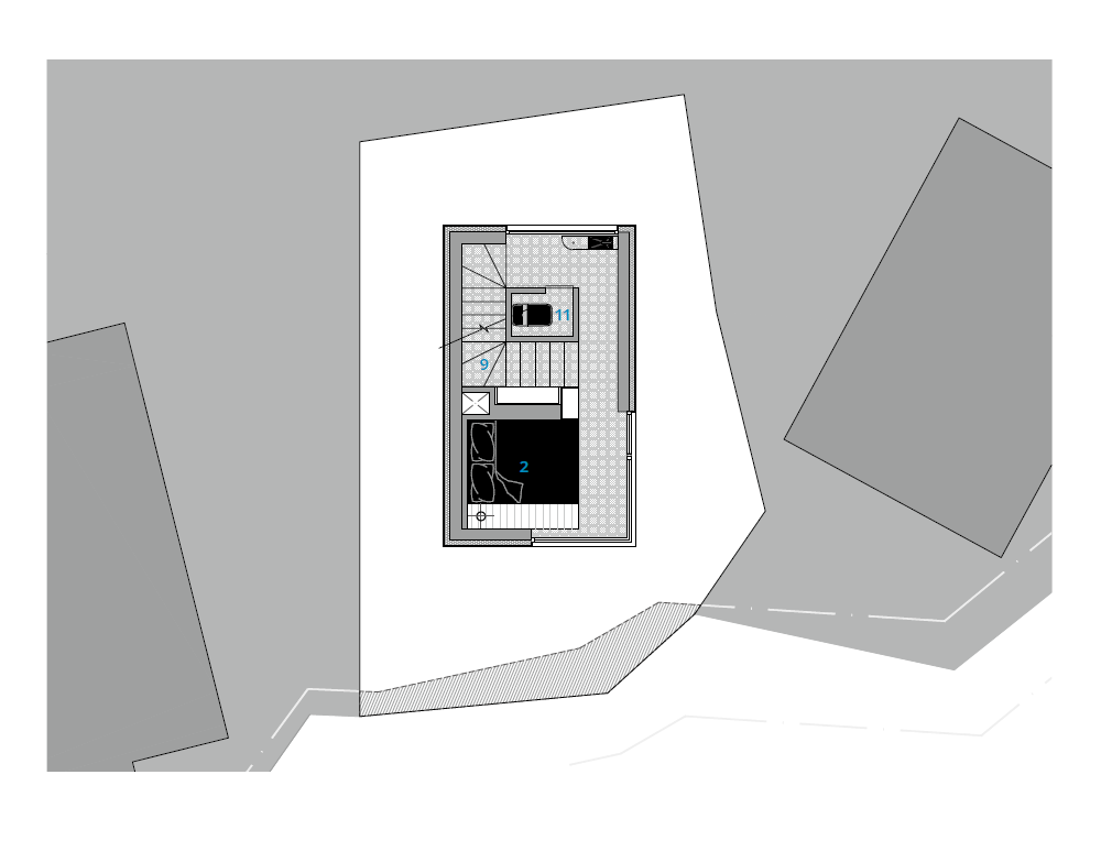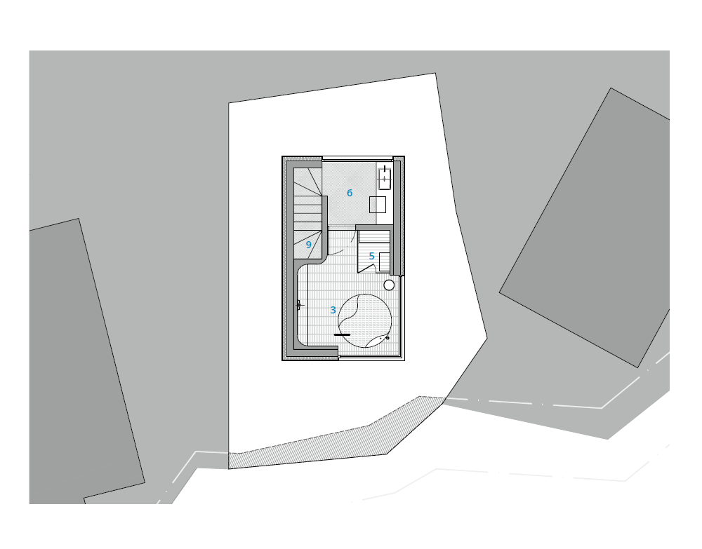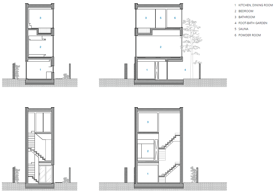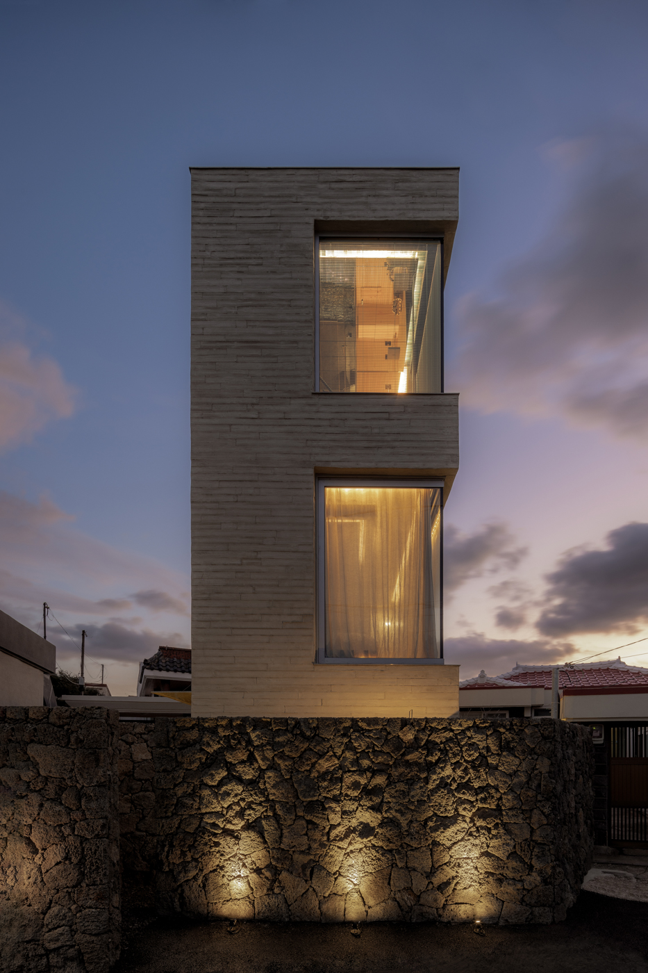 Jocheon Bathhouse is a small, three-story building, with each floor measuring 4.5 pyeong (approximately 15 square meters). Rather than prioritizing parking, the plan maximized the use of the courtyard to create an intimate, private bathhouse for two guests. The third floor features a bath space with diverse shower experiences and panoramic views of the ocean. On the second floor is the bedroom, and the kitchen is on the first floor. The structure opens only where it embraces nature, offering views of the sea and sunlight while remaining otherwise sealed off from the outside. The exterior, crafted from concrete with wood grain patterns, captures and reflects the changing light. A basalt stone wall leads visitors along a long path that eventually opens into an internal garden, guiding them to the interior. An extended entry heightens the sense of immersion, allowing guests to experience a gradual transition into the space and its unique atmosphere.