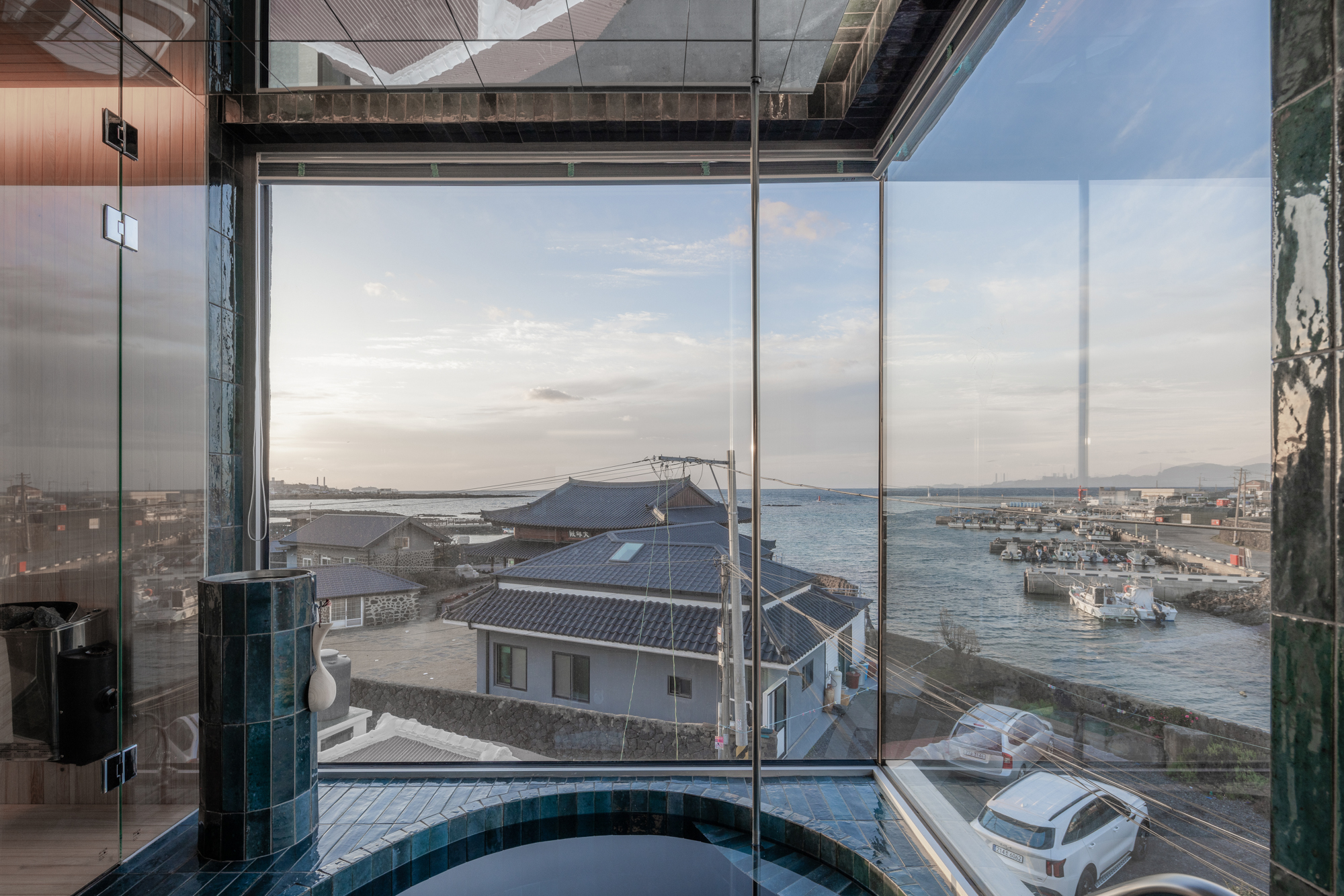 Upon entering, a small motion sensor light warmly greets visitors. To the right of the garden with a rounded wall is a small foot bath, where guests can relax their feet in the sun. To the left is a compact kitchen and dining area with folding doors that opens up completely to a terrace, allowing guests to enjoy Jeju’s gentle breeze. The second floor’s concrete and muted wood finishes provide a natural backdrop, capturing the daylight and adding a warm tone to the space. Soft carpeting on both the floors and ceiling creates a warm space, and only indirect lighting was used to create a calm and peaceful environment. The third floor features a large window that frames the stunning view of Hallasan Mountain, and allows sunlight from the south to flood the space. Overlooking the ocean, the bathhouse offers a relaxing and immersive experience, where the soothing movement of water and the scenic views come together to wash away the fatigue of the journey.