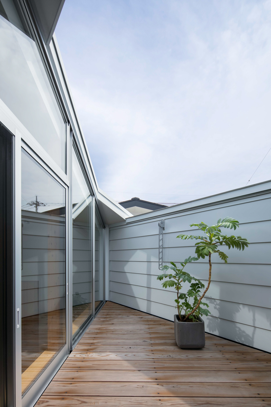 House H is a residence in a quiet city with a white exterior that harmonizes with the surrounding streets. The layered roof, with its triple-tiered structure, reflects the changing sky throughout the day, and the light coming from the south creates a warm atmosphere. The architect proposed an open area within the small house to enhance family bonding. When the sliding doors in the central space of the house are closed, the space is transformed from a family area into separate individual places. The integration of these individual and shared spaces maintains a suitable humidity level through natural light and wind, achieving balance and helping to relieve daily fatigue. The varying ceiling heights at different angles create interactions with the light, fostering a sense of freedom and flexibility, while promoting family growth, memories, and bonding.
