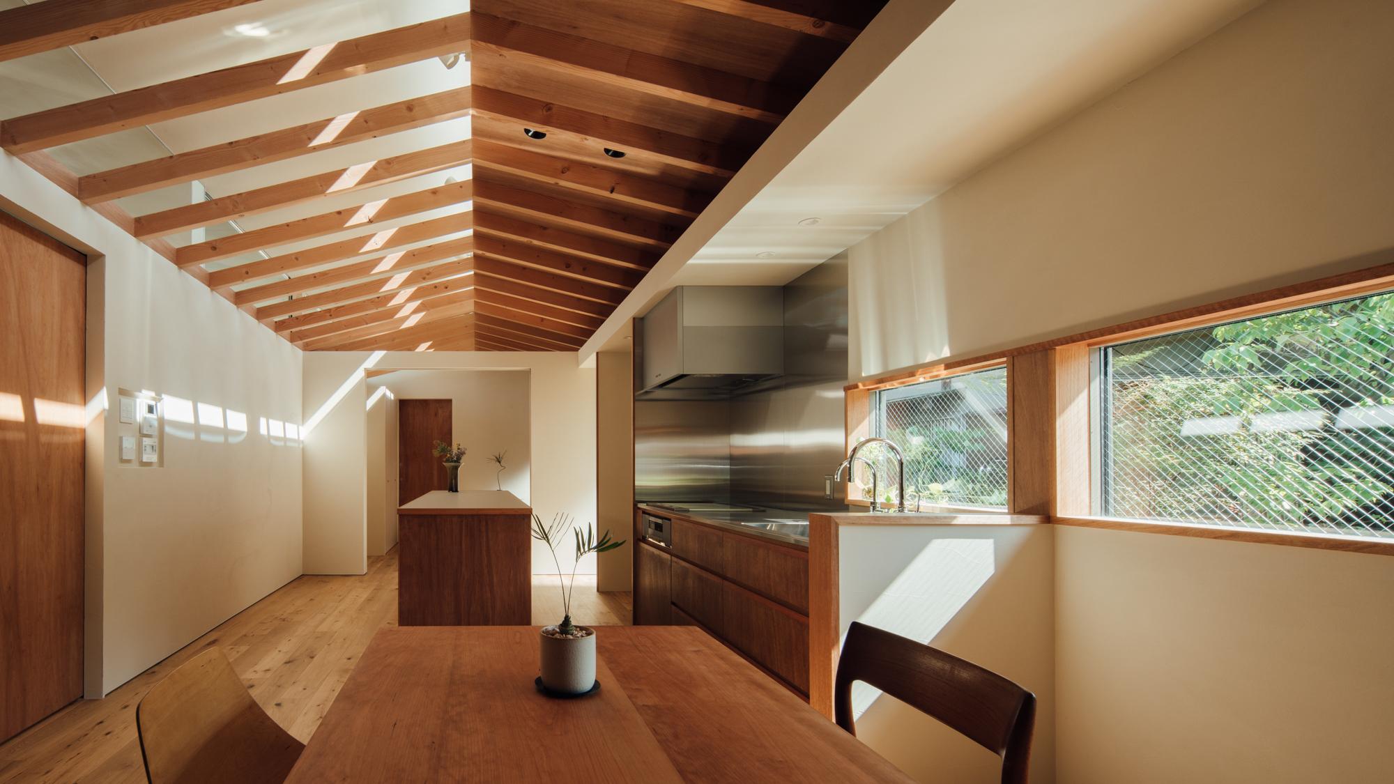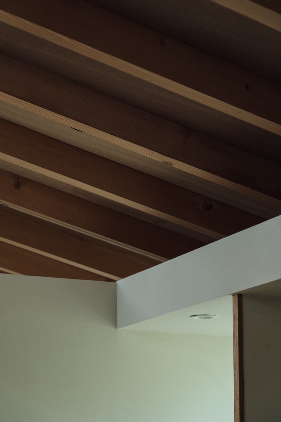 The architect determined the proportion of light and space through the basic form of the building and proposed an interior space that offers a sense of variation in both plan and section, considering that it is a residence for a monk. For the entrance and guest rooms, since frequent visitors are expected, an additional access was proposed, separating it from the living area. The simple rectangular living space was designed to be adaptable for future modifications. The living room, tatami room, and bedroom are connected by two sliding doors, allowing for expansion as needed. The master bedroom is constructed with a gable roof, where half of the space is an indoor area with a ceiling, and the other half is an outdoor space where light descends from the top of the structure. By incorporating various spaces within a small area, the house offers a rich experience. Behind the sloping ceiling, diagonal wood elements were added, and the tie bar was removed to express the abstract nature of the gable. The low ceiling covers the lower part of the house, allowing a harmony between the abstraction of the structure and the shaping of daily life.