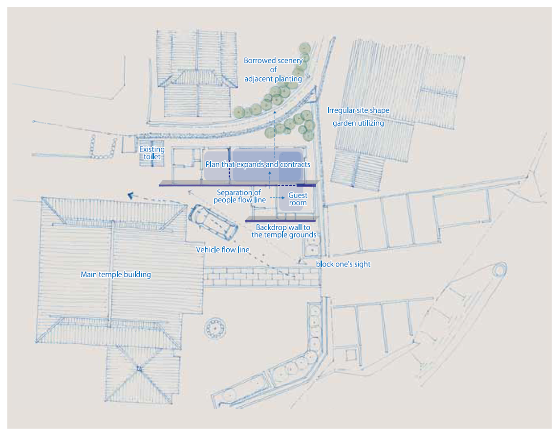 건축가는 건축물의 기본 형태를 통해 빛과 공간의 비율을 결정하고, 승려가 머무르는 공간임을 고려하여 평면과 단면에서 변화를 느낄 수 있는 실내 공간을 제안했다. 손님들의 왕래가 잦을 것으로 예상되는 출입구와 객실에는 생활 공간과 분리된 동선을 추가로 제안했다. 단순한 직사각형 모양의 생활 공간은 향후에도 변경 가능하도록 설계하였는데, 거실과 다다미방, 침실은 2개의 미닫이문으로 연결하거나 나누면서 필요에 따라 확장하거나 축소할 수 있다. 안방의 구조는 박공 구조로 되어 있다. 절반은 천장이 있는 내부 공간, 나머지 절반은 구조물의 꼭대기에서 빛이 떨어지는 외부 공간을 표현했다. 작은 공간 안에 다양한 공간을 두어 풍부한 경험을 제공할 것이다. 경사진 천장 뒷편으로는 사선 목재를 추가하고 타이 바를 없애 박공이 갖는 추상성을 표현했다. 낮은 천장은 주택의 하부에서의 생활을 수용하며 구조의 추상성과 삶의 조형성이 공존하게 한다.