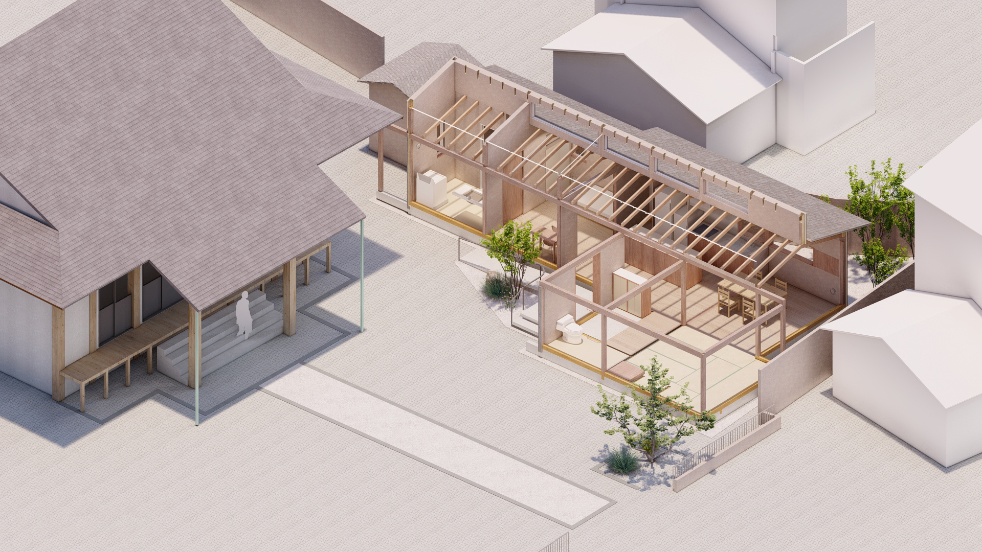 MyouKei-An House is a small, single-story wooden residence built for a retired monk on a narrow plot of land located along the approach to a temple. This house was designed with the dual purposes of ensuring privacy and enhancing the temple's landscape, maintaining a quiet appearance. The exterior of the house, walled with charred wood painted with a gray impregnating paint that harmonizes with the temple's tiled roof, gives a calm impression through its texture and improved durability. On the small plot, surrounded by various elements, greenery was incorporated to create a comfortable atmosphere, accessible from the interior spaces.