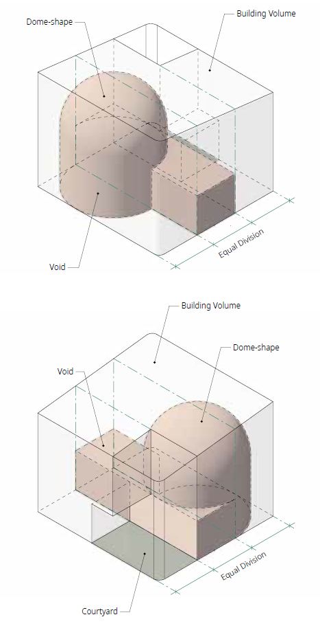 이 안뜰을 중심으로 거실과 식사 공간이 포함된 홀, 주방, 기타 활동 공간을 조성했다. 욕실과 개인 침실은 최소한의 크기로 2층에 있다. 침실의 가구는 방 배치에 따라 이동이 가능하다. 돔형의 홀은 거주자들의 삶을 수용할 수 있는 가장 특징적인 공간이다. 이 공간에서는 가족 모임이 이루어지며, 안뜰의 개방성과 넓은 보이드를 통해 아늑한 분위기를 연출한다. 이 덕분에 주택의 전체적인 형태는 닫힌 상자처럼 보이지만, 내부에서는 비좁은 느낌이 들지 않고 오히려 가족, 친구들과 친밀함을 느낄 수 있는 규모가 되었다. 1층에 마련된 타일 바닥과 테라스를 지닌 다이닝 공간, 발코니 공간을 형성하는 계단, 상징적인 탑 라이트 등은 주택임에도 공공시설의 단정한 분위기를 자아낸다. 이는 사적인 공간의 분위기를 지닌 2층과 대조를 이루며, 주택 내부에 다양한 분위기를 조성한다.