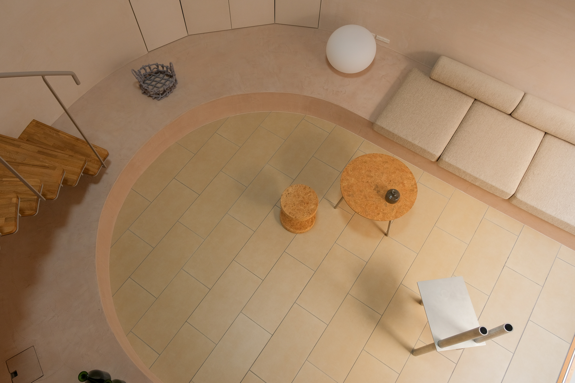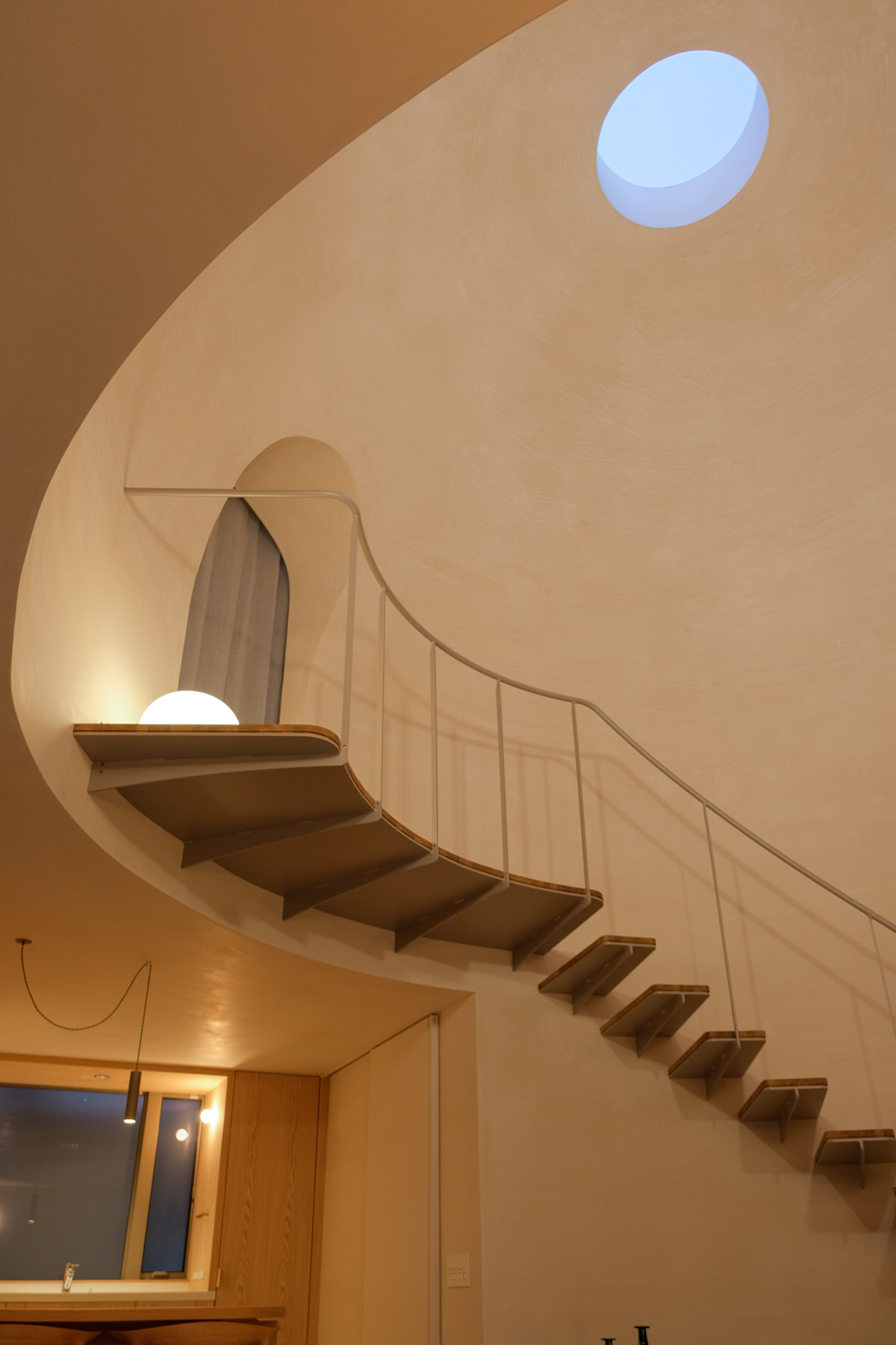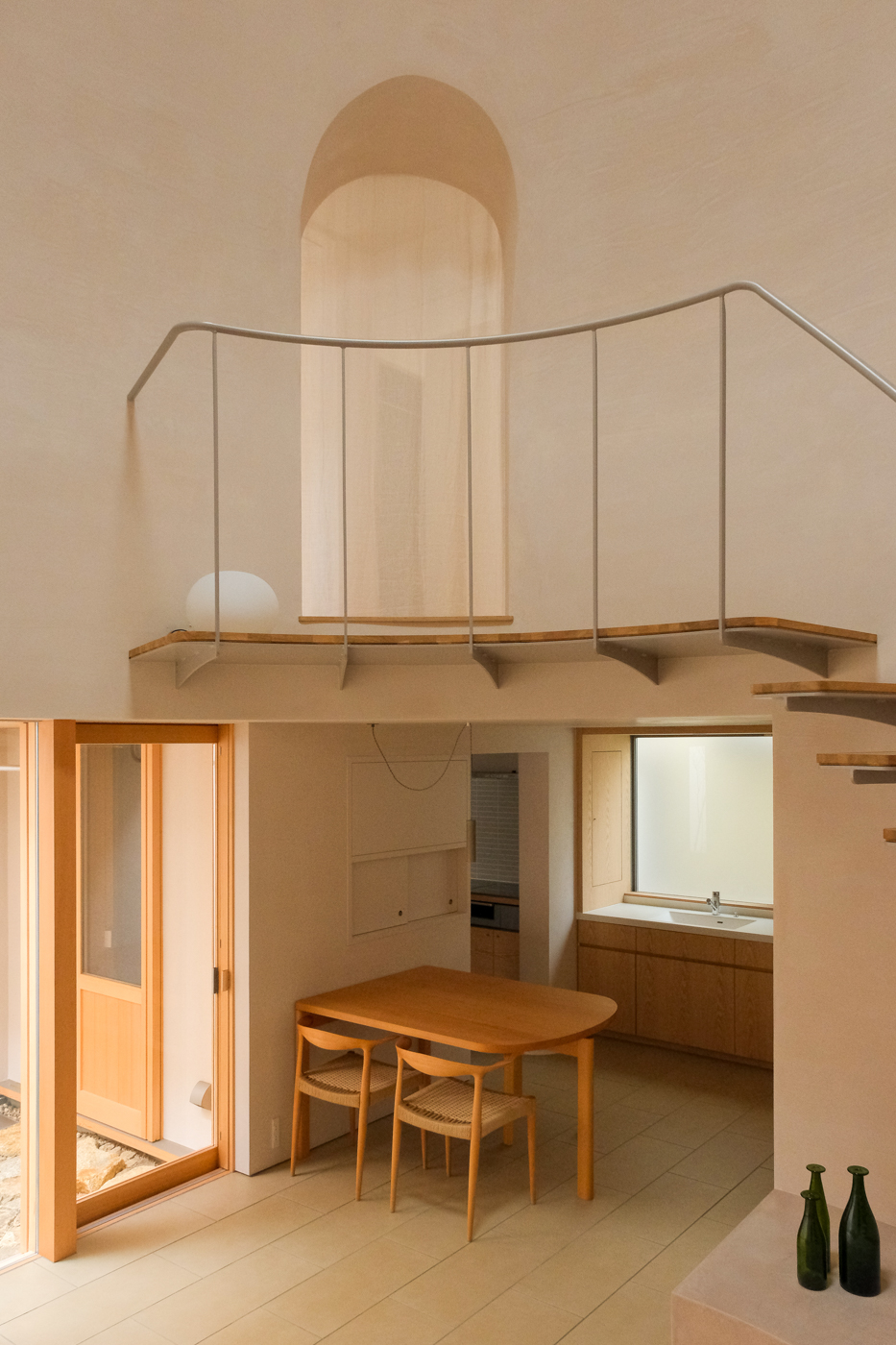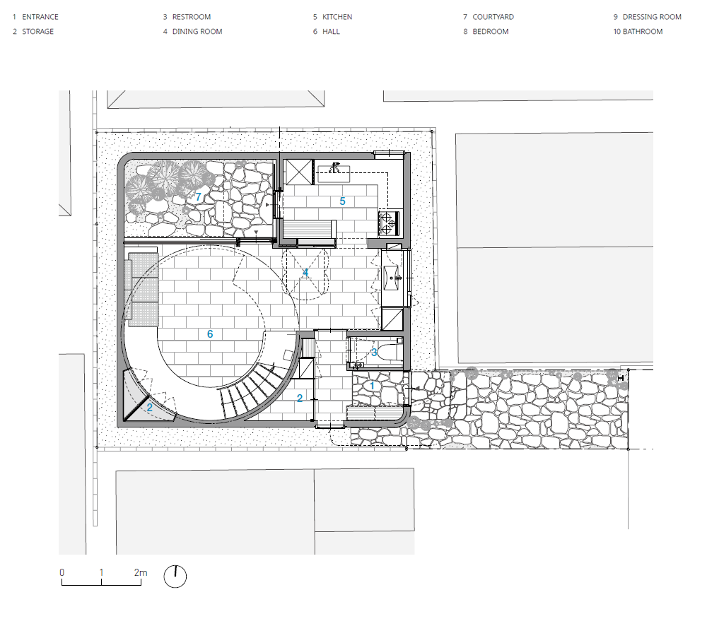 Around this courtyard, a hall that includes the living and dining rooms, the kitchen, and other activity areas was created. The bathroom and private bedrooms are located on the second floor and are kept to a minimal size. The bedroom furniture can be rearranged according to the layout of the room. The dome-shaped hall is the most distinctive space, adapting the residents' daily lives. This space is the location of family gatherings, and through the openness of the courtyard and the spacious void, a cozy atmosphere is created. Thanks to this design, although the house appears to be a closed box from the outside, it feels neither cramped nor isolated on the inside; rather, it fosters intimacy among family and friends. The first-floor dining area, with its tiled floors and terrace, the stairs forming a balcony, and the iconic top light, give the house the neat atmosphere of a public structure. This contrasts with the private atmosphere of the second floor, creating a variety of moods within the home.