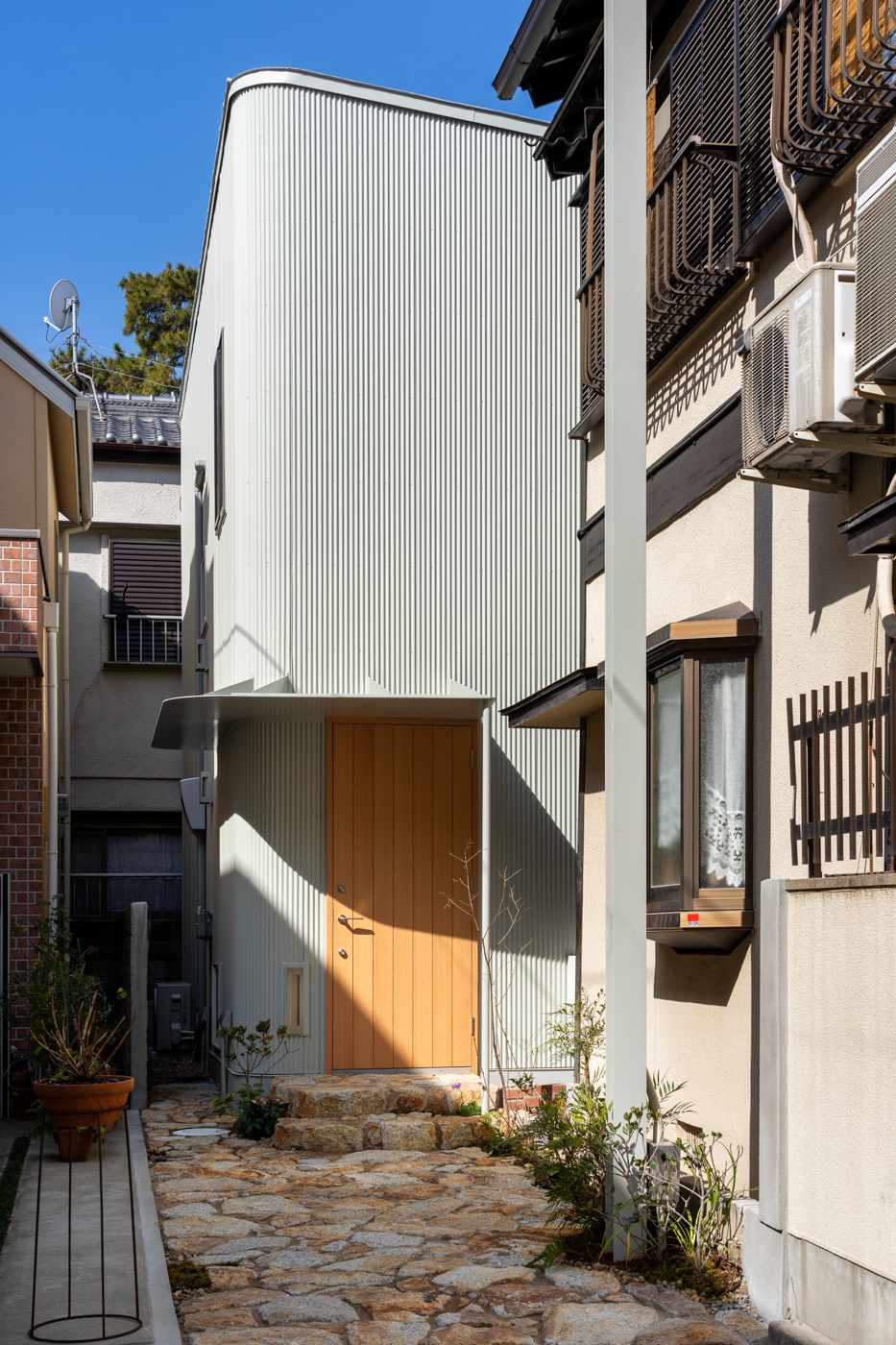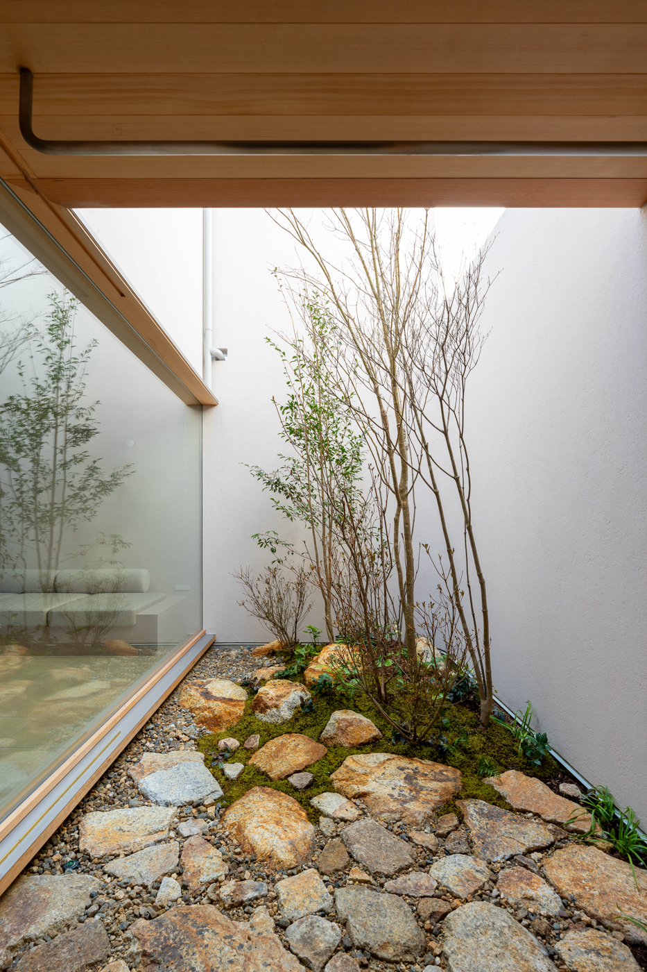 Shukugawa House was built in a quiet residential area dense with luxury homes in Hyogo Prefecture, surrounded by abundant nature. Due to the high cost of land, the plots in this area are subdivided and connected, resulting in tightly packed residences. Shukugawa House was planned for a small plot, surrounded by two-story houses. Given the need for privacy, the conditions made it difficult to open the house outward. The architect proposed overcoming these limitations by boldly separating the house from its surroundings, creating an inner courtyard and a dome space to form an independent internal environment. The building's footprint was maximized within the small plot. The box-shaped, two-story wooden structure is shielded from the view of the surrounding houses. There is a courtyard on the well-lit northern corner, allowing the residents to experience the changing seasons and nature from within the home.