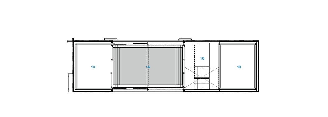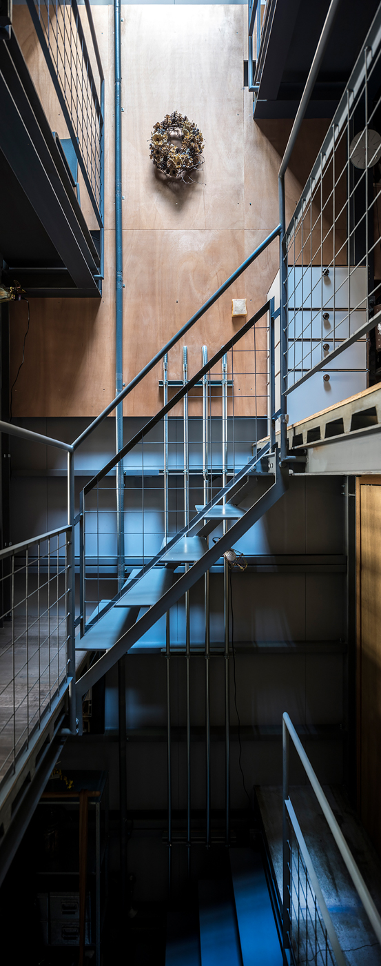 건축가는 좁고 깊은 대지로 인해 자연스럽게 생긴 전면부와 깊이감을 반영하여 병치된 여러 개의 경사 축과 수직 축을 통해 다양한 거리감과 깊이감을 연출하였다. 레벨차가 있는 방은 계단을 사이에 두고 나선형으로 교차되며, 대지의 입지에 따라 자연스럽게 제한된 창의 면적은 레이아웃을 통해 섬세하게 확보했다. 철골 브레이스 구조로 이루어진 적층 구조의 집은 매우 단순한 층 구조를 지니면서, 중간 격자에서 옥상까지 전체 높이에 걸쳐 계단식 구조로 연결되어 있다. 주택 내의 동선에는 일부러 복잡성을 결합하였는데, 이는 직접적인 연결로 인한 구성의 단순성과 형식성 그리고 공간 인식의 단조로움이 발생하지 않게 한다.