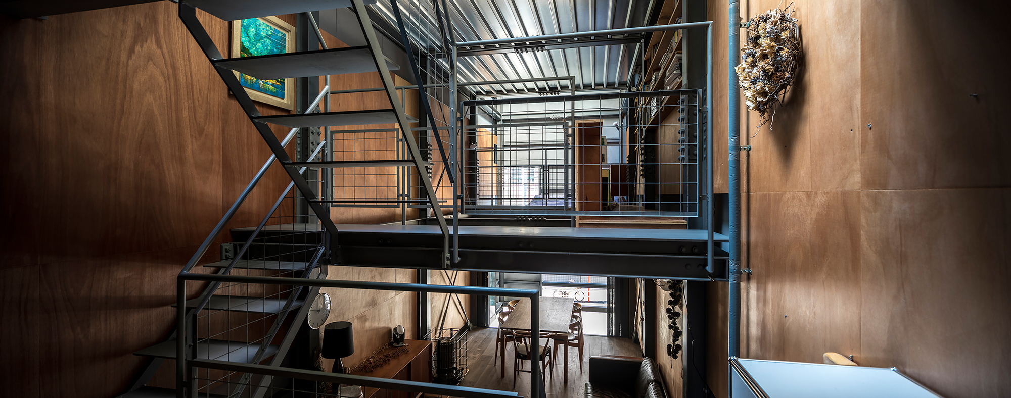 The architect used the narrow and deep plot to naturally create a sense of depth and frontality, achieved through juxtaposed sloping and vertical axes that produce a variety of spatial perspectives. Rooms at different levels intersect in a spiral manner, separated by stairs, while the limited window area—due to the location of the plot—was carefully optimized through the layout. The house, built with a steel brace structure, features a simple, layered design, where a stair-step arrangement connects the entire height of the building from the intermediate grid to the rooftop. The interior intentionally incorporates complexity to avoid the monotony of direct connections and the potential simplicity or formality of the layout, ensuring a more dynamic spatial experience.