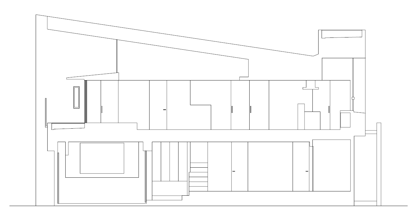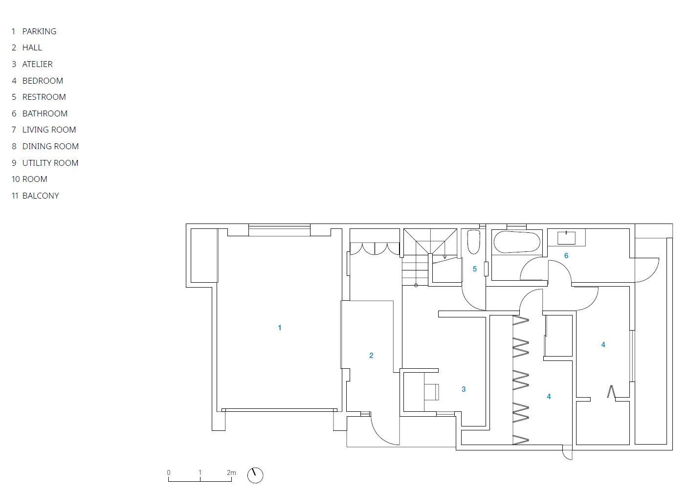 대지는 도시의 주요 도로가 움푹 들어간 강변의 주택가에 위치하며, 주택의 서측으로 크고 긴 건물이 자리 잡고 있다. 건축주는 다소 어수선한 주변 환경과 어느 정도 경계를 지니면서도 개방감을 느낄 수 있는 주택을 원했으며, 차고가 필수 공간이었다. 이에 따라 차고지에 필요한 공간을 정한 후 대지의 특성을 살릴 수 있는 계획을 세웠다.