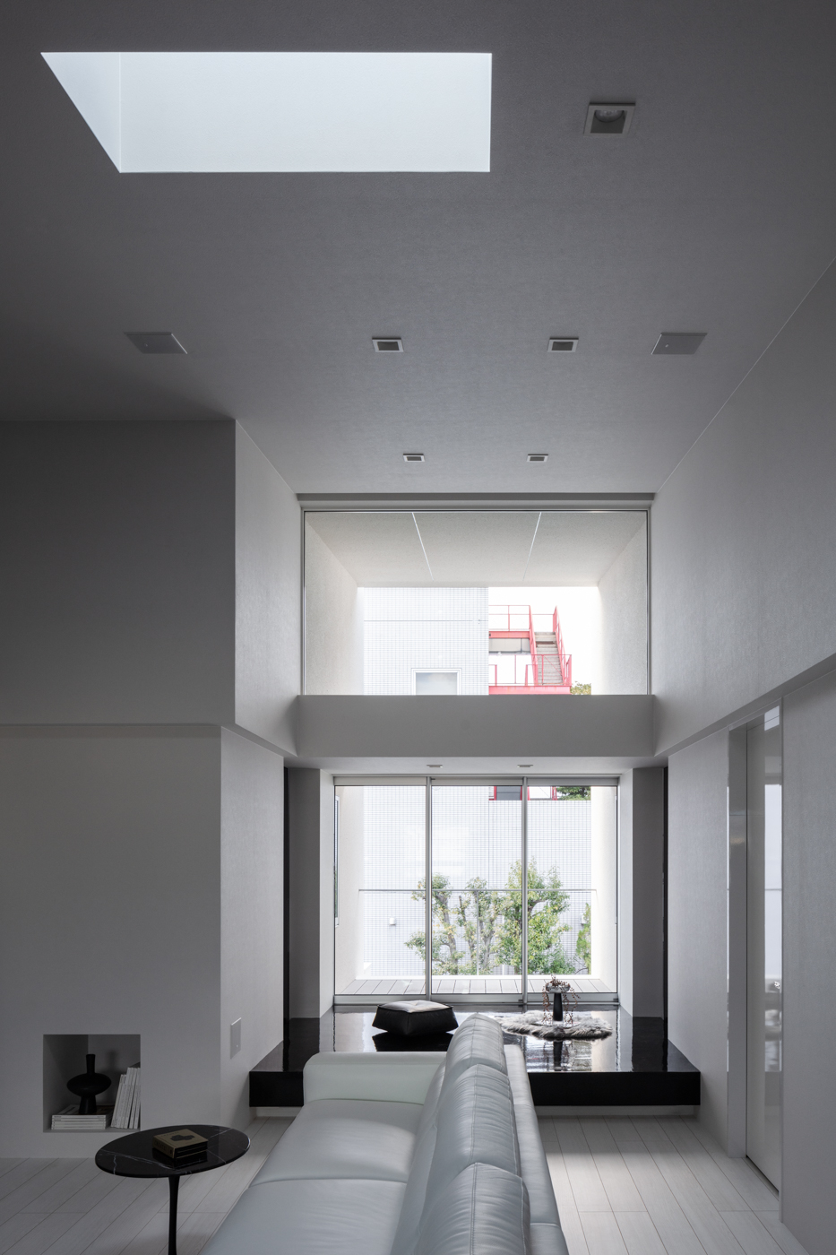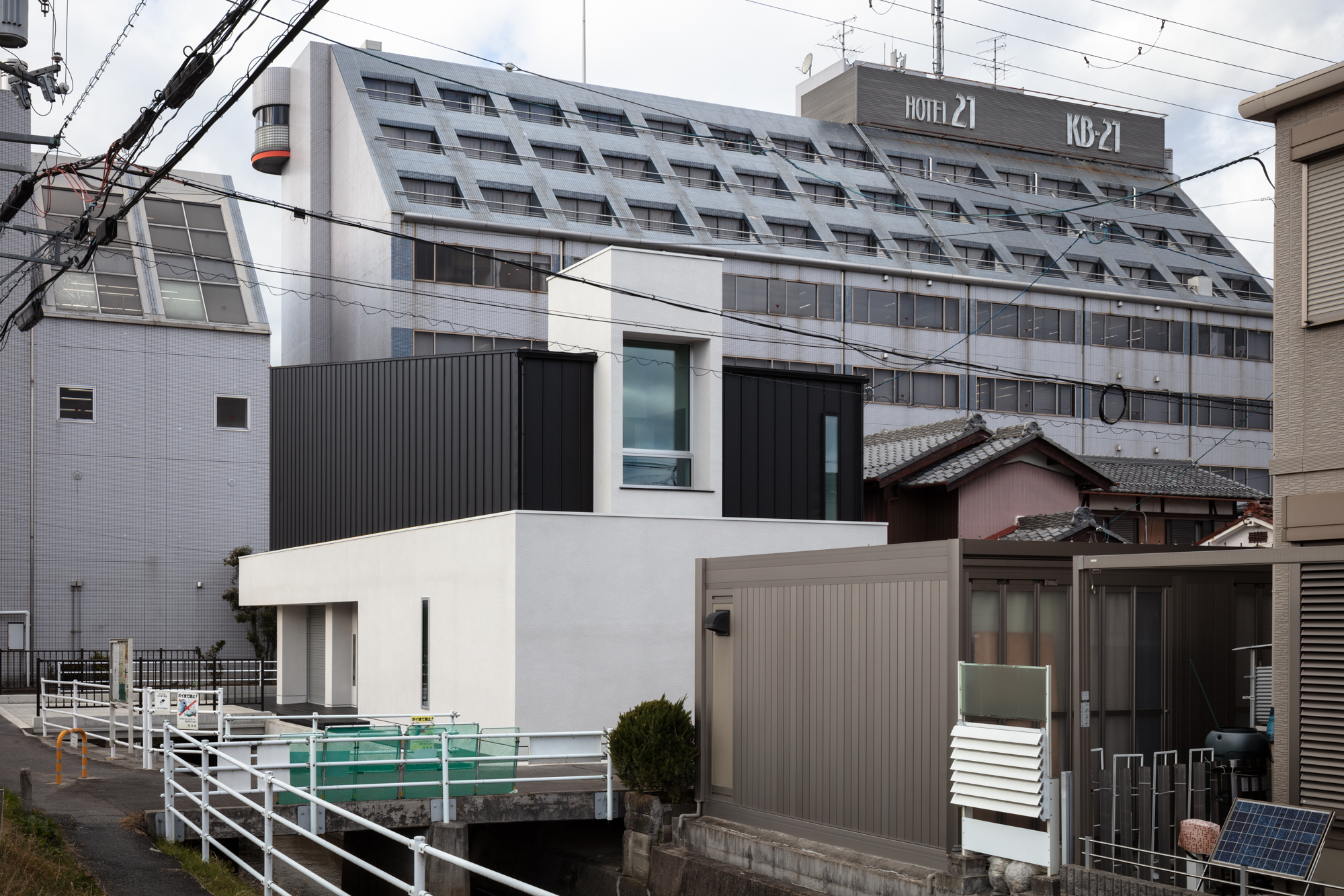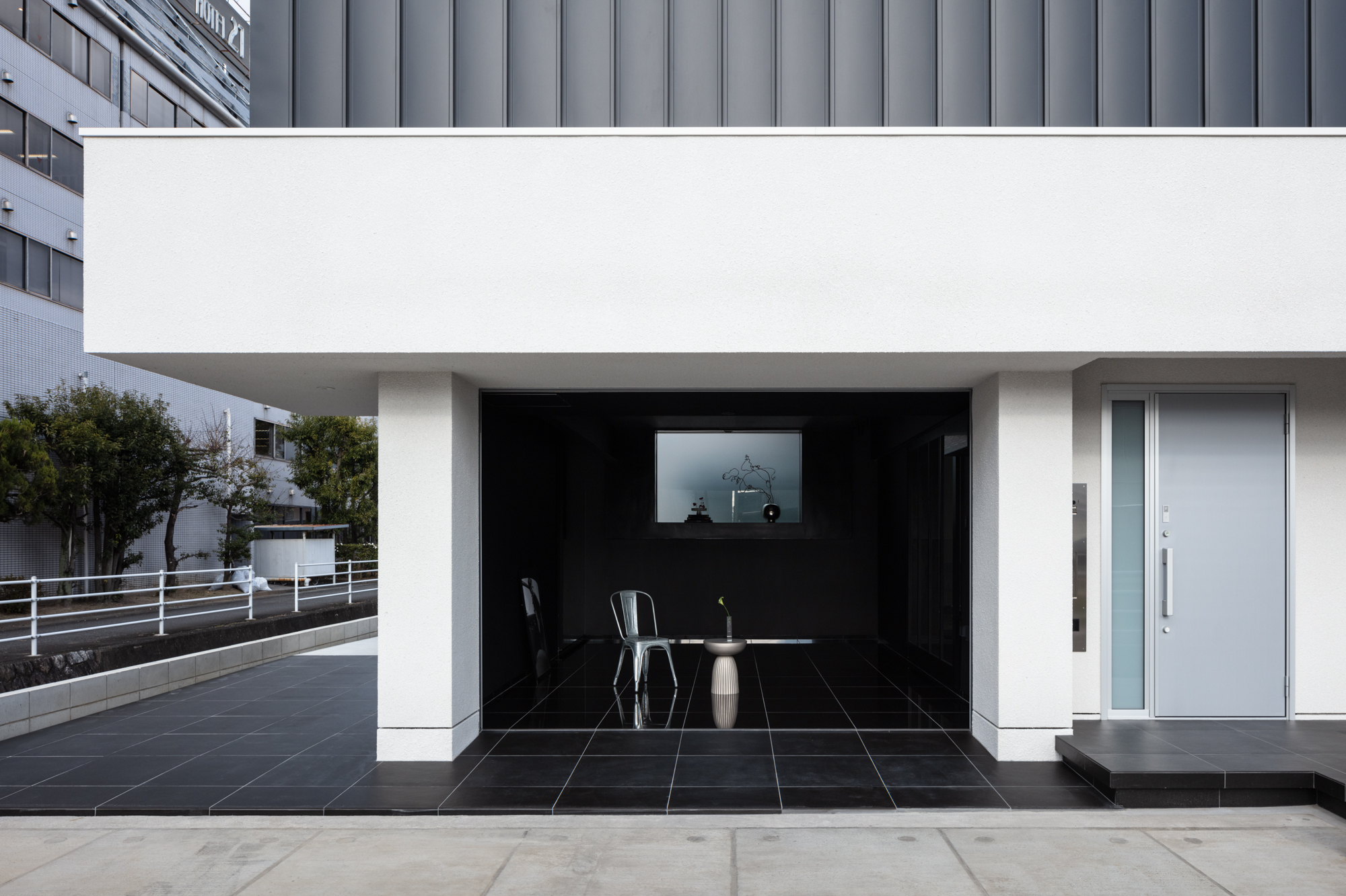동서로 이어지는 좁고 긴 대지에 맞게 건축물을 배치하면서 사생활을 보호할 수 있도록 벽의 개방은 최소한으로 했다. 대지의 서측으로 인접한 크고 긴 건물은 대지와 마주한 방향으로 개방적인 외부 공간을 가지고 있었다. 건축가는 이를 최대한 활용하여 인접한 건물을 향해 입구와 발코니를 두고 시야를 개방하여 객실 내부를 조망할 수 있게 하였다. 이렇게 다듬어진 전망은 도시화된 풍경을 자아내며 실내의 세련된 분위기를 연출한다. 대지에서 건물이 차지하는 비중이 큰 만큼 납작한 지붕과 차고의 대비가 만들어 내는 자유롭고 생동감 있는 존재감 속에서 외벽의 스프레이 코팅과 갈바륨 마감의 조화가 돋보인다. 출입구의 슬라이딩 도어를 열면, 내부 공간은 홀과 극적으로 확장되어 합쳐진다. 실내는 블랙 톤으로 통일되어 있는데, 무광 유리에 약한 빛이 스며들어 주택의 여러 물체와 창턱에 자리잡은 오브제의 윤곽을 강조한다. 광택이 나는 바닥의 반사는 색다른 상황을 연출한다. 2층의 LDK는 동측과 서측의 풍경을 연결하는 입구와 경사가 높은 천장을 활용하여 역동적인 느낌으로 제안했다.