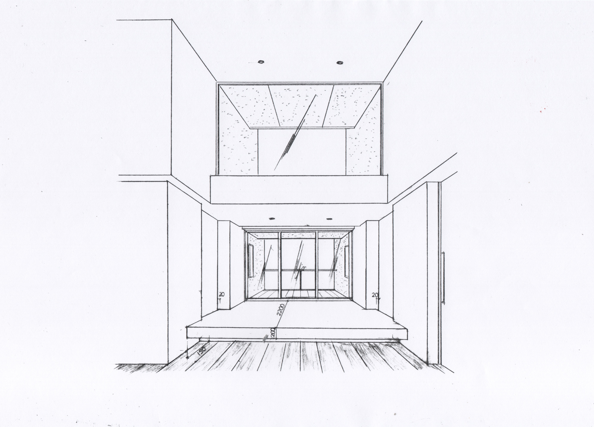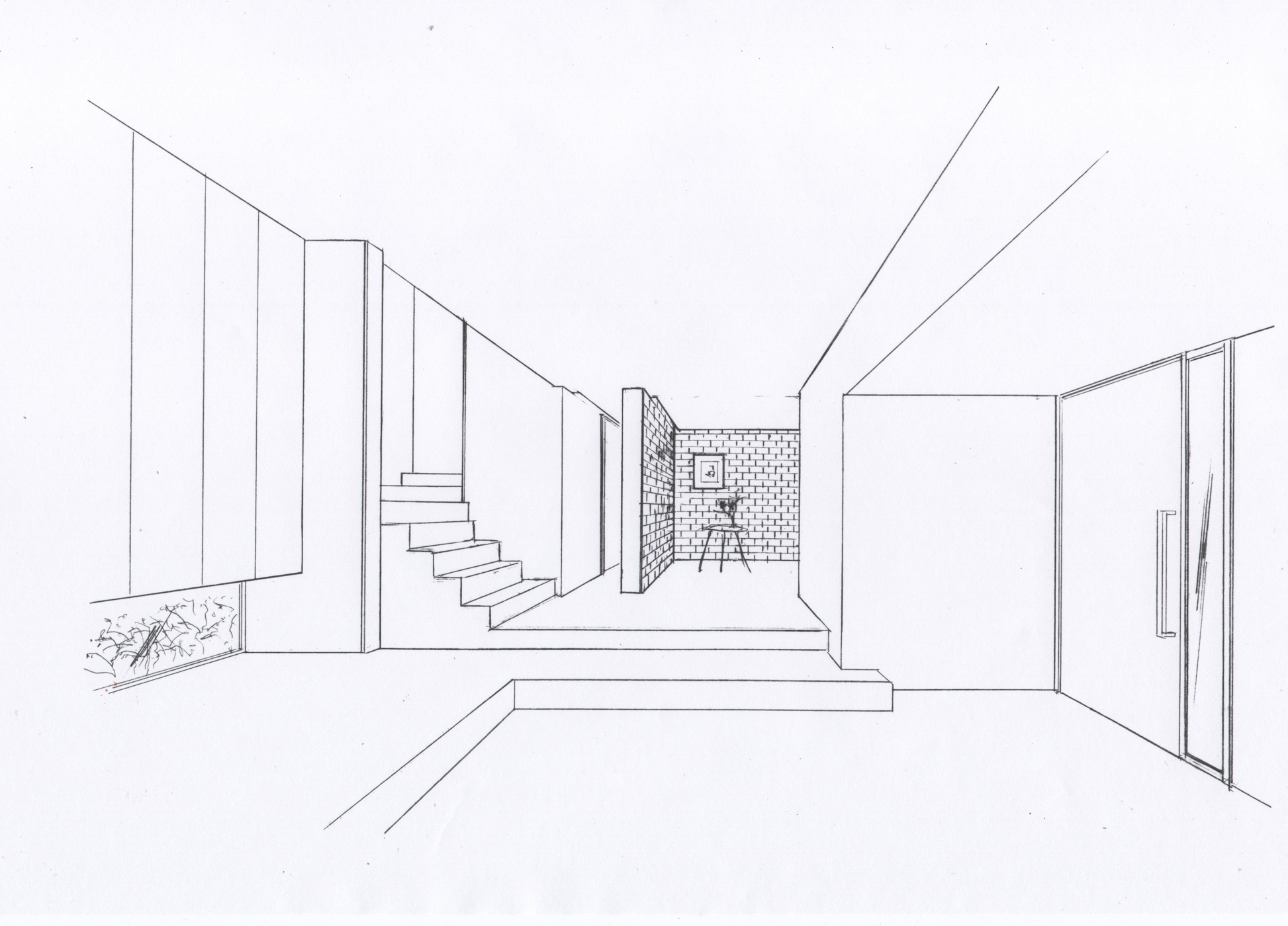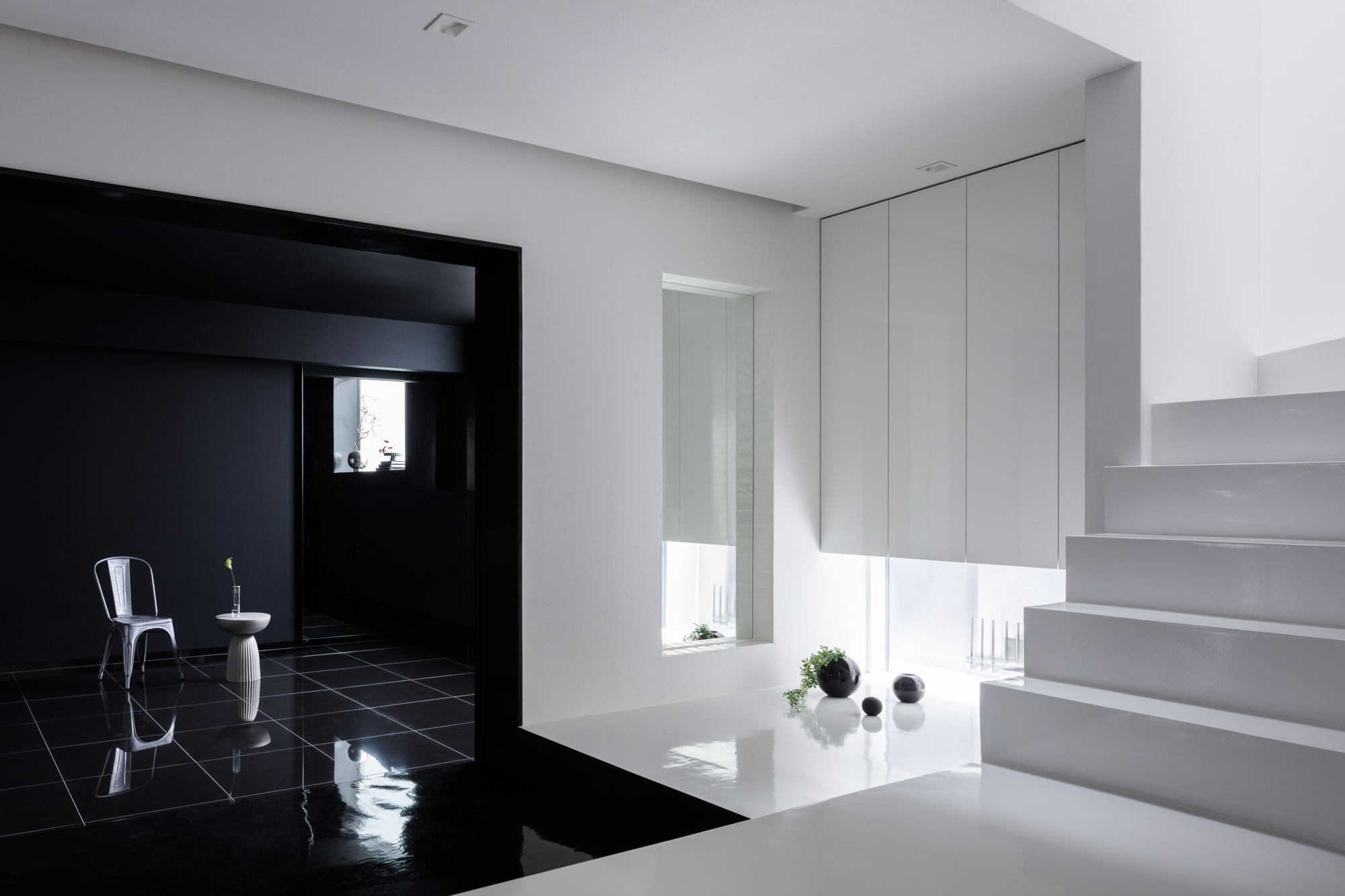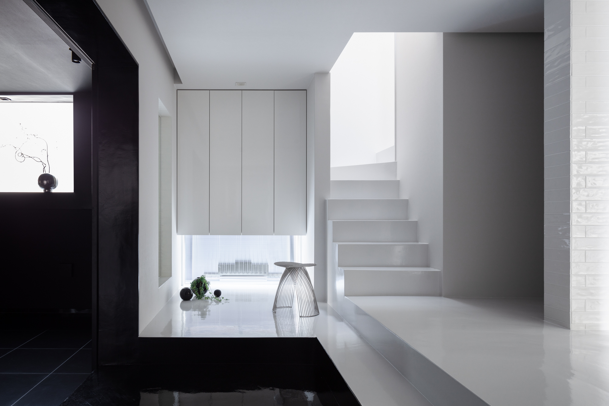 동서로 이어지는 좁고 긴 대지에 맞게 건축물을 배치하면서 사생활을 보호할 수 있도록 벽의 개방은 최소한으로 했다. 대지의 서측으로 인접한 크고 긴 건물은 대지와 마주한 방향으로 개방적인 외부 공간을 가지고 있었다. 건축가는 이를 최대한 활용하여 인접한 건물을 향해 입구와 발코니를 두고 시야를 개방하여 객실 내부를 조망할 수 있게 하였다. 이렇게 다듬어진 전망은 도시화된 풍경을 자아내며 실내의 세련된 분위기를 연출한다. 대지에서 건물이 차지하는 비중이 큰 만큼 납작한 지붕과 차고의 대비가 만들어 내는 자유롭고 생동감 있는 존재감 속에서 외벽의 스프레이 코팅과 갈바륨 마감의 조화가 돋보인다. 출입구의 슬라이딩 도어를 열면, 내부 공간은 홀과 극적으로 확장되어 합쳐진다. 실내는 블랙 톤으로 통일되어 있는데, 무광 유리에 약한 빛이 스며들어 주택의 여러 물체와 창턱에 자리잡은 오브제의 윤곽을 강조한다. 광택이 나는 바닥의 반사는 색다른 상황을 연출한다. 2층의 LDK는 동측과 서측의 풍경을 연결하는 입구와 경사가 높은 천장을 활용하여 역동적인 느낌으로 제안했다.