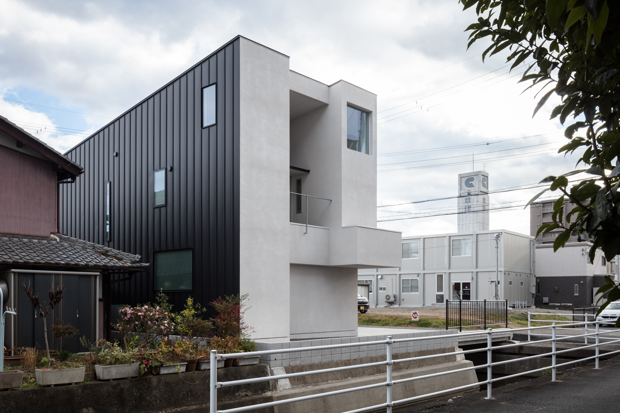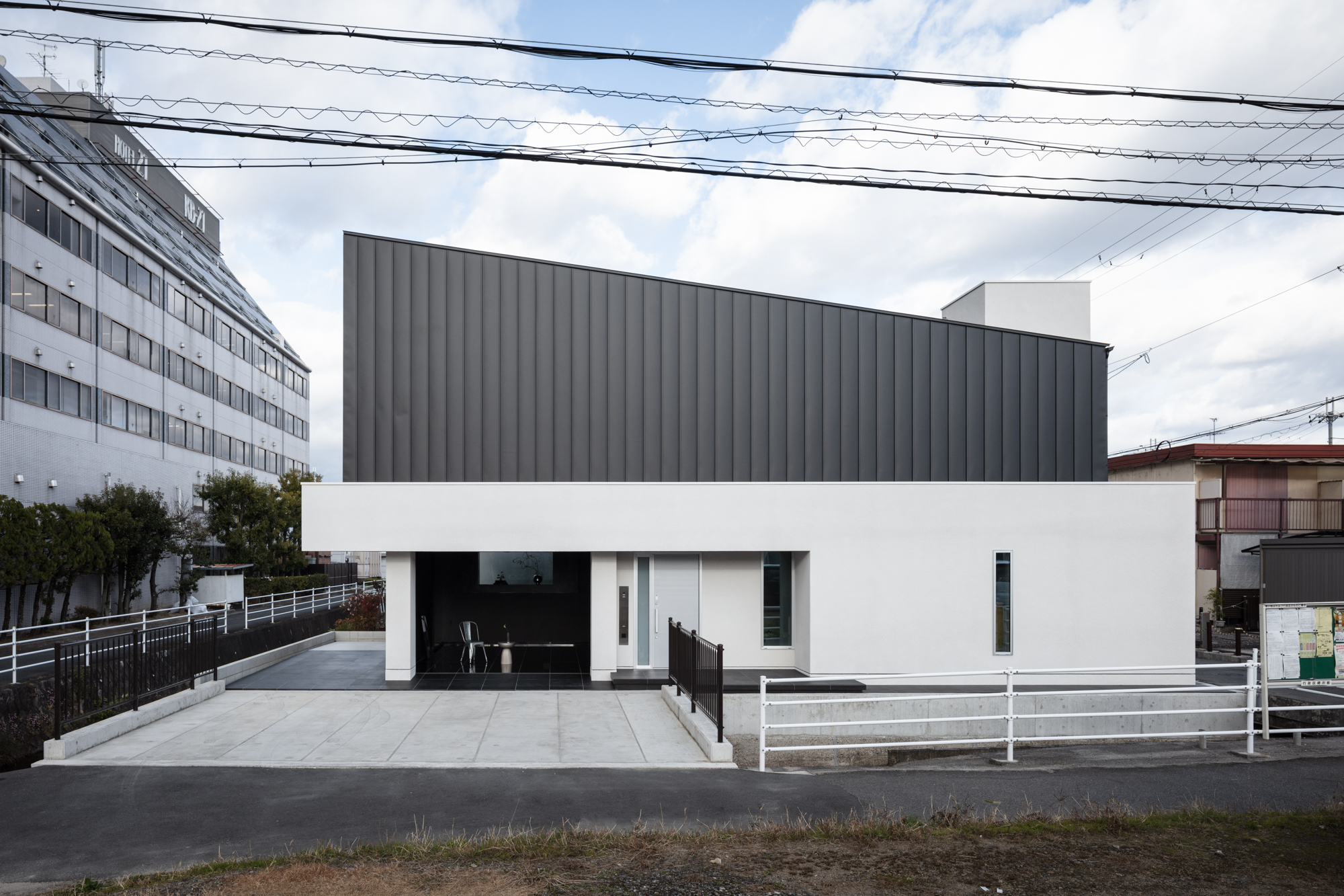 This site is located in a residential area along a riverside, recessed from the city's main road, with a large, long building situated to the west. The client desired a home that would provide a sense of openness with a boundary separating it from the rather cluttered surroundings. A garage was also a necessary feature. Based on this, a plan was developed that allocated the required space for the garage and maximized the characteristics of the plot.