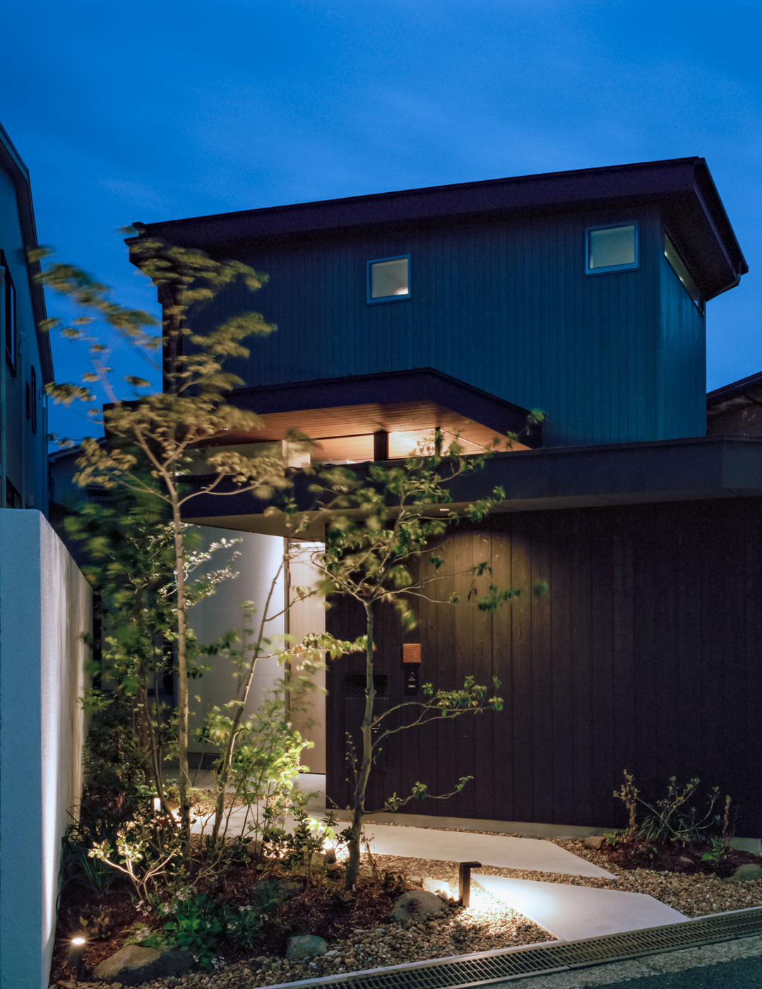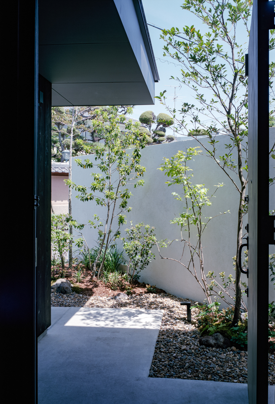 The architect blurred the simple distinction between interior and exterior to create a sense of continuity. Eaves extending into the interior were one of the elements used to draw the outside in. The walls are made from charred cedar, a material commonly used in traditional Japanese architecture. To further blur the boundaries, the flooring extends inward, matching the traditional atmosphere of Fujiidera, a historic temple area. Through the interplay of light and shadows inside and out, the house creates a sense of distance and depth. Small areas are kept dim to create a feeling of expansion, while windows and gardens are positioned at the ends of hallways and in rooms to direct the view. By minimizing artificial lighting and using natural light to illuminate parts of the interior, the house offers a layered spatial experience.