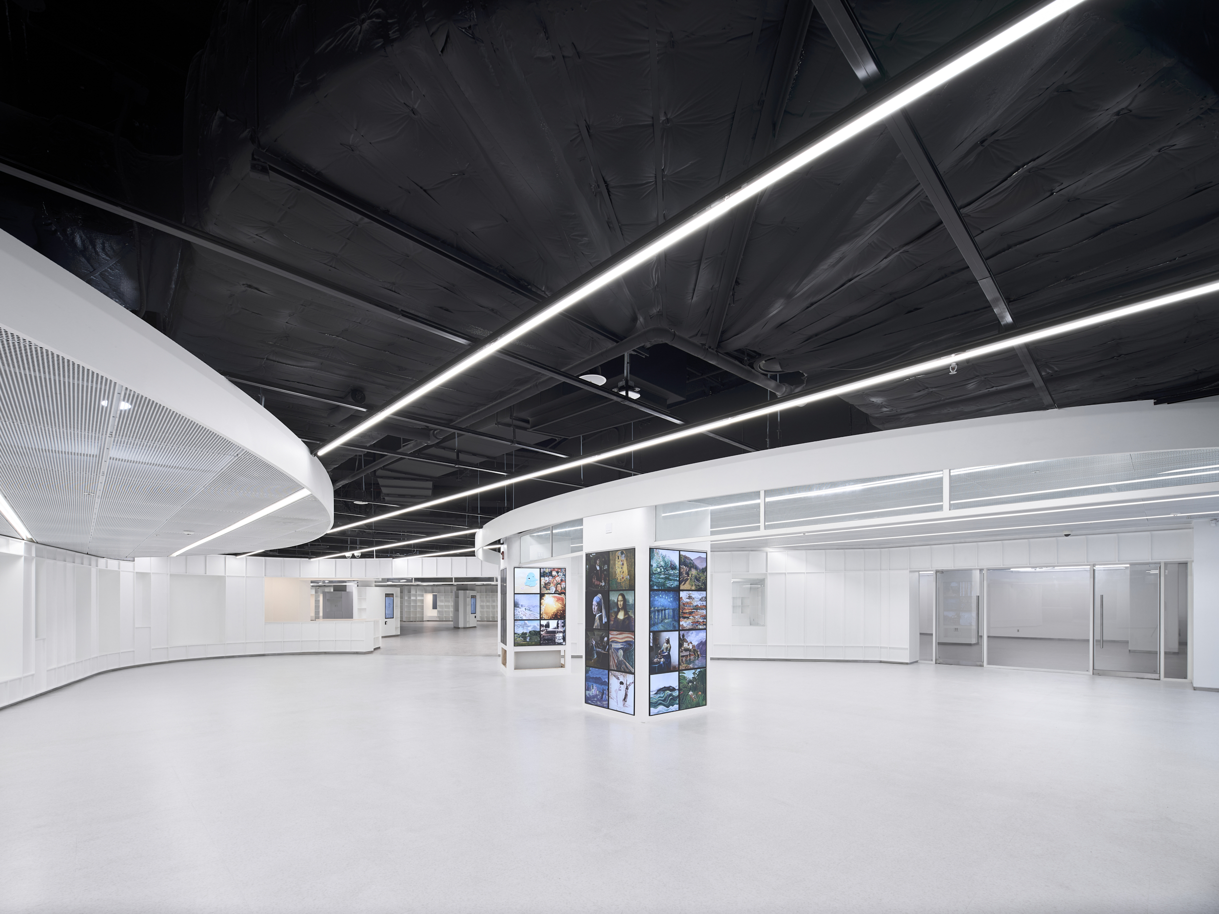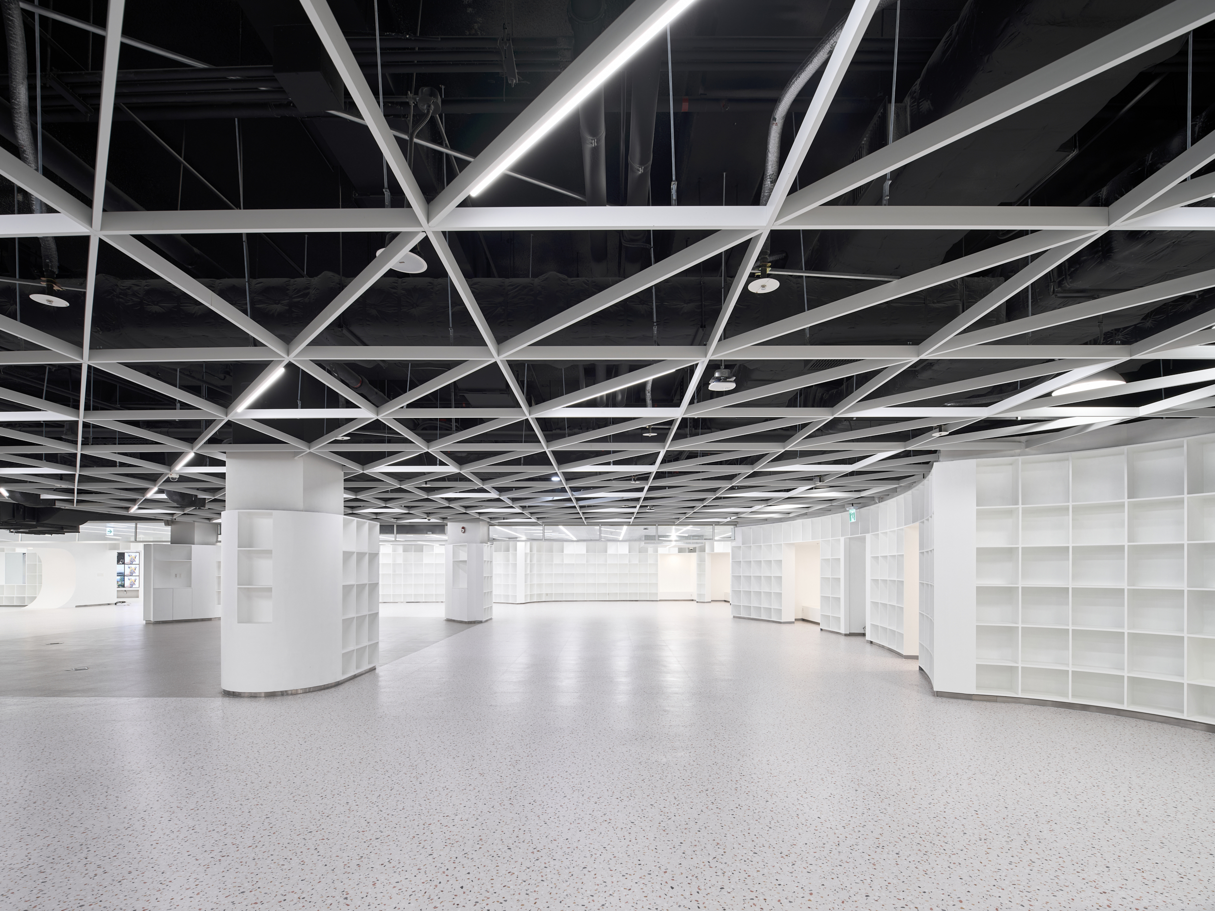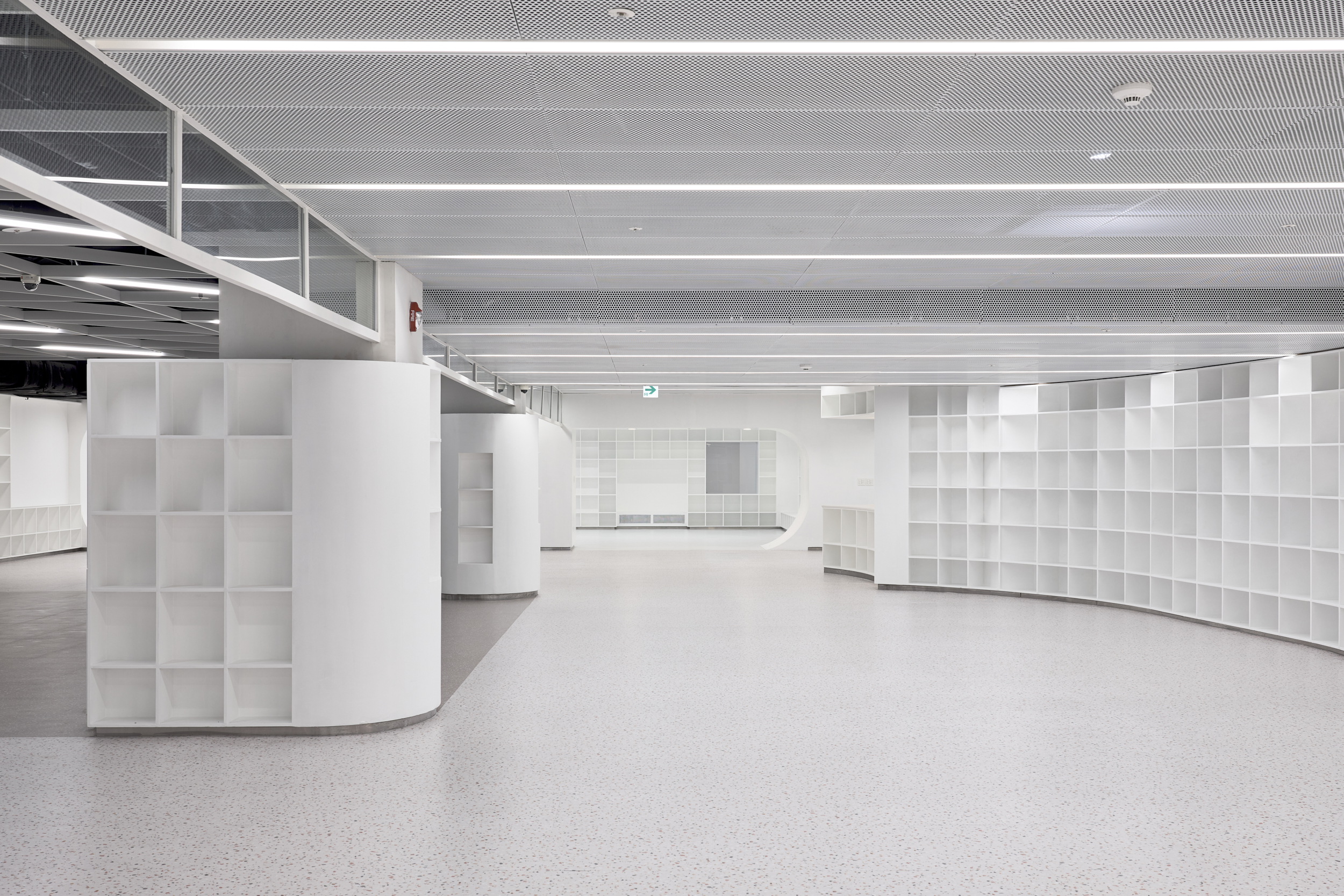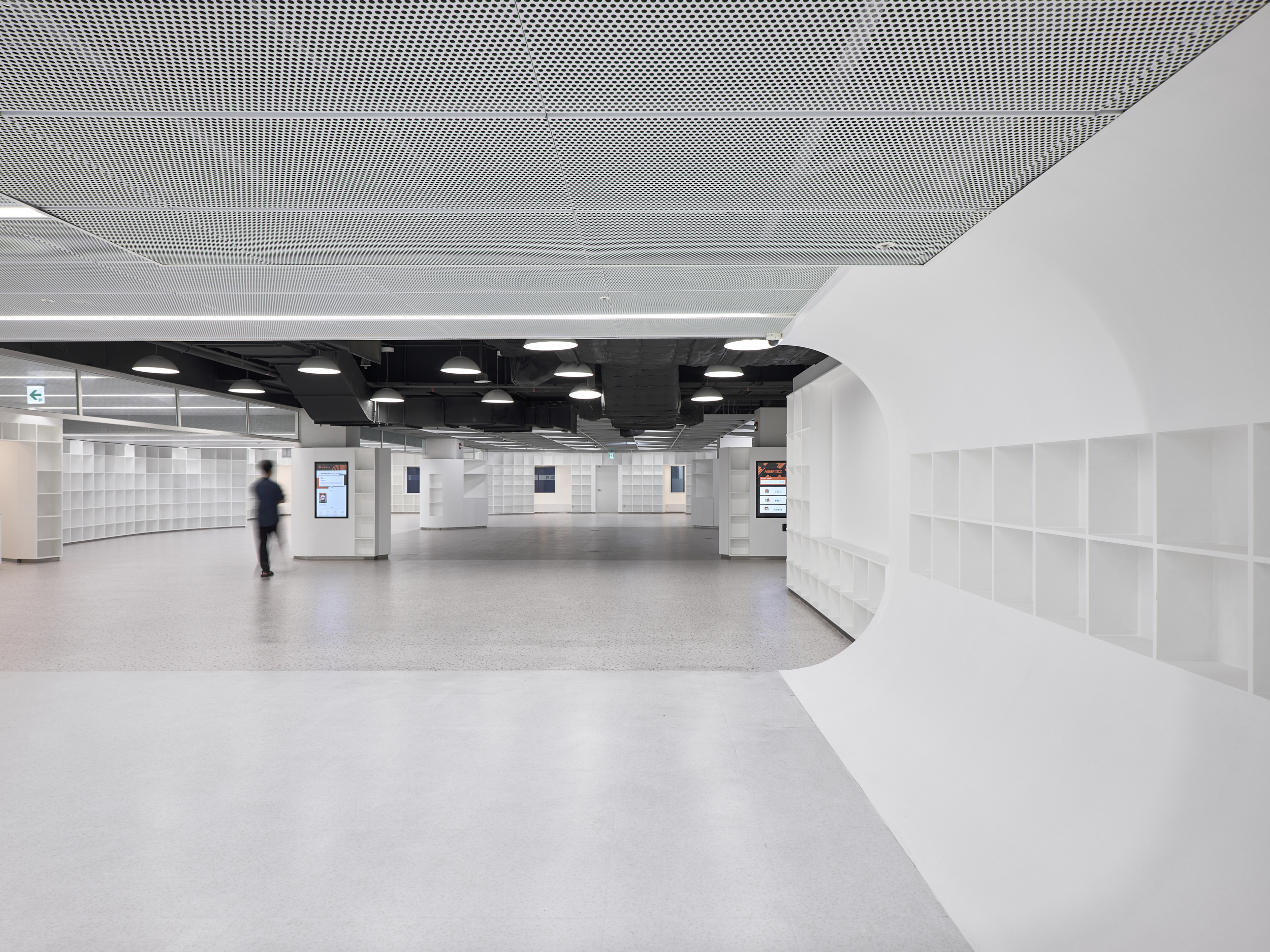 Seoul ART CHAEKBOGO is a project to aim at revitalize an unused space in the basement of Gocheok Sky Dome, located in the southwestern area of Seoul where public cultural spaces are lacking. Originally planned as an underground parking lot, the space posed challenges due to its complex facilities, low ceiling height, and columns over one meter wide that were scattered throughout, making it difficult to use the area effectively. The designer overcame these spatial and site limitations through remodeling, creating a multi-purpose cultural space that combines exhibitions, a library, a bookstore, a café, and a rest area centered around art books. Instead of adding complexity with excessive design, the space was intentionally simplified, creating an environment where people can visit, discover, and interact with the space. Like an art book that fills blank pages with art, this place can host a variety of programs. One of the main goals was to conceal the disorganized array of irregular columns while utilizing them. The space was designed to allow visitors to wander freely among the columns as in forest, and the bookshelves were designed to fold and curve around the columns like pages of a book. Aside from the essential walls, partitions were minimized so that visitors could explore the area without following a predetermined route.