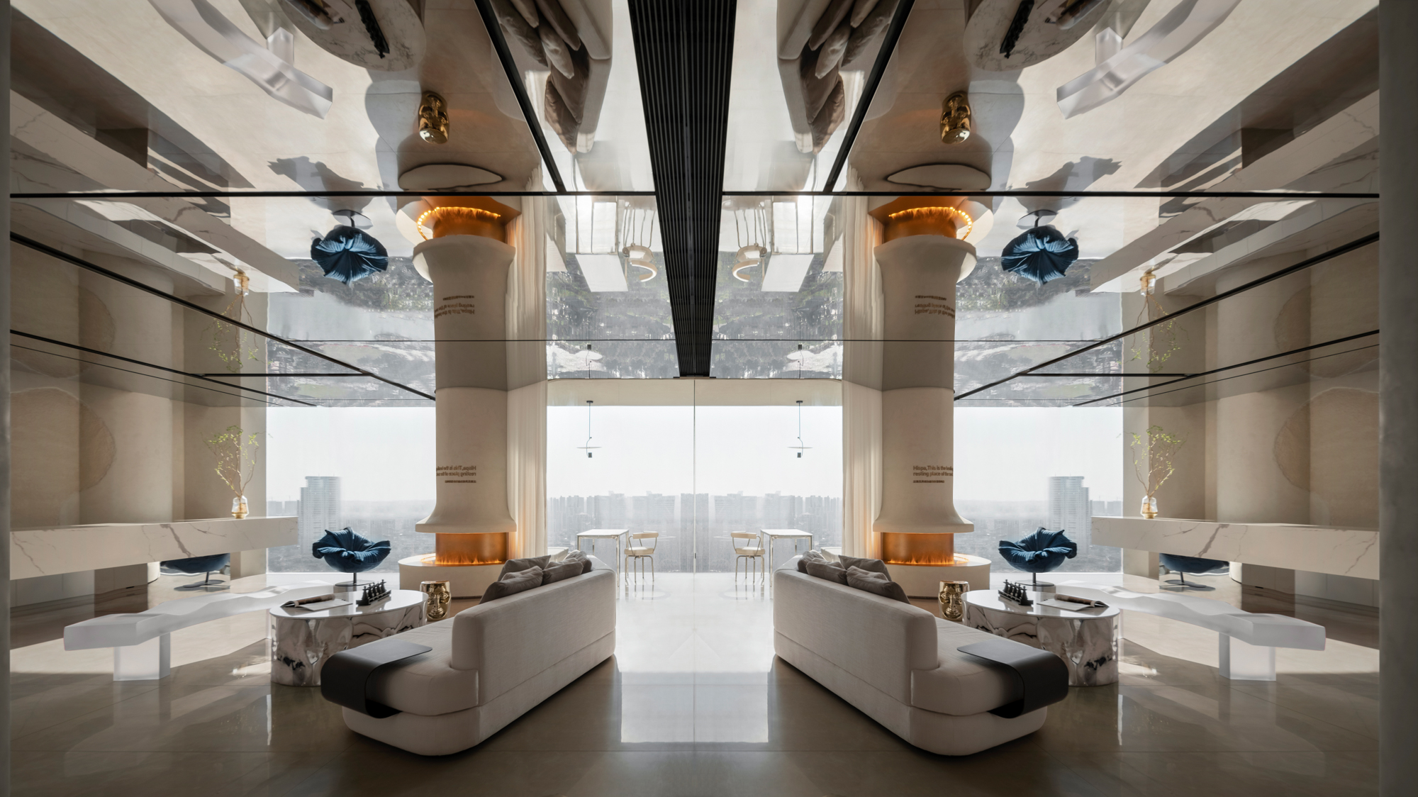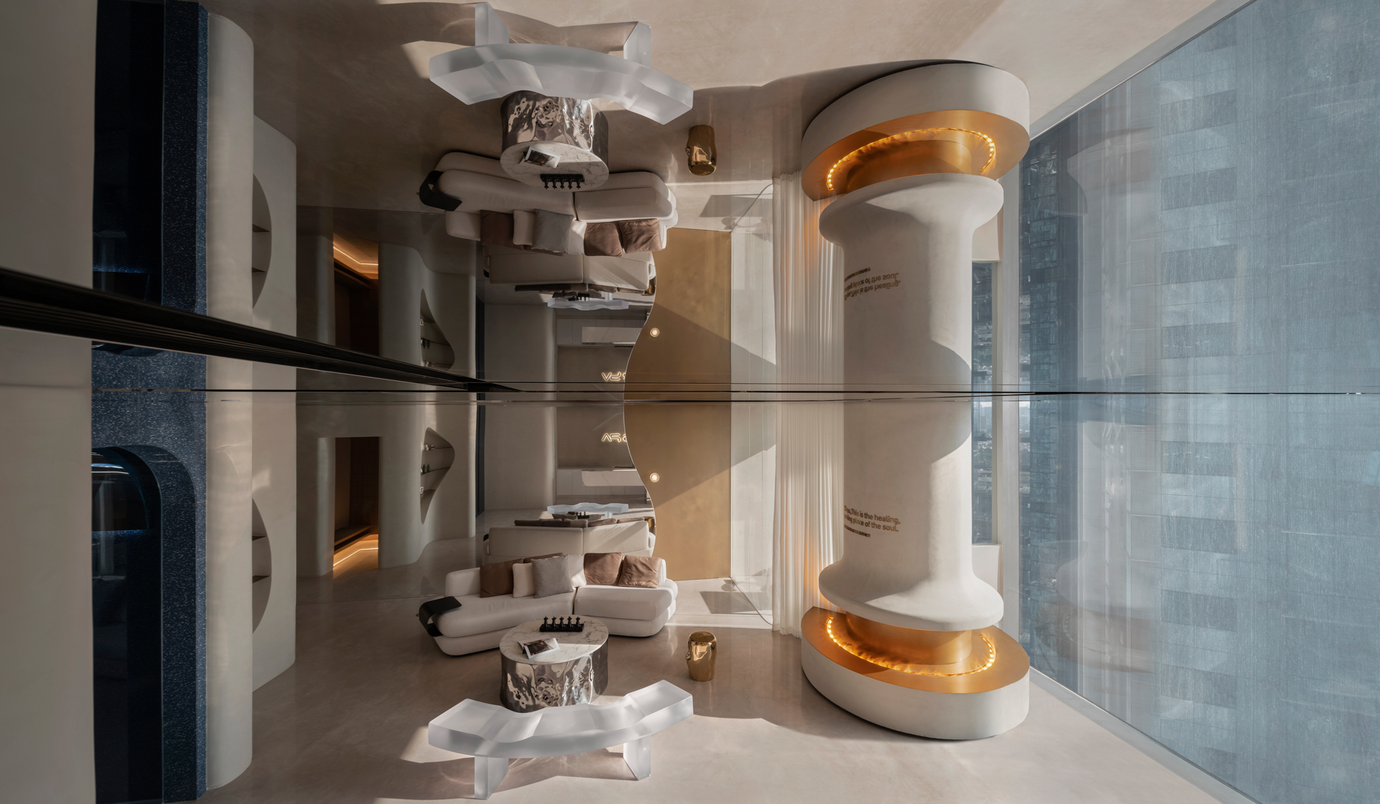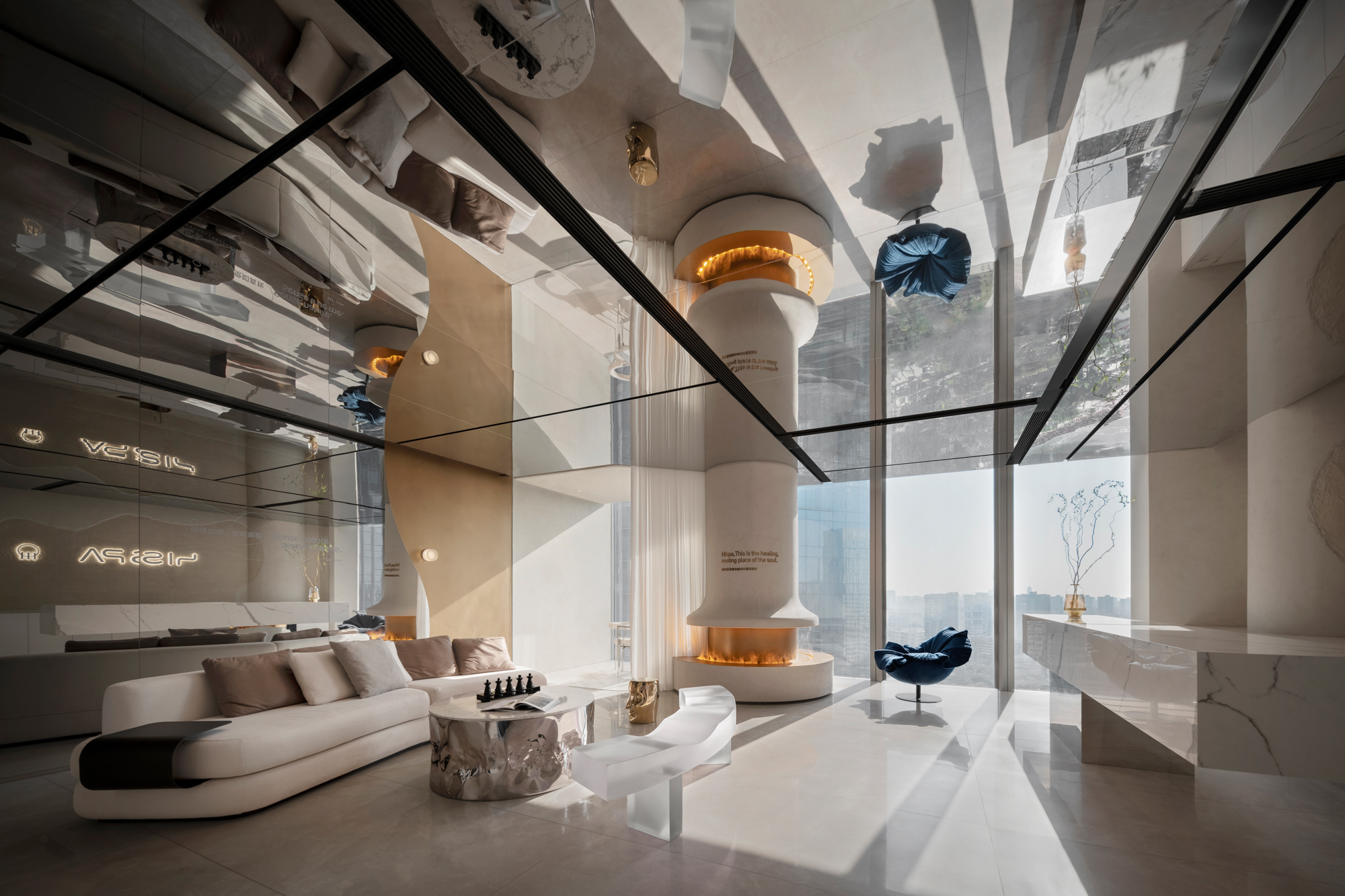 Hispa offers a sensory healing and spa experience in the heart of the CBD, housed within an office building. The entrance, reminiscent of the deep blue ocean, and the hallway surrounded by white noise, define "cool" and "gentleness" in a local context and global commercial trends. The glass facade refracts light, creating the sensation of rippling water. The stainless steel ceilings in the entrance, hallway, and salon area reflect the city's skyline, while a 2.6-meter-high cracked mirror forms a parallel world of the city, offering a multidimensional sensory experience. Light and shadow contrast with the rough texture of natural stone, creating a delicate, artistic flow. To complement what could otherwise be perceived as a cool tone, round and inclusive elements drawn from the brand's identity were introduced. These include brightly colored, curved furniture, a circular silver marble table, and an electronic fireplace tucked into a rounded corner, all designed to provide a warm and comfortable atmosphere.