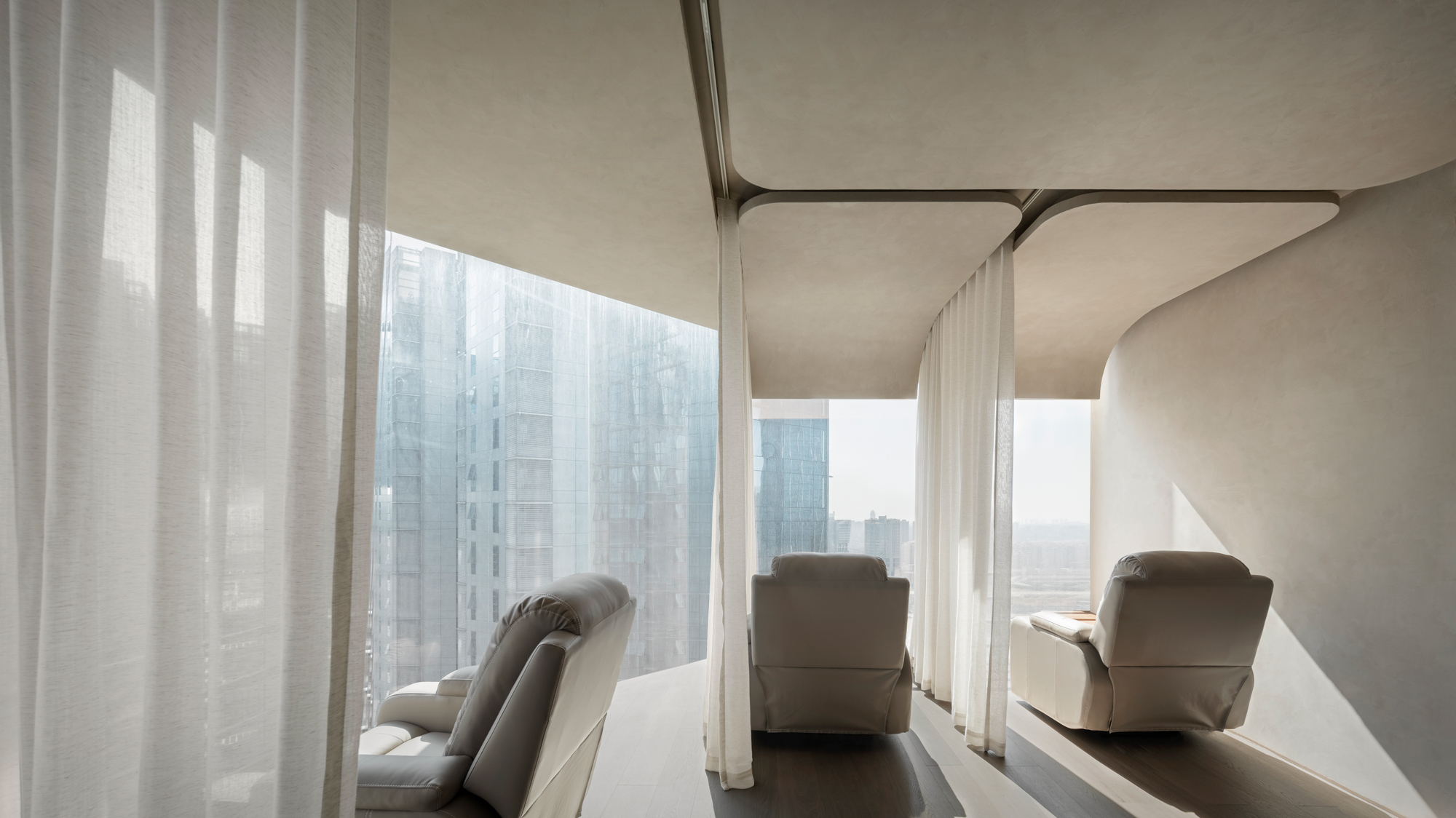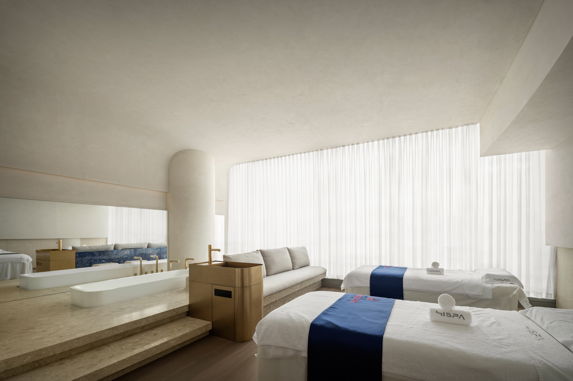 히스파는 CBD 중심부의 오피스 빌딩의 입지에서 감각적인 치유와 스파의 경험을 제공한다. 깊고 푸른 해저를 연상시키는 입구와 백색 소음으로 둘러싸인 복도는 현지의 맥락과 글로벌 상업 트렌드에 따라 ‘쿨’과 ‘젠틀함’을 정의한다. 유리창의 정면은 빛을 굴절시켜 잔물결이 이는 것 같은 감각을 만든다. 입구와 복도, 살롱 구역의 스테인리스 스틸의 천장은 도시의 스카이라인을 반영하는데, 높이가 2.6m에 달하는 갈라진 거울을 통해 도시의 평행세계를 만들며 다차원적인 감각의 경험을 제공한다. 빛과 그림자는 자연석의 거친 질감과 대비되어 섬세하고 예술적인 흐름을 만들었다. 전체적으로 차가워질 수 있는 톤을 보완하기 위해 브랜드의 정체성에서 비롯된 둥글고 포괄적인 요소들을 도입했는데, 밝은 컬러의 곡선형 가구와 은색의 원형 대리석 테이블, 둥근 코너에 마련된 전자 벽난로 등을 통해 편안한 분위기를 제공하고자 했다.