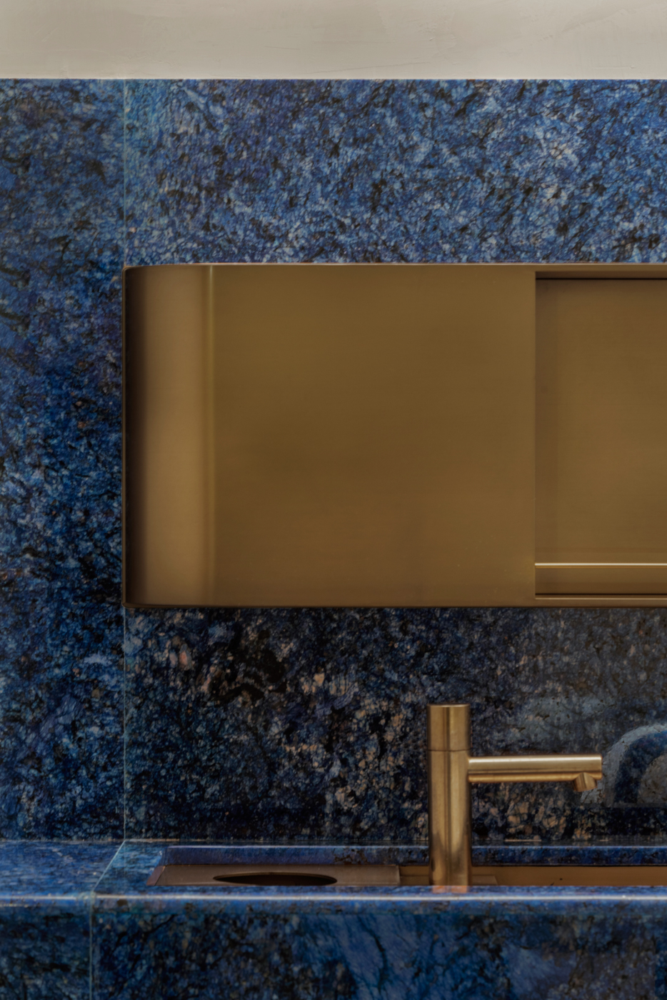 Hispa offers a sensory healing and spa experience in the heart of the CBD, housed within an office building. The entrance, reminiscent of the deep blue ocean, and the hallway surrounded by white noise, define "cool" and "gentleness" in a local context and global commercial trends. The glass facade refracts light, creating the sensation of rippling water. The stainless steel ceilings in the entrance, hallway, and salon area reflect the city's skyline, while a 2.6-meter-high cracked mirror forms a parallel world of the city, offering a multidimensional sensory experience. Light and shadow contrast with the rough texture of natural stone, creating a delicate, artistic flow. To complement what could otherwise be perceived as a cool tone, round and inclusive elements drawn from the brand's identity were introduced. These include brightly colored, curved furniture, a circular silver marble table, and an electronic fireplace tucked into a rounded corner, all designed to provide a warm and comfortable atmosphere.