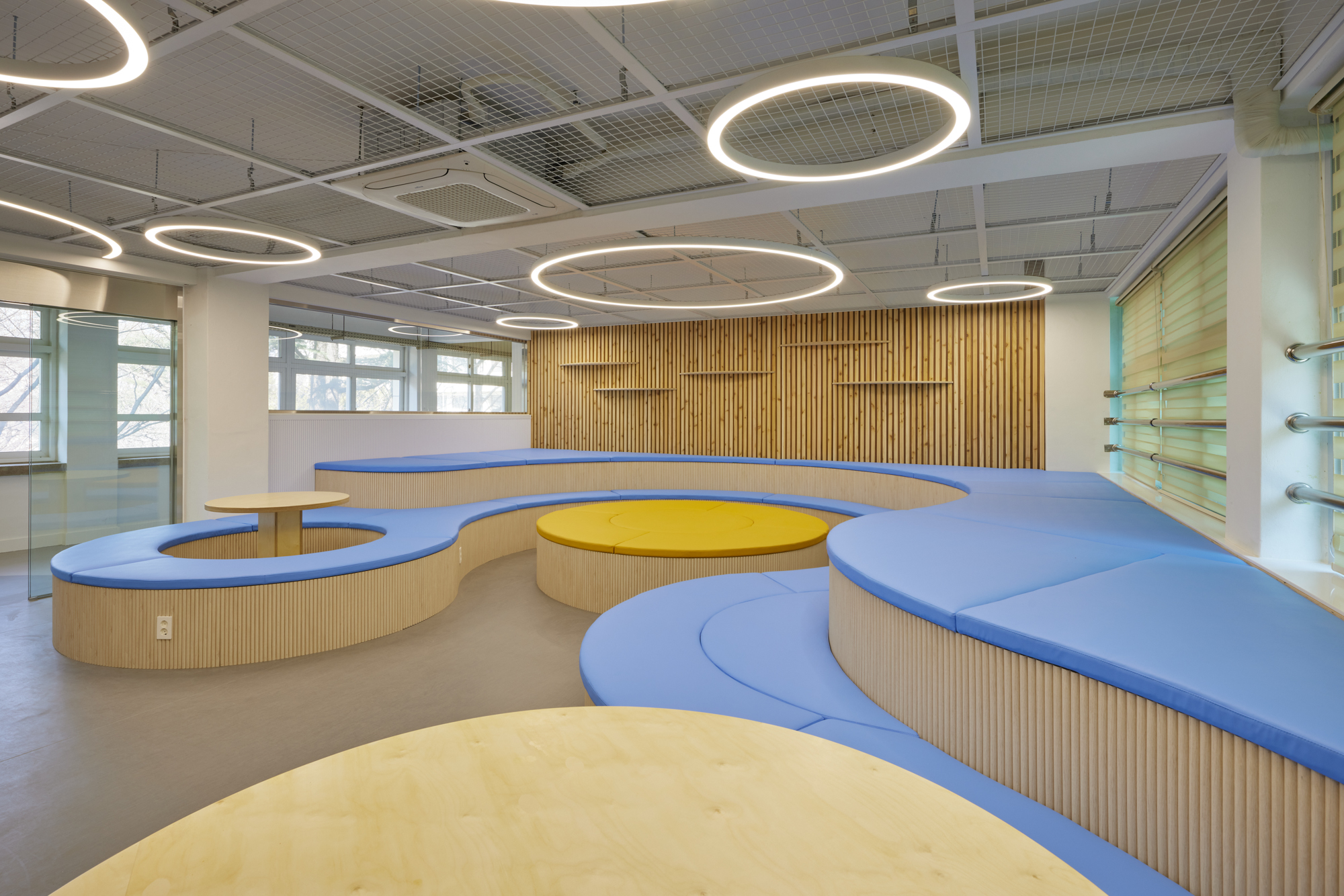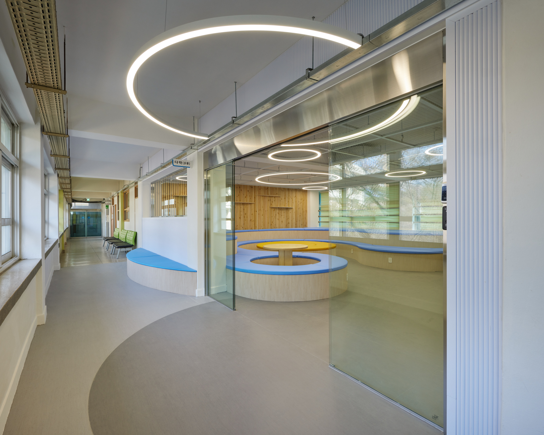 This project involved remodeling an unused classroom at Dongmyeong Girls' High School to create a rest and a waiting area for career counseling for senior students. In response to the students' preference for a softer space with curves rather than a rectangular one, the design incorporated curved two-tier sofas, desks, and floor patterns. The ceiling was updated by removing the existing ceiling materials and using metal mesh and circular lighting to emphasize a clean yet soft spatial feel. The main materials also included warm-toned wood to create a comfortable atmosphere for relaxation. To extend the design language of the classroom interior to the corridor, elements such as circular sofas, lighting, and floor patterns were partially carried over into the space. Openings were expanded, and transparent glass was used for windows and sliding doors to enhance the visual connection.