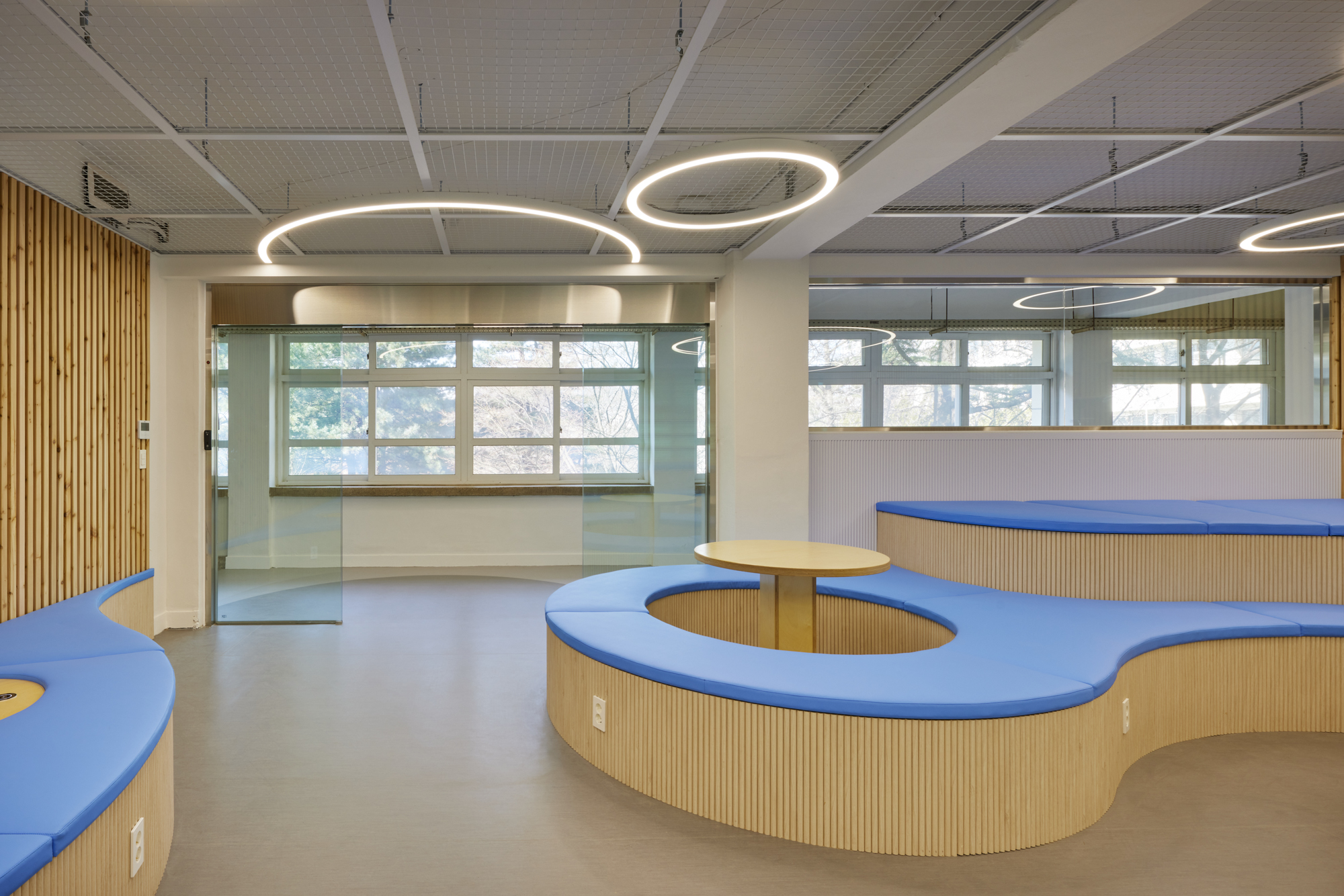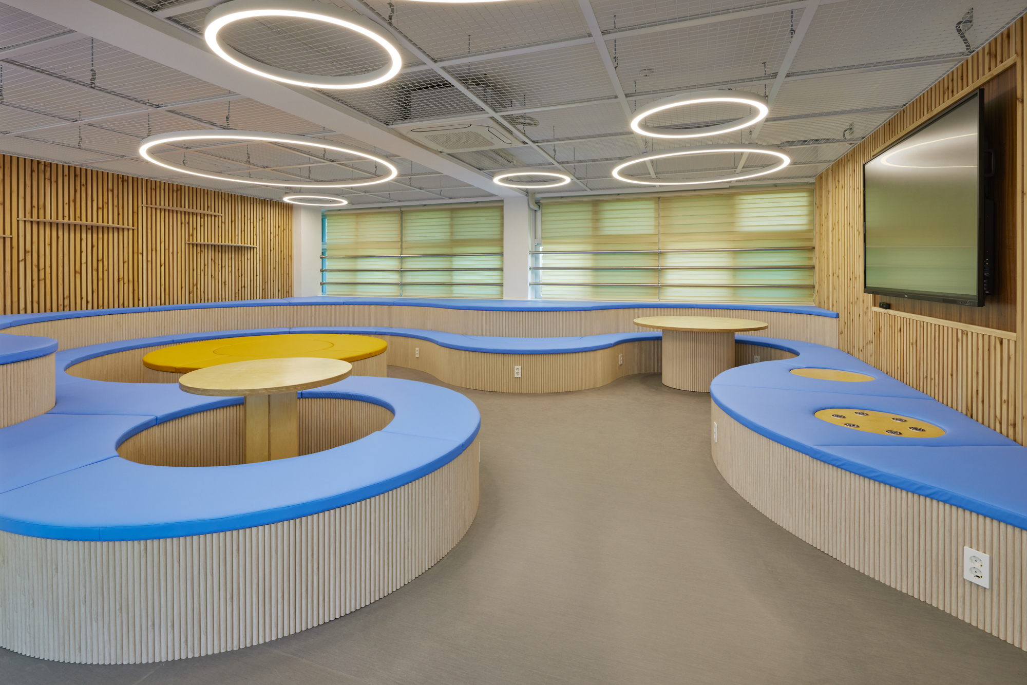 This project involved remodeling an unused classroom at Dongmyeong Girls' High School to create a rest and a waiting area for career counseling for senior students. In response to the students' preference for a softer space with curves rather than a rectangular one, the design incorporated curved two-tier sofas, desks, and floor patterns. The ceiling was updated by removing the existing ceiling materials and using metal mesh and circular lighting to emphasize a clean yet soft spatial feel. The main materials also included warm-toned wood to create a comfortable atmosphere for relaxation. To extend the design language of the classroom interior to the corridor, elements such as circular sofas, lighting, and floor patterns were partially carried over into the space. Openings were expanded, and transparent glass was used for windows and sliding doors to enhance the visual connection.