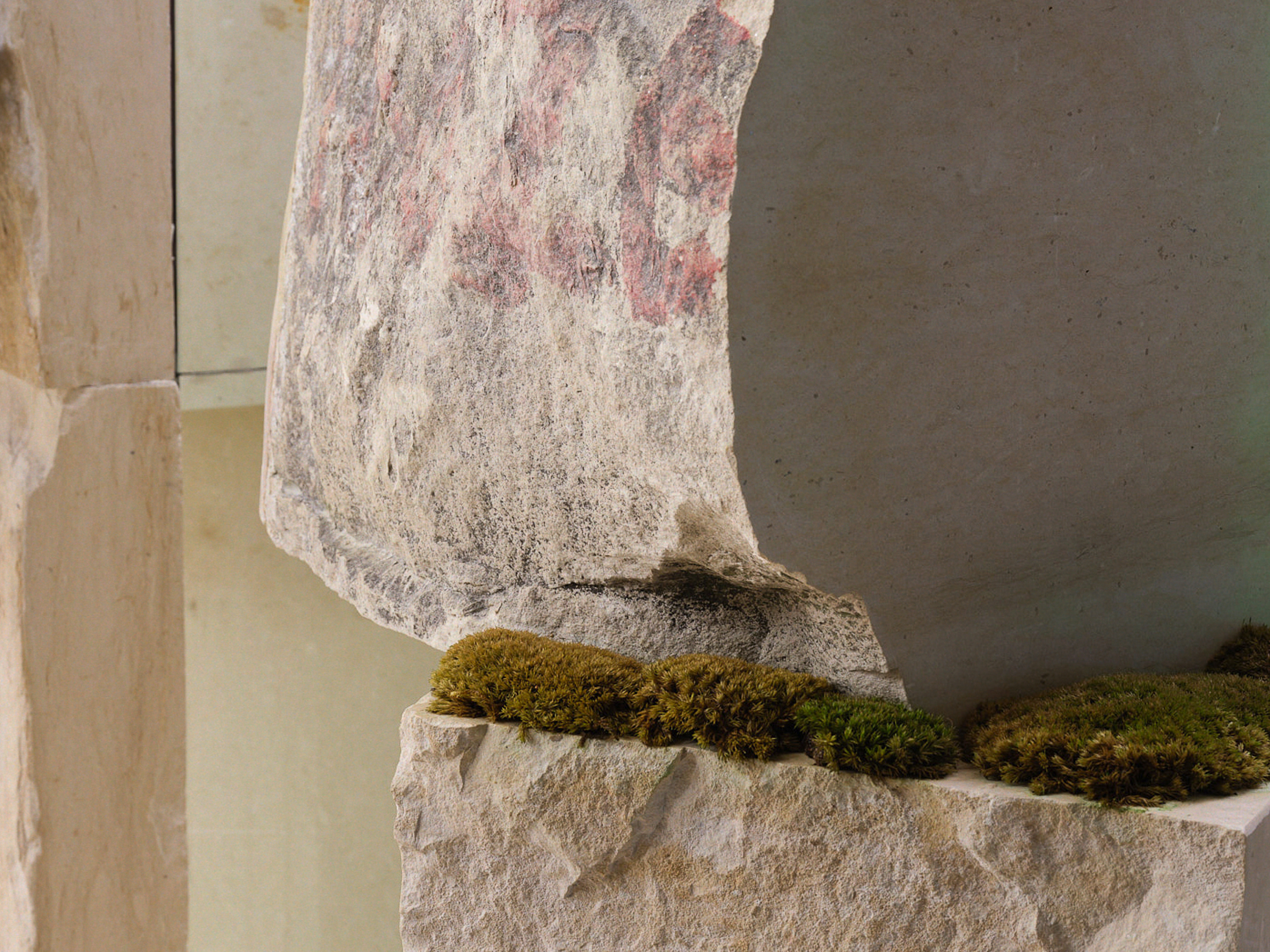 Two stones are stacked in a seemingly unstable status to serve as the booth at the entrance. The upper stone is hollowed out a four-story-stand cavity in the middle for display. Meanwhile, a set of sophisticated installation is suspended on steel cables above the booth to display the devices of extraction and purification. The shape of the overall installation fits the shape of the stone hollow below, as if the devices are excavated from the stone as a whole. The solid and primitive stone booth contrasts the graceful and laboratory-like installation, and together convey the brand spirit about the power from nature but more than nature. During the process of stone stacking, small irregular platforms are formed due to uneven stone thickness, where moss is planted to make the walls like natural rocks. Meanwhile, stone surfaces with artificial marks and natural traces, ragged bark textures, rusty ironworks altogether tell stories about time and nature, which in contrast with exquisite craftsmanship such as polished surfaces of stones and floors, transparent glass and glossy steel cables. The contrast and integration convey 15 ESSENTIALS’ exploration and pursuit of the power beyond nature.
