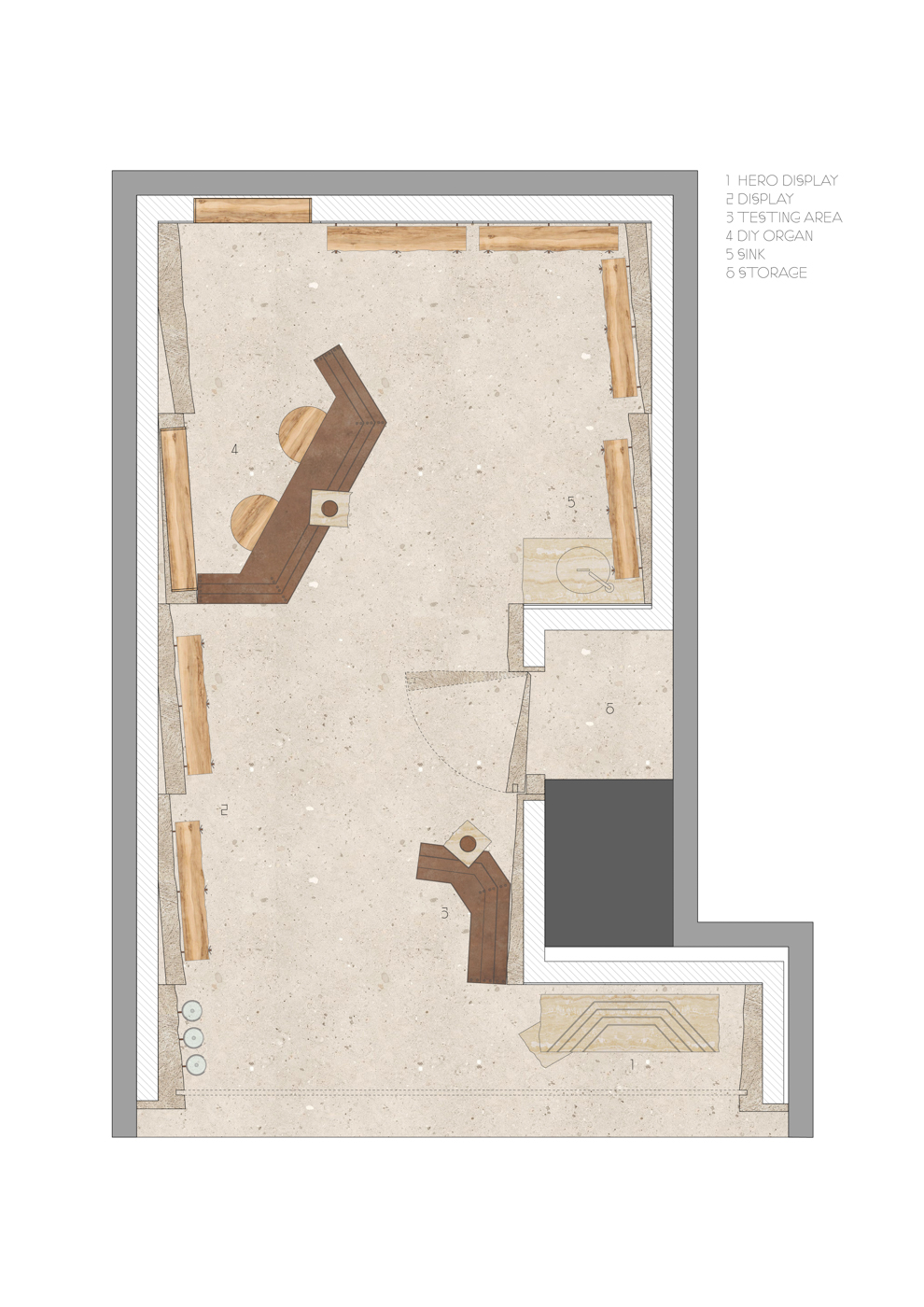 dongqi Design designed the first space in Shanghai for 15 ESSENTIALS. It exhibits aromatic culture, displays essential oil products, provides a fragrance experience,and creates a soothing atmosphere of aromatherapy for the public at the same time. The concept comes from nature. The natural stone walls are made of seven pieces of roughly 3-meter-long raw stones selected by the designer from the quarry. As the in-between stage before entering the market, raw stones remain textures and marks of mining and natural erosion on the surfaces. These artificial and natural signs are proofs of the "socialization" of stones and have been preserved by the designer. The raw materials are only cut and used near the raw surface, and are arranged on the walls at certain angle. The rough texture of the raw stone faces the main space, while contrasts the polished cut surface on the other side.