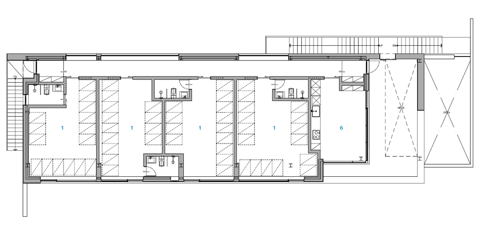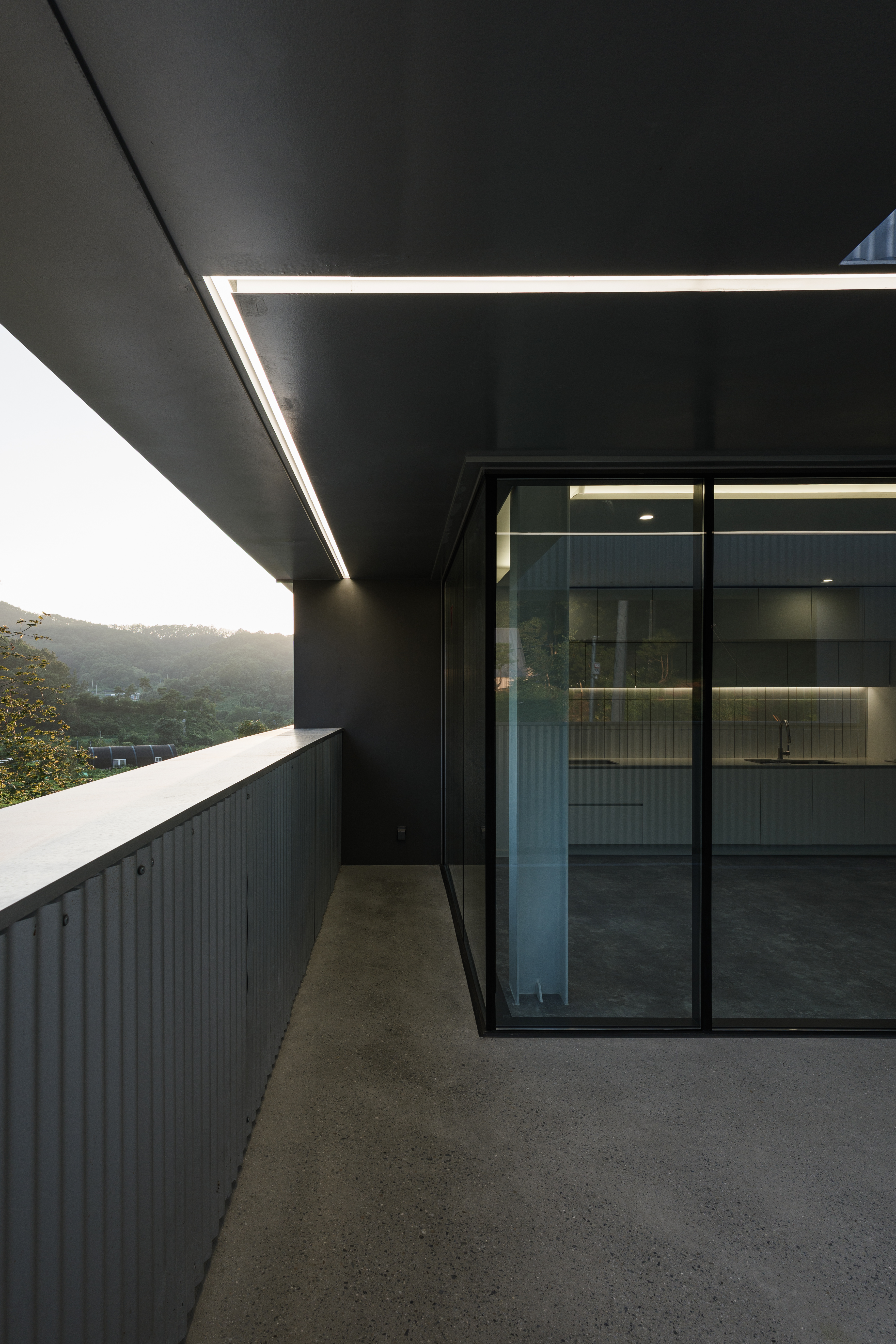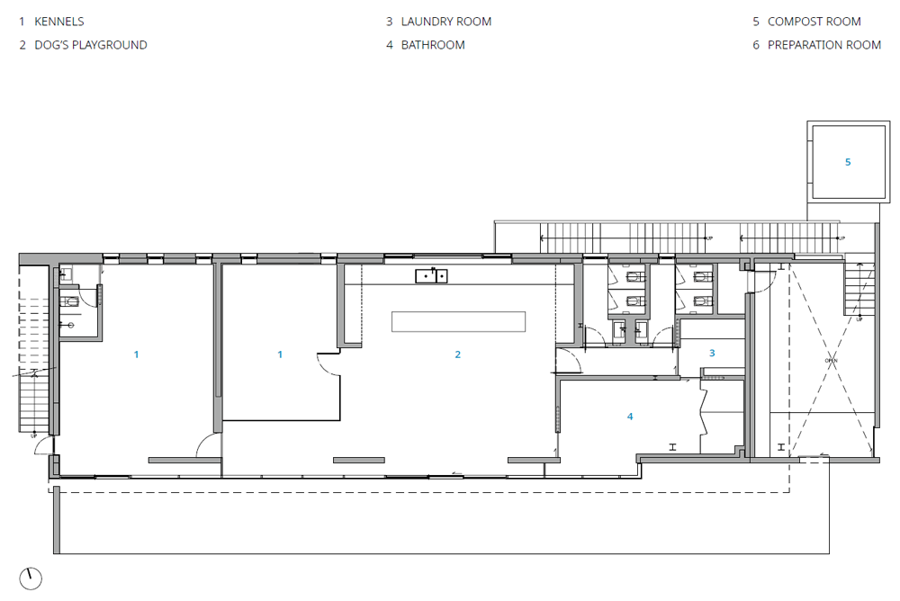 두 개의 층으로 구분된 공간은 외부 활동이 많은 반려견을 위해 층별로 각각 진입할 수 있도록 구성했다. 부족한 공간은 일부 증축했고, 대지의 경계에 나무 담장을 설치하여 주변의 시야에 간섭 없이 반려견의 산책과 교육 등 외부 활동을 즐길 수 있다. 실내는 운동 공간, 주방, 목욕실, 세탁실, 화장실 등의 공용 공간, 어린 강아지들과 임신한 반려견을 위한 공간으로 구성된다. 2층은 중정을 지나 외부 계단으로 접근할 수 있다. 주변 풍경이 파노라마로 들어오는 외부 테라스를 거쳐 실내로 들어가면 주방과 성견을 위한 네 개의 공간으로 구분되어 있다. 마감재는 유리, 콘크리트, 골강판, 목재의 네 가지 재료를 사용하여 층별 공간 구성과 기능을 직관적으로 구분할 수 있게 했다. 외부 활동이 많은 1층은 감시와 관리의 편의성을 고려하여 전체적으로 창으로 계획했고, 2층은 사람 눈높이에 맞춘 가로로 긴 창을 통해 채광과 주변 조망을 확보했다.