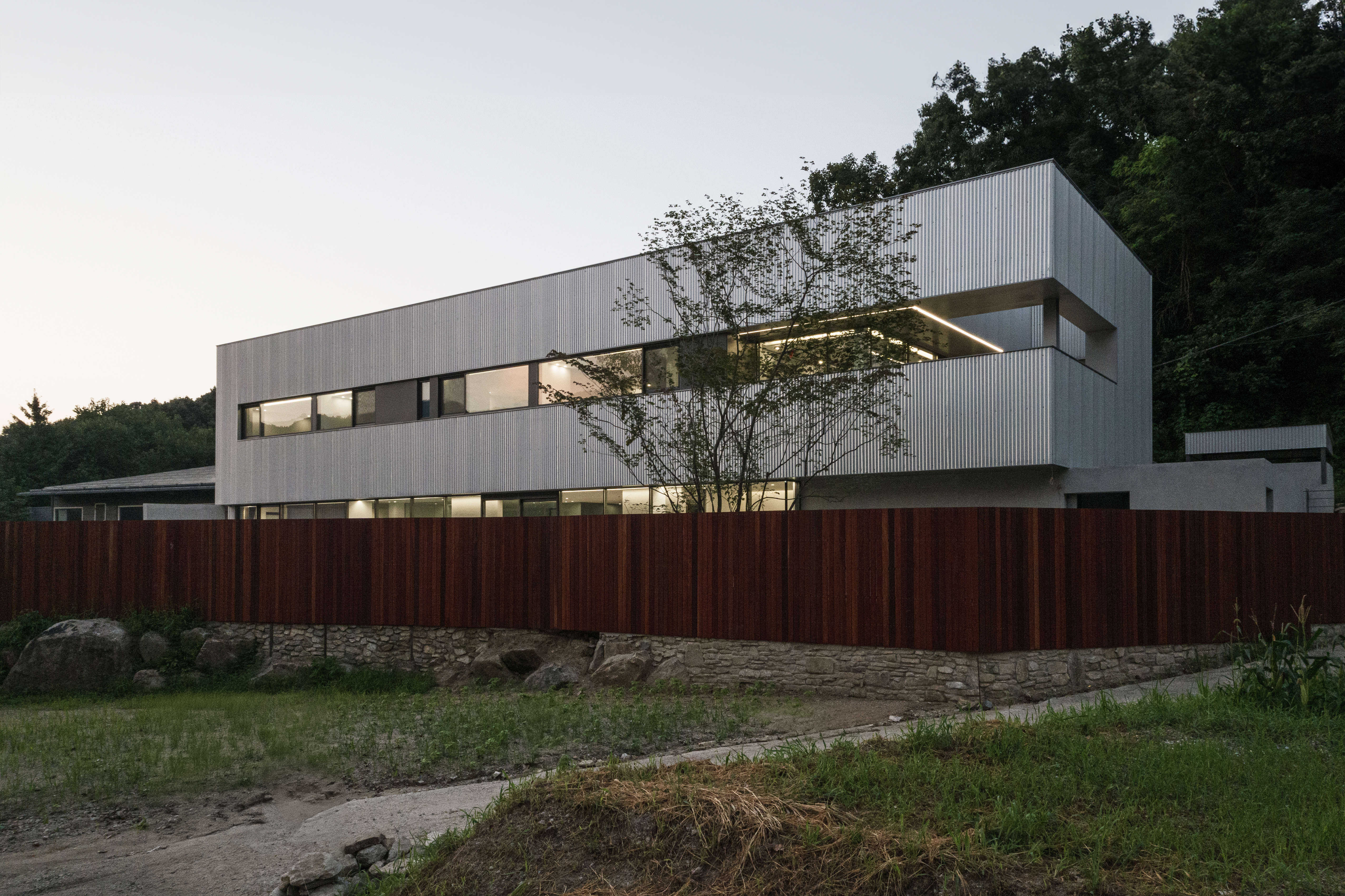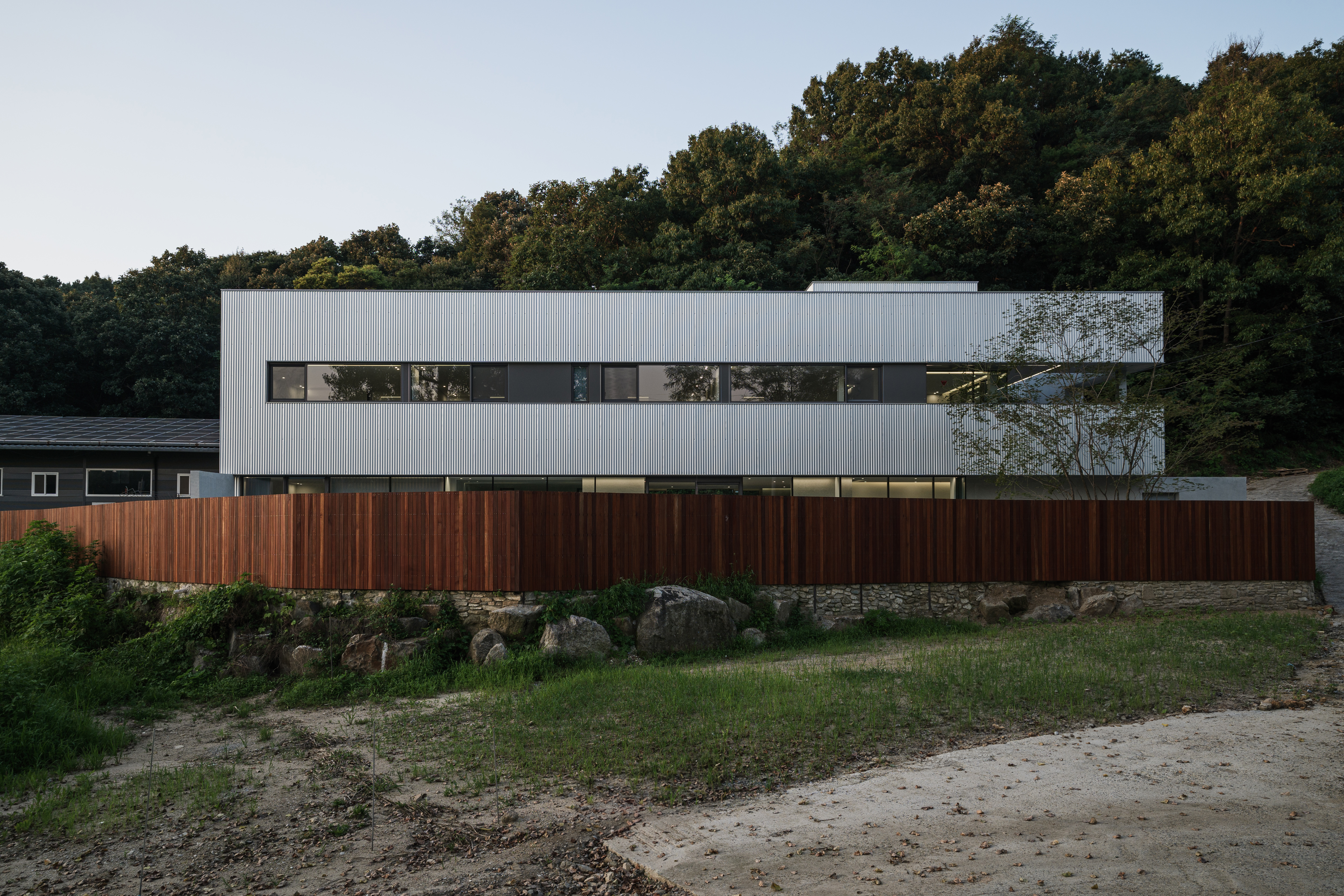은빛 숲은 반려견을 위한 공간으로 기존 건물을 증축한 프로젝트다. 양평군 지평면 시내에서 멀지 않은 마을길을 따라 가면 숲과 맞닿은 땅이 나타난다. 이곳에 단정한 은빛 건축물이 지어졌다. 낮은 석축과 사람의 키만한 나무 담장이 주변의 짙은 신록과 어우러지면서 주변 풍경으로 건축물이 스며든다. 기존 건물은 다섯 개의 공간으로 구분되어 각 공간을 외부로만 이동해야 하는 불편한 구조였고, 부실한 시공으로 2층 지붕 방수가 제대로 되지 않아 1층 실내로 고인 물이 떨어지는 상황이었다. 기존 공간에서 부족한 부분을 최대한 빨리 보완하고 공사기간을 단축할 수 있도록 철골조로 시공되었다.