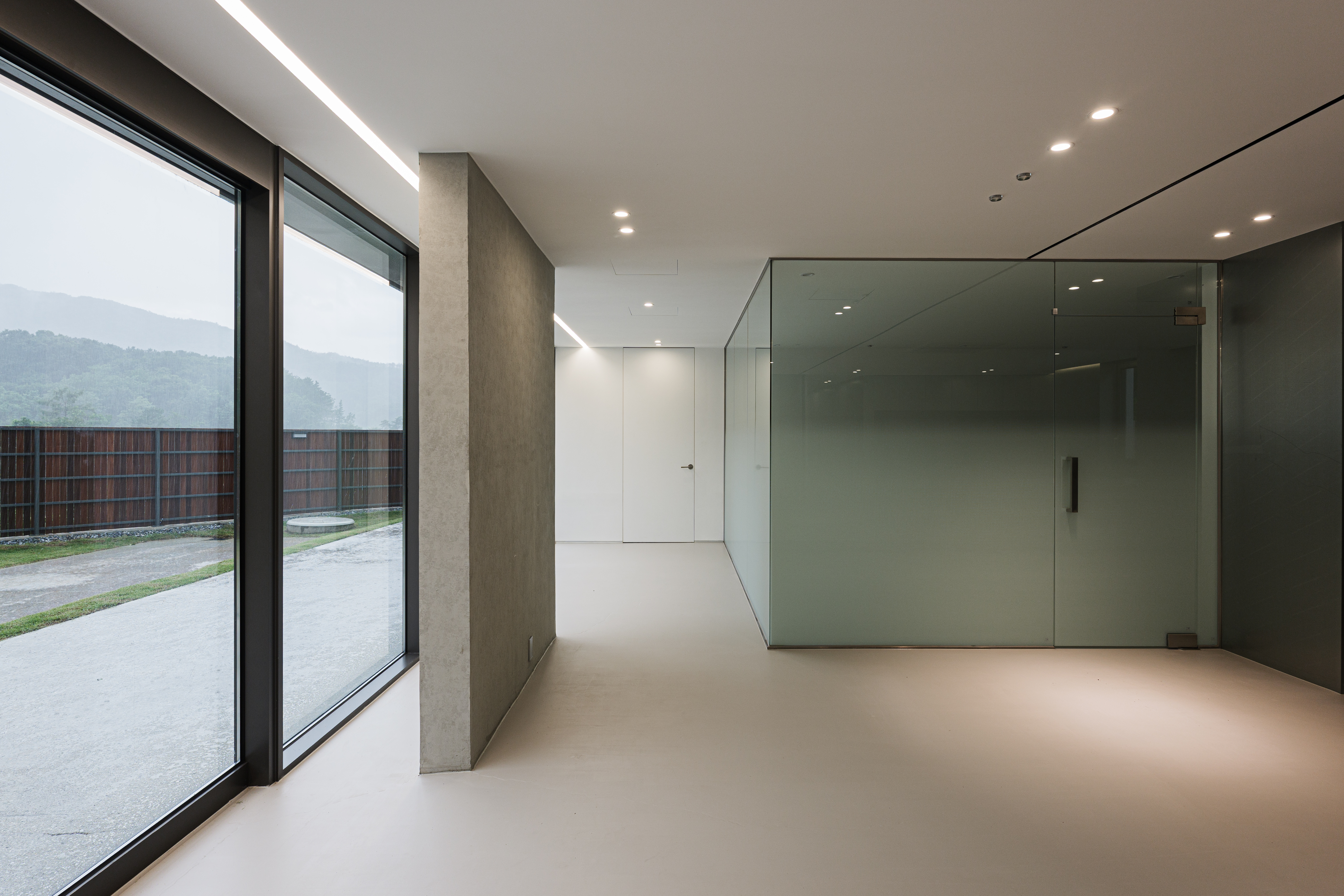 두 개의 층으로 구분된 공간은 외부 활동이 많은 반려견을 위해 층별로 각각 진입할 수 있도록 구성했다. 부족한 공간은 일부 증축했고, 대지의 경계에 나무 담장을 설치하여 주변의 시야에 간섭 없이 반려견의 산책과 교육 등 외부 활동을 즐길 수 있다. 실내는 운동 공간, 주방, 목욕실, 세탁실, 화장실 등의 공용 공간, 어린 강아지들과 임신한 반려견을 위한 공간으로 구성된다. 2층은 중정을 지나 외부 계단으로 접근할 수 있다. 주변 풍경이 파노라마로 들어오는 외부 테라스를 거쳐 실내로 들어가면 주방과 성견을 위한 네 개의 공간으로 구분되어 있다. 마감재는 유리, 콘크리트, 골강판, 목재의 네 가지 재료를 사용하여 층별 공간 구성과 기능을 직관적으로 구분할 수 있게 했다. 외부 활동이 많은 1층은 감시와 관리의 편의성을 고려하여 전체적으로 창으로 계획했고, 2층은 사람 눈높이에 맞춘 가로로 긴 창을 통해 채광과 주변 조망을 확보했다.