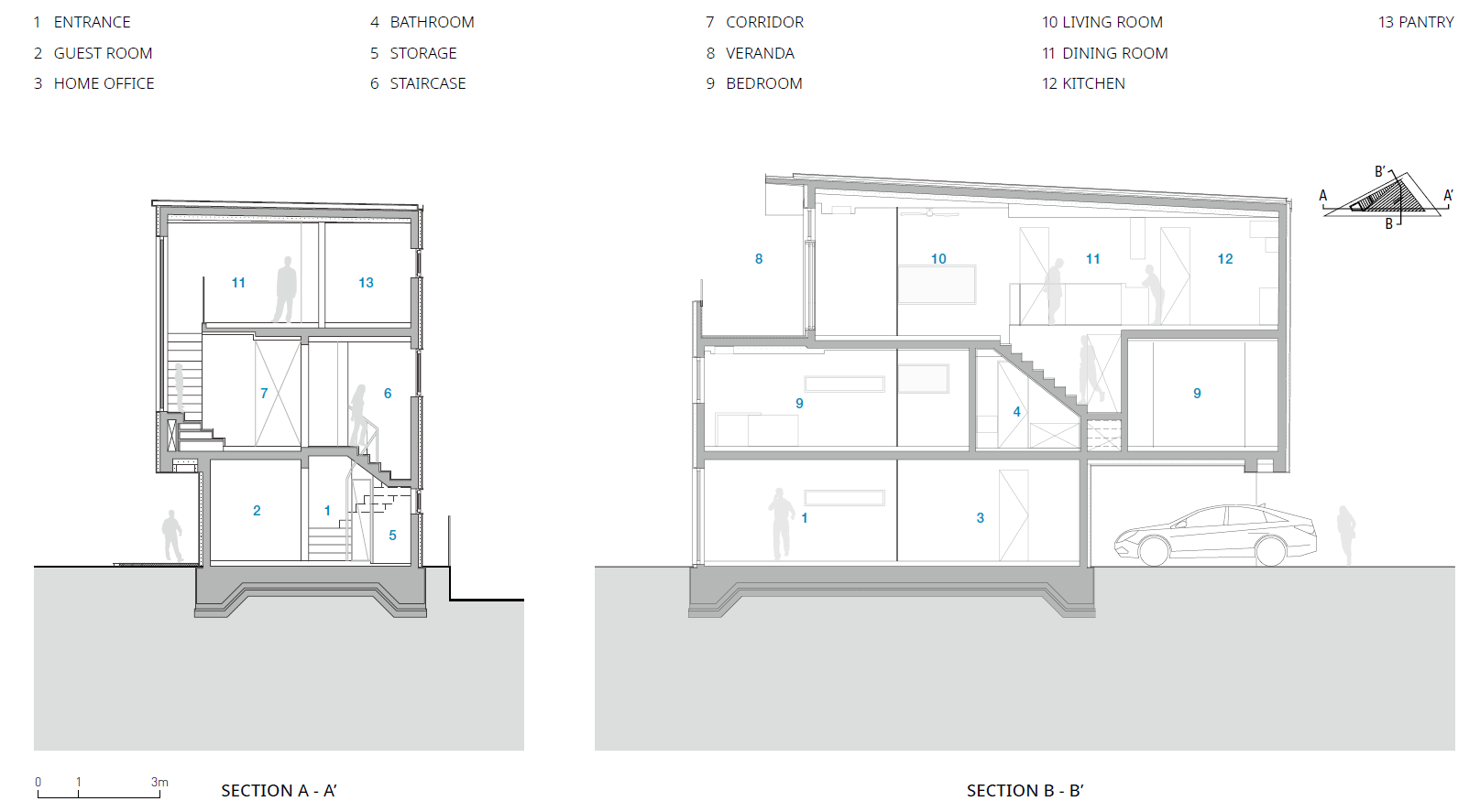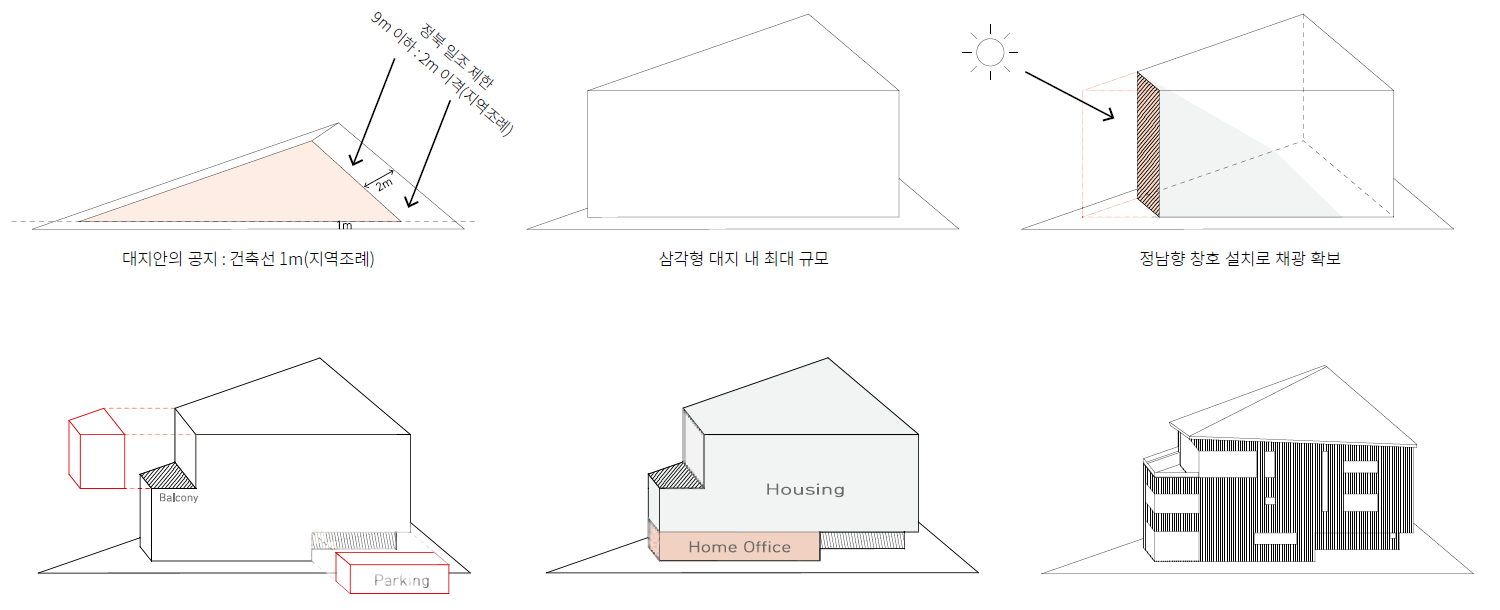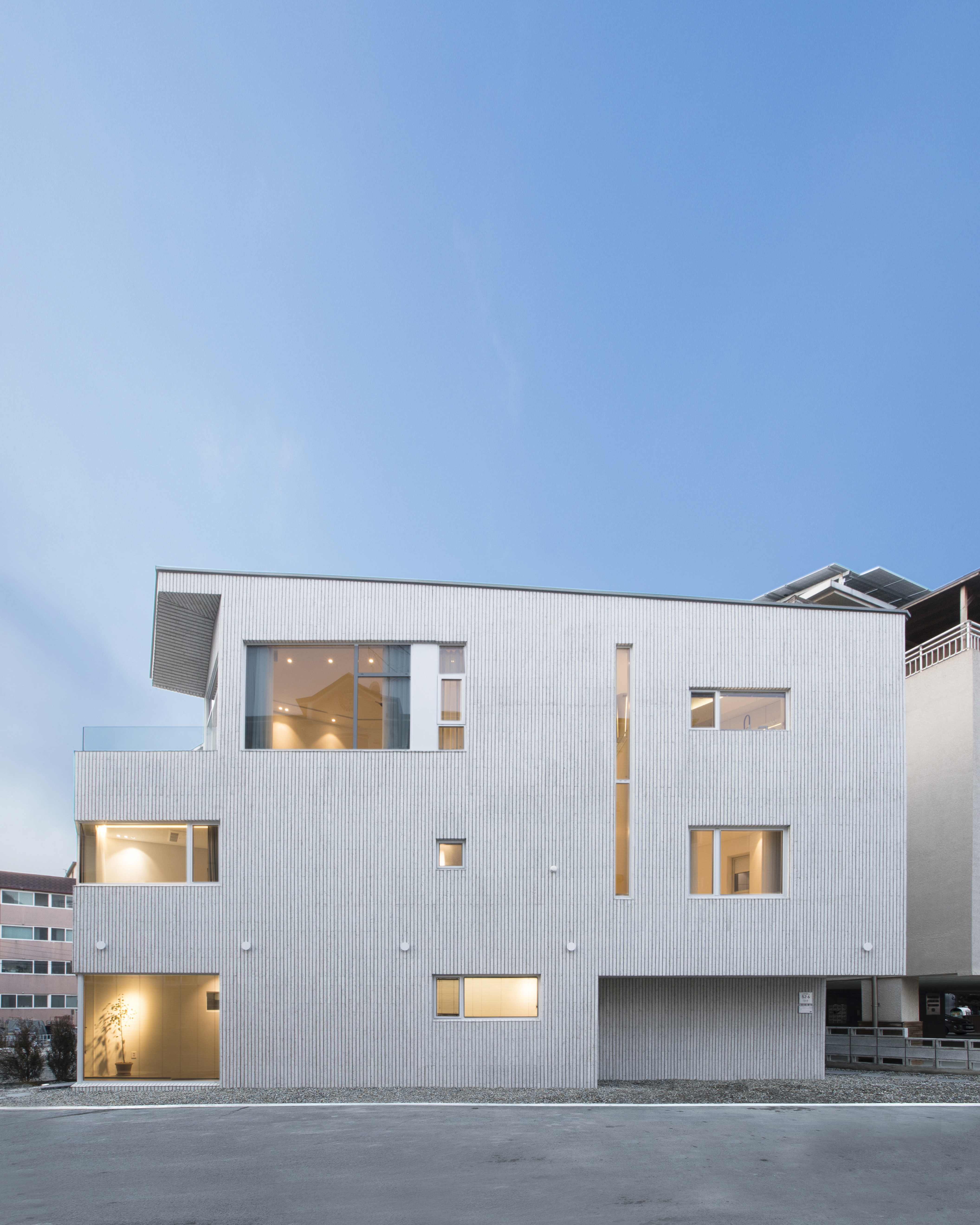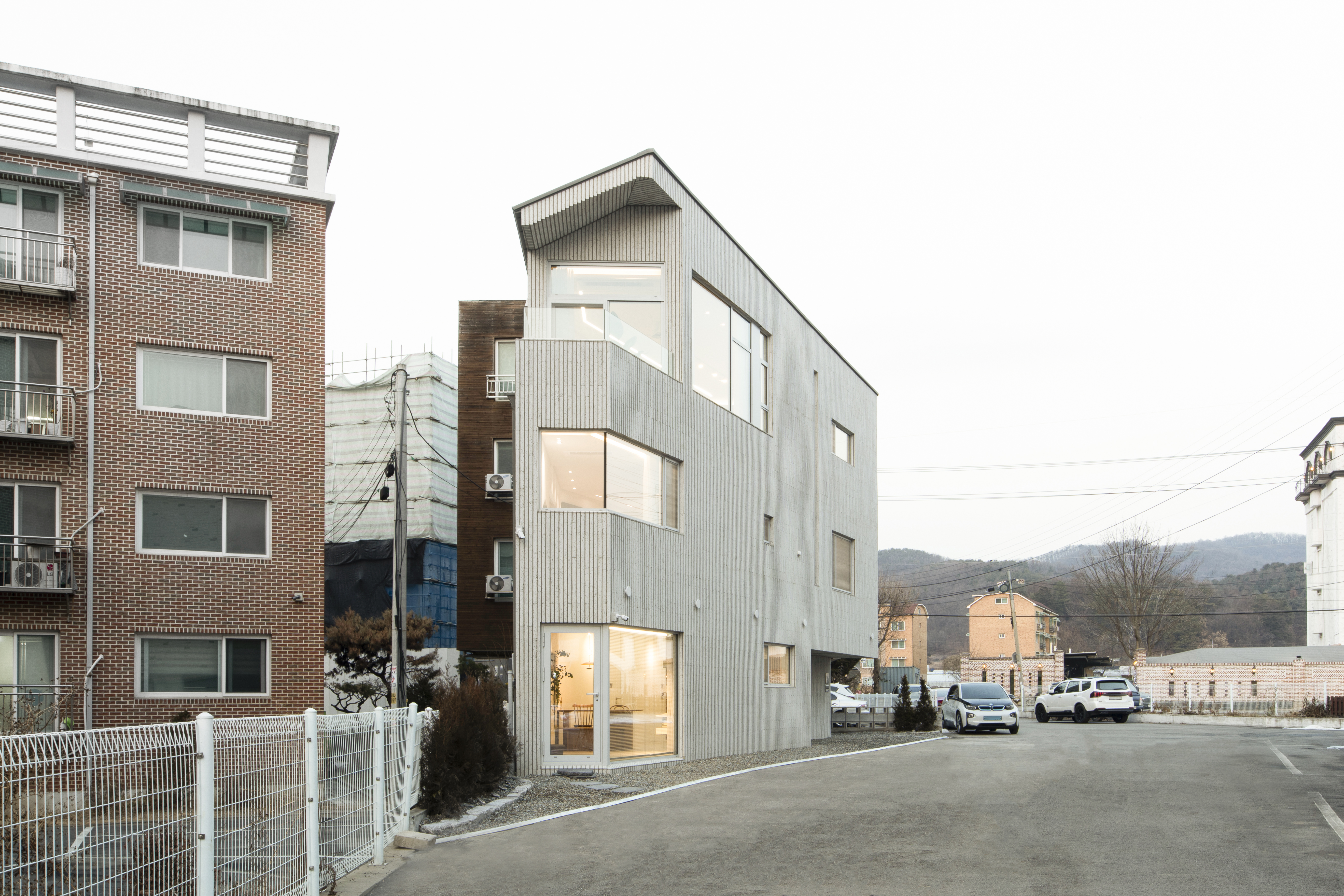 모노롱브릭 타일을 세로로 시공하여 마감된 외벽이 건축물을 규모에 비해 길고 높아 보이도록 만든다. 모든 벽면과 처마는 같은 마감재로 통일하여 온전한 매스로 느껴지도록 되어 있다. 1층의 홈오피스 공간은 원목 간살 슬라이딩 도어가 공간을 구분한다. 하나의 넓은 공간으로 사용하기도 하고 때로는 룸으로 구분하여 게스트룸 공간으로 이용할 수도 있다. 2층에는 안방과 욕실, 옷방과 세탁실이 있다. 욕실과 세탁실을 지나면 남쪽으로 부부의 침실이 배치되어 있다. 침실의 남측 창문으로는 사시사철 푸른 소나무가 보이고 하루종일 자연광이 들어온다. 주 생활 공간인 거실과 주방은 3층에 있다. 이는 1층의 홈오피스와 거리를 두어 일과 일상의 경계를 명확하게 구분한다. 건축가는 추후 1층을 근린생활시설로 용도변경 할 수 있도록 별도 출입구도 마련하고 수도, 전기 등 설비도 2, 3층과 분리했다.