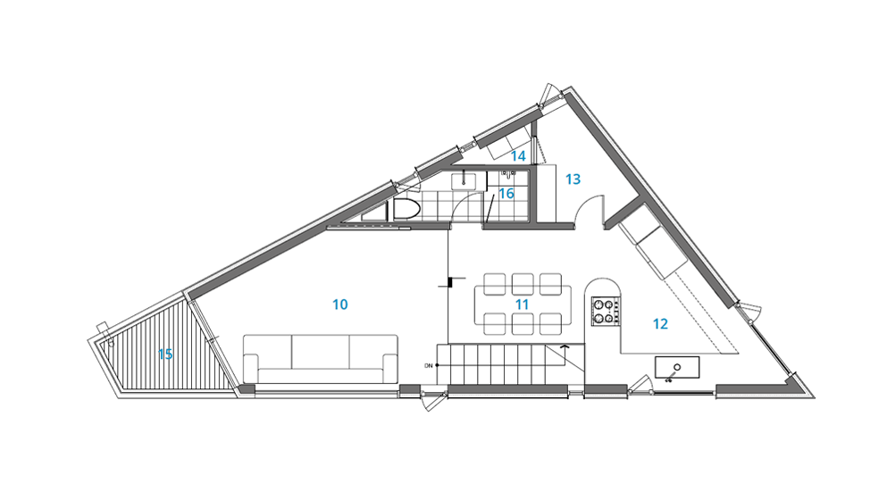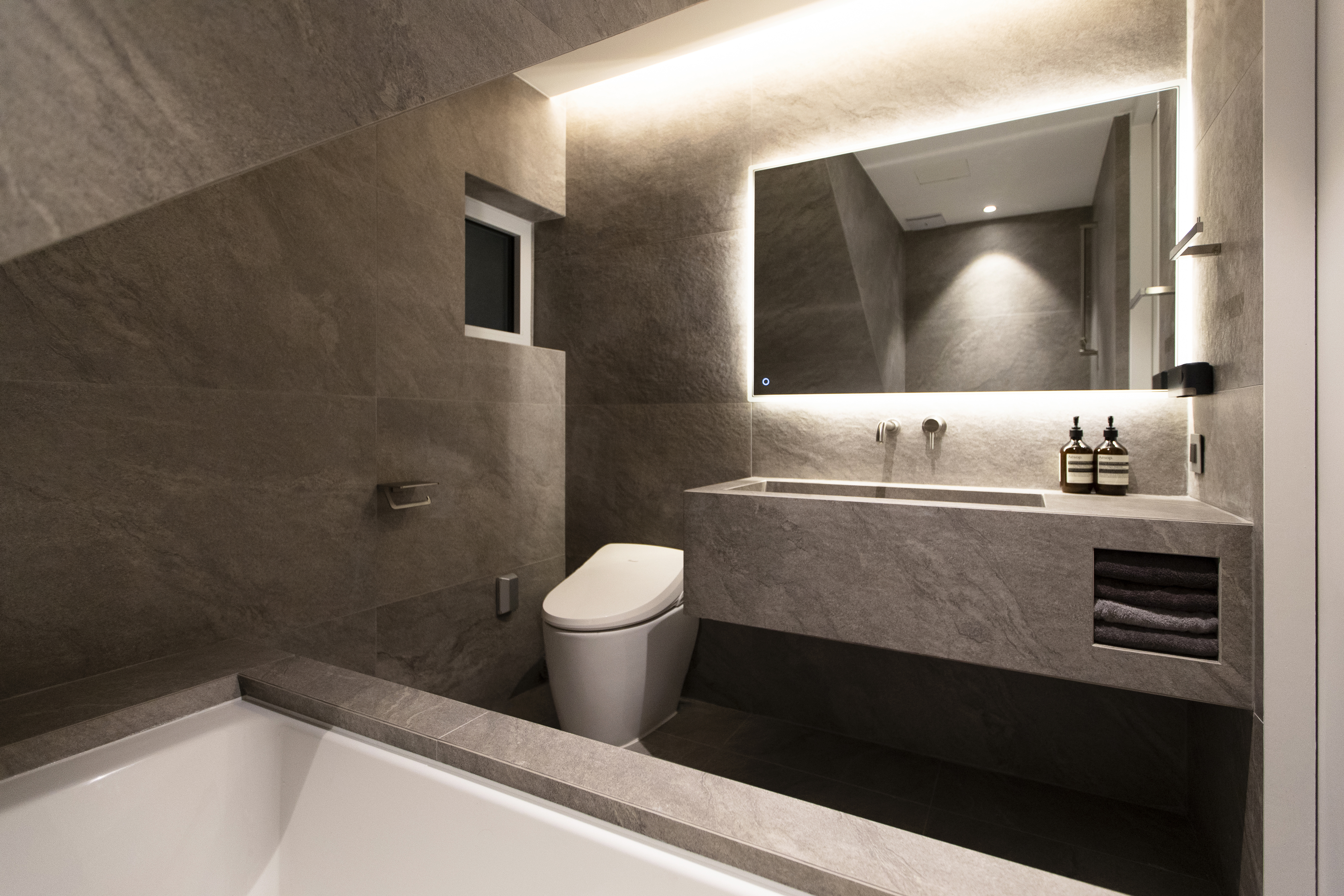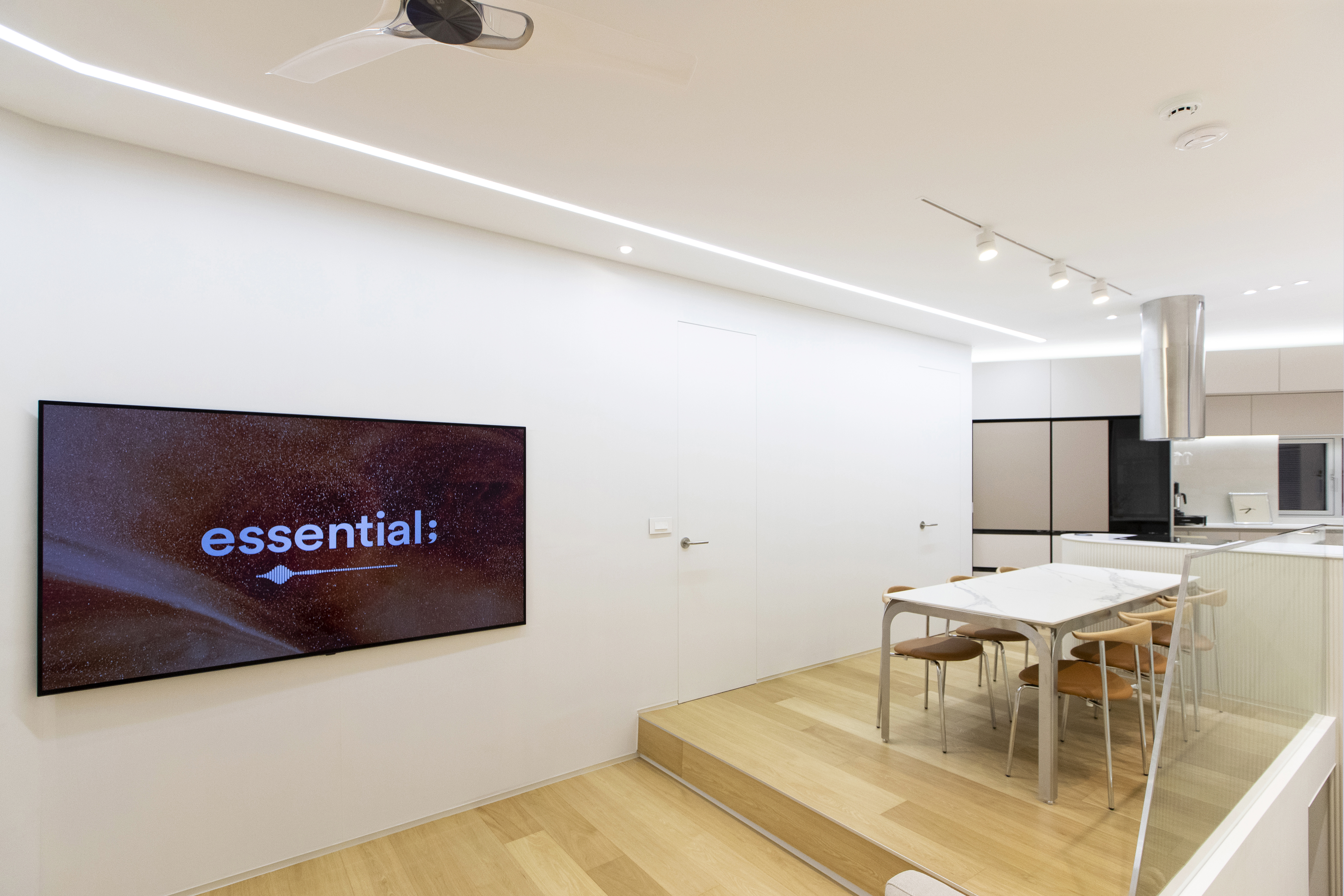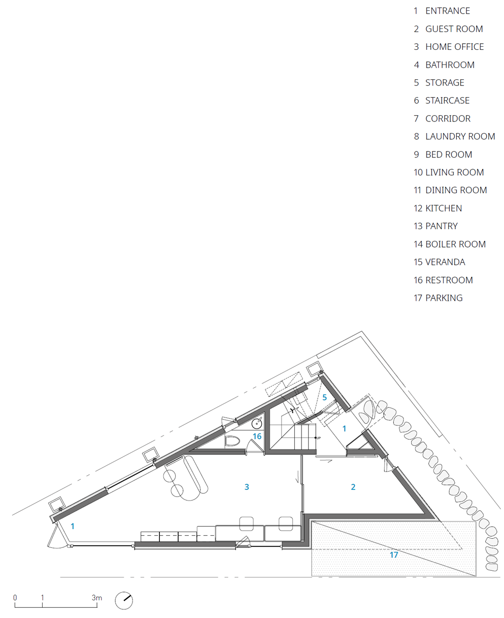 모노롱브릭 타일을 세로로 시공하여 마감된 외벽이 건축물을 규모에 비해 길고 높아 보이도록 만든다. 모든 벽면과 처마는 같은 마감재로 통일하여 온전한 매스로 느껴지도록 되어 있다. 1층의 홈오피스 공간은 원목 간살 슬라이딩 도어가 공간을 구분한다. 하나의 넓은 공간으로 사용하기도 하고 때로는 룸으로 구분하여 게스트룸 공간으로 이용할 수도 있다. 2층에는 안방과 욕실, 옷방과 세탁실이 있다. 욕실과 세탁실을 지나면 남쪽으로 부부의 침실이 배치되어 있다. 침실의 남측 창문으로는 사시사철 푸른 소나무가 보이고 하루종일 자연광이 들어온다. 주 생활 공간인 거실과 주방은 3층에 있다. 이는 1층의 홈오피스와 거리를 두어 일과 일상의 경계를 명확하게 구분한다. 건축가는 추후 1층을 근린생활시설로 용도변경 할 수 있도록 별도 출입구도 마련하고 수도, 전기 등 설비도 2, 3층과 분리했다.